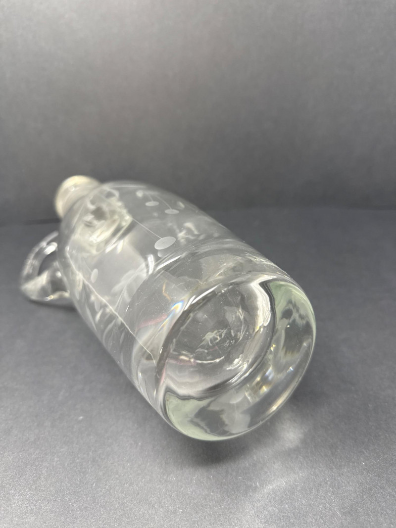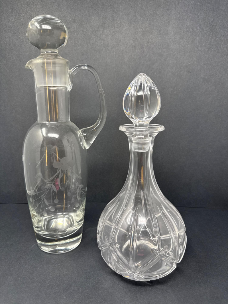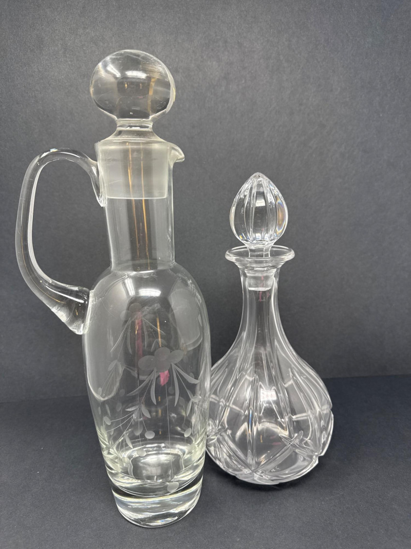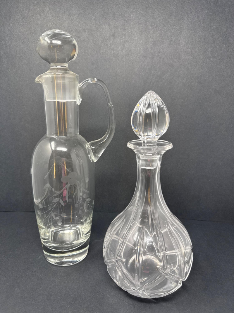 This lot features two elegant clear glass decanters, each with a distinct silhouette and decorative style: Vintage Etched Glass Decanter