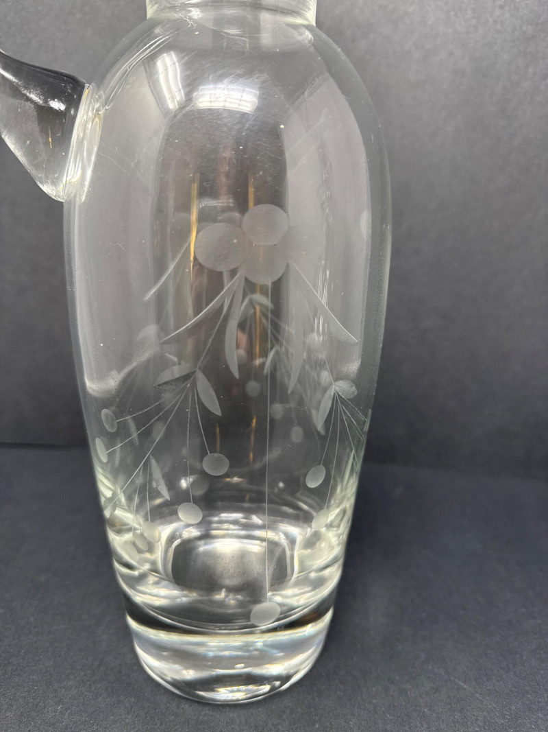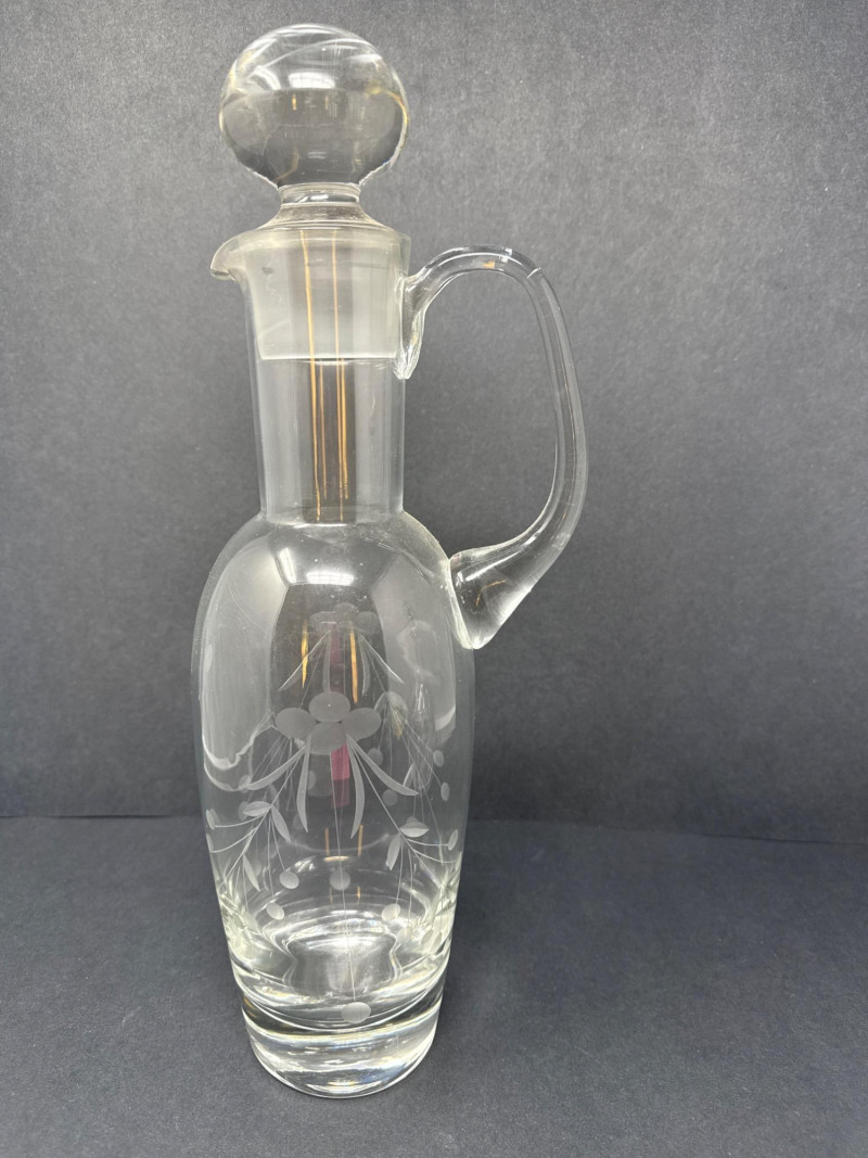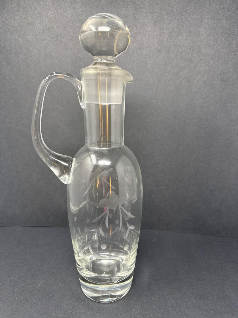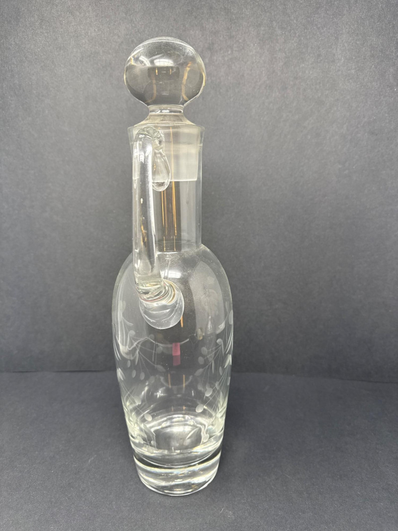 Tall and graceful with an applied handle, rounded stopper, and etched floral and foliate motifs. Designed with a narrow neck, pouring spout, and smooth base. Ideal for serving wine, water, or as a decorative accent. Likely Gorham Crystal “Lady Anne” Decanter