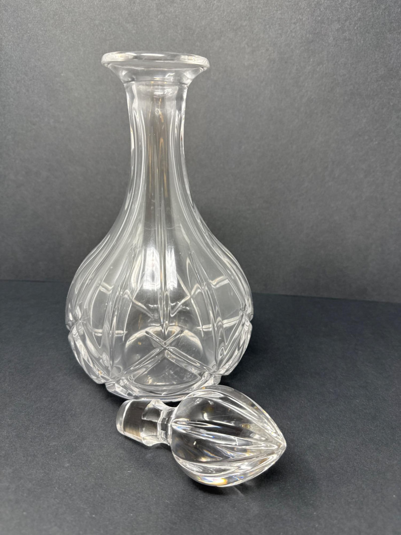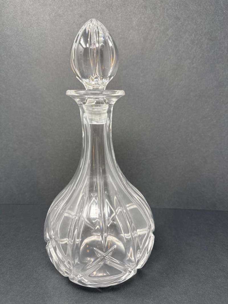 Bulbous cut crystal form with vertical fluted panels and a diamond-cut base. Includes a matching teardrop-shaped stopper. Closely resembles Gorham’s discontinued “Lady Anne” pattern, known for its clarity and refined crosscut design. Believed to be Czech-made lead crystal. Both pieces present beautifully and offer versatile use for barware, tabletop service, or display. Measurements Etched glass decanter: approx. 16 in H Crystal decanter (likely Gorham): approx. 12.5 in H