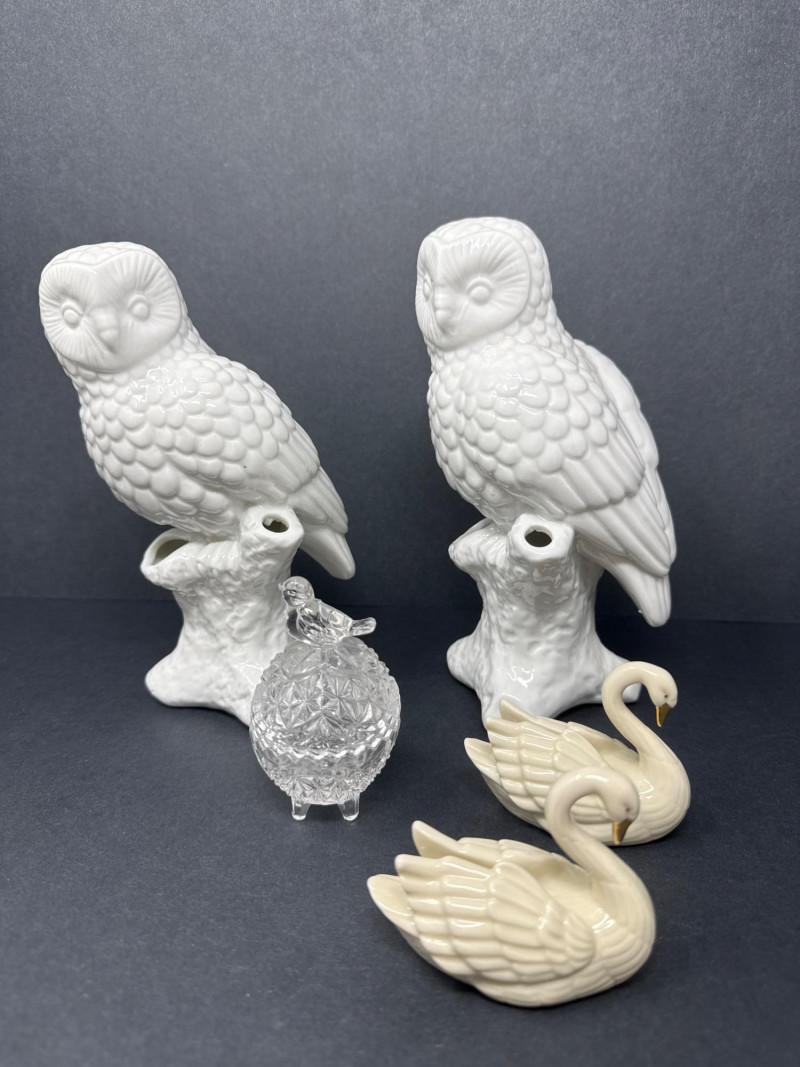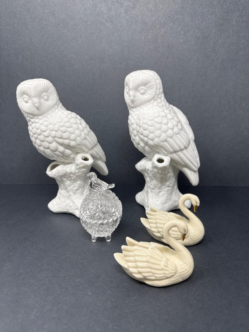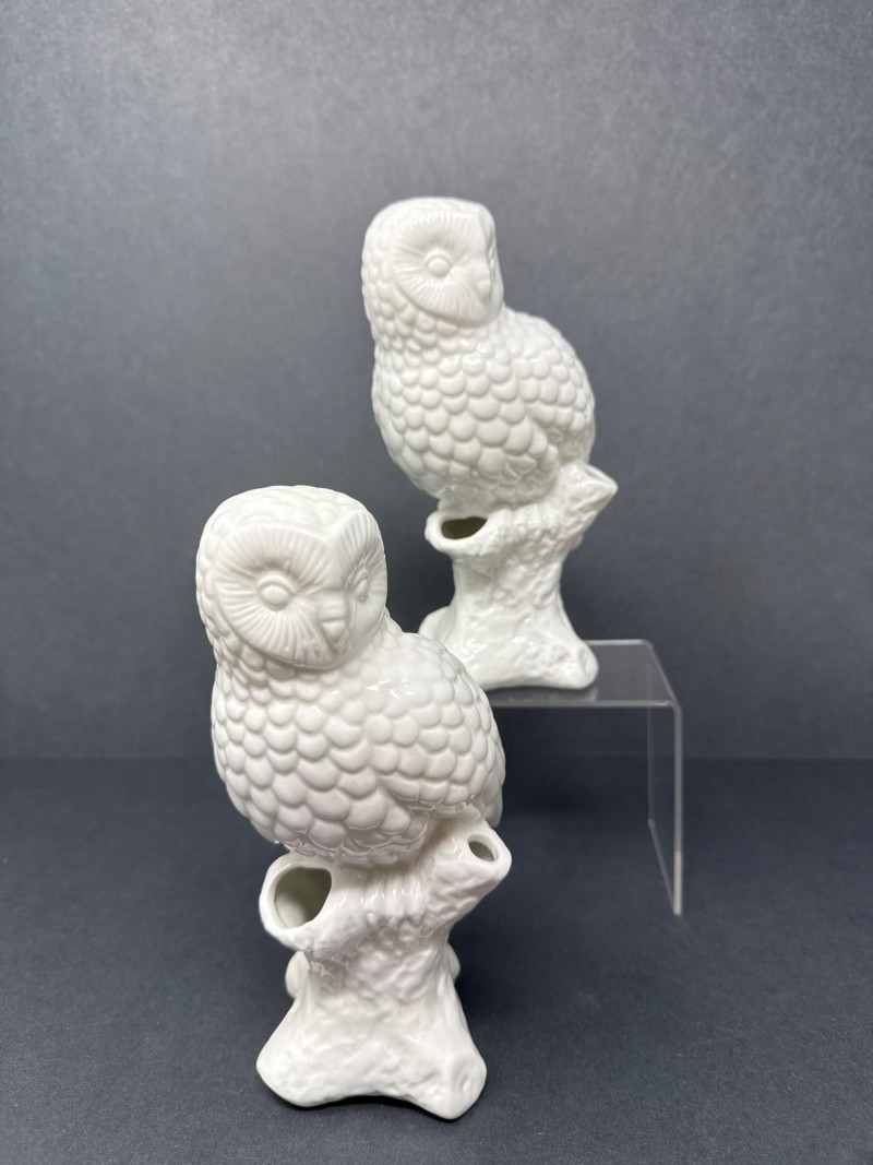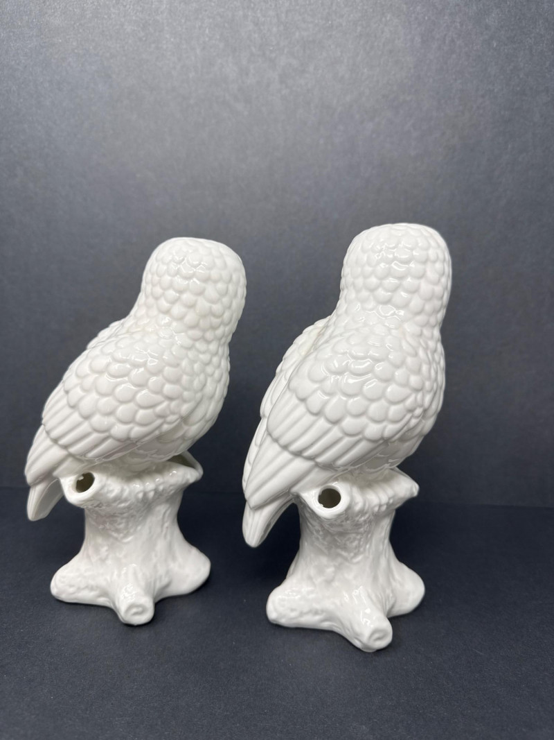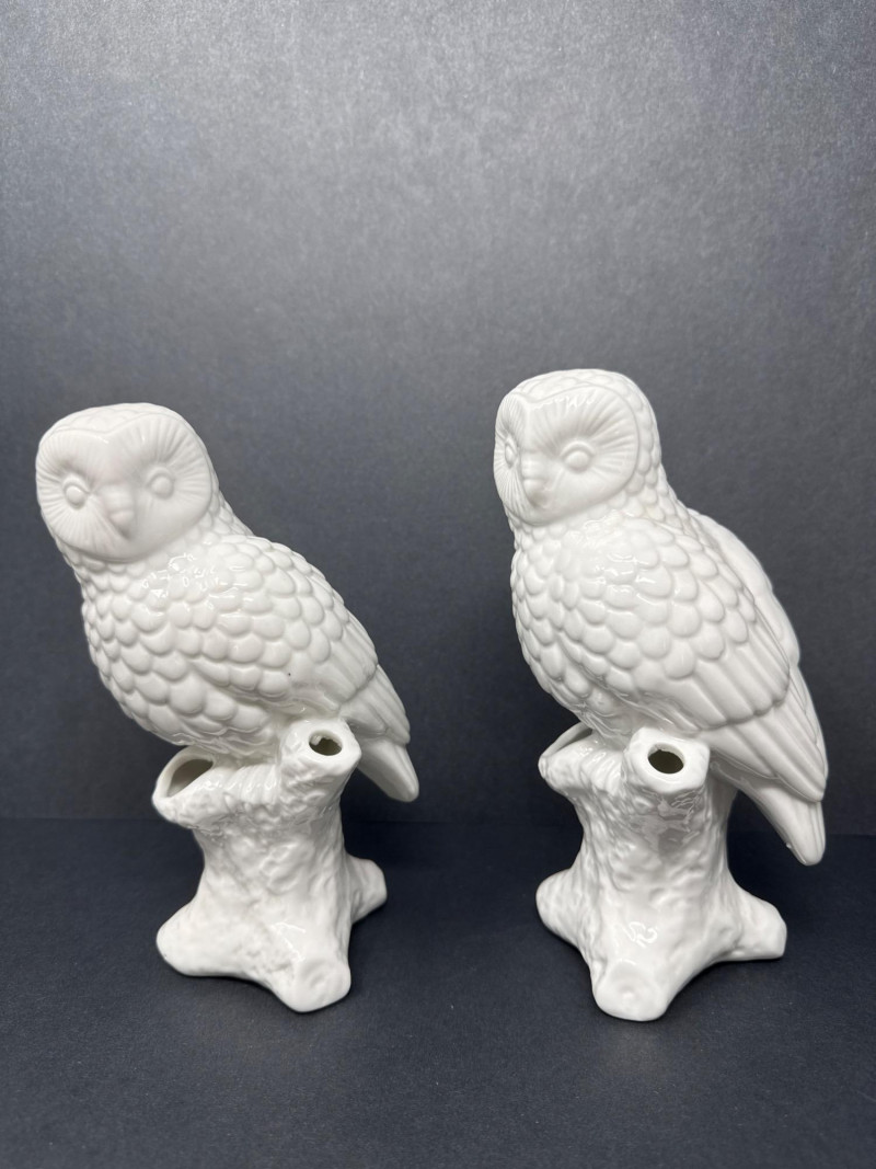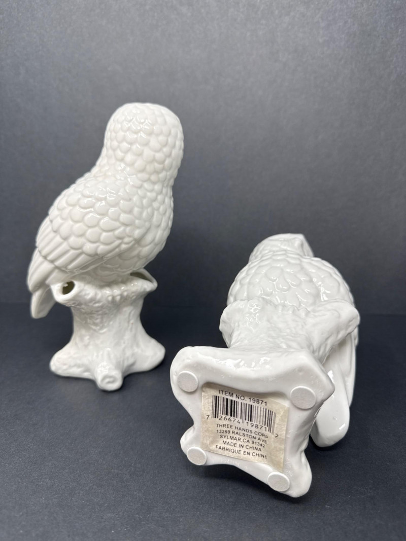Design Features: Glossy white owls perched on tree stump bases Feathered surface texture with stylized glaze finish