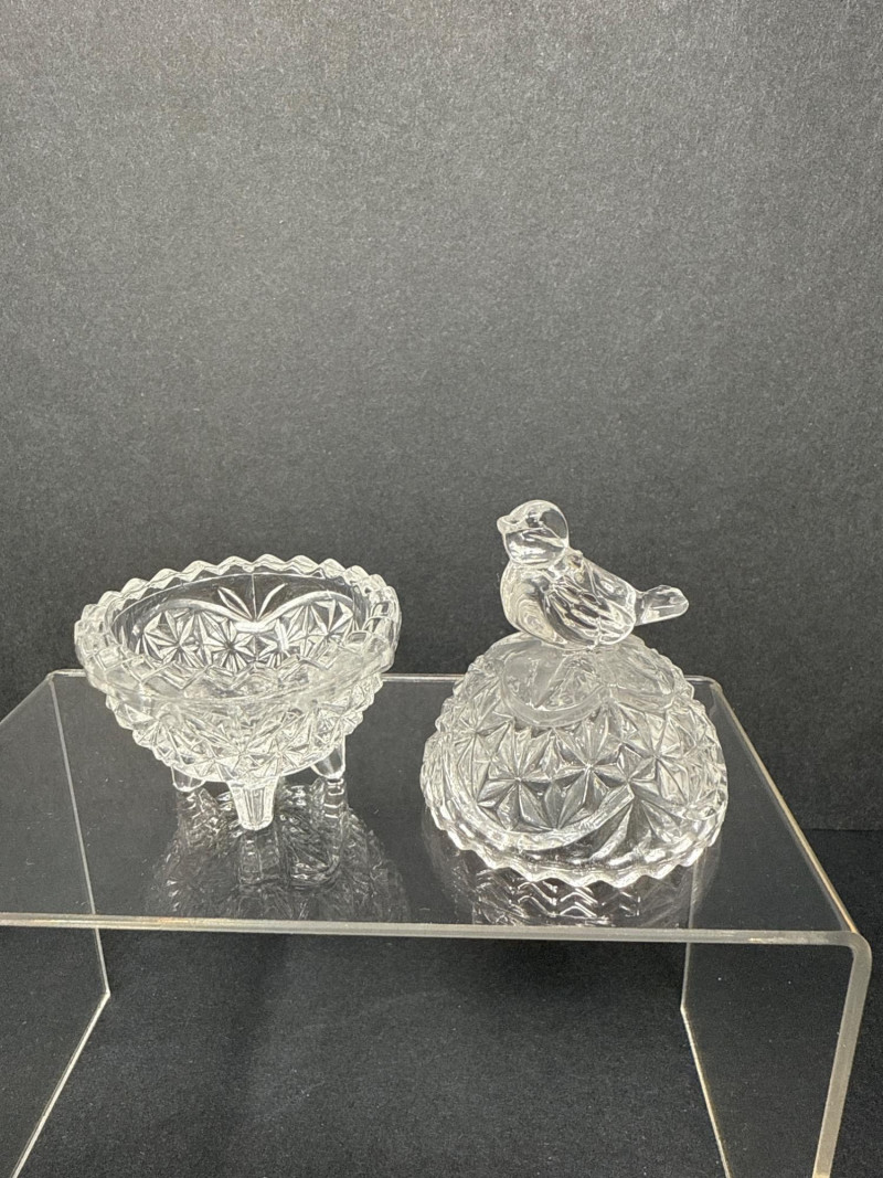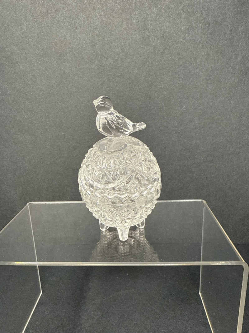 Design Features: Tripod-footed trinket dish with pressed geometric pattern Lid topped with perched bird finial