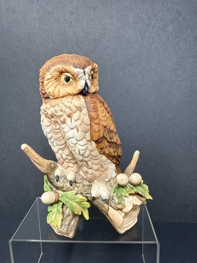 Design Features: Realistic owl perched on a tree branch with acorns and leaves Hand-painted in earthy tones with fine feather detailing