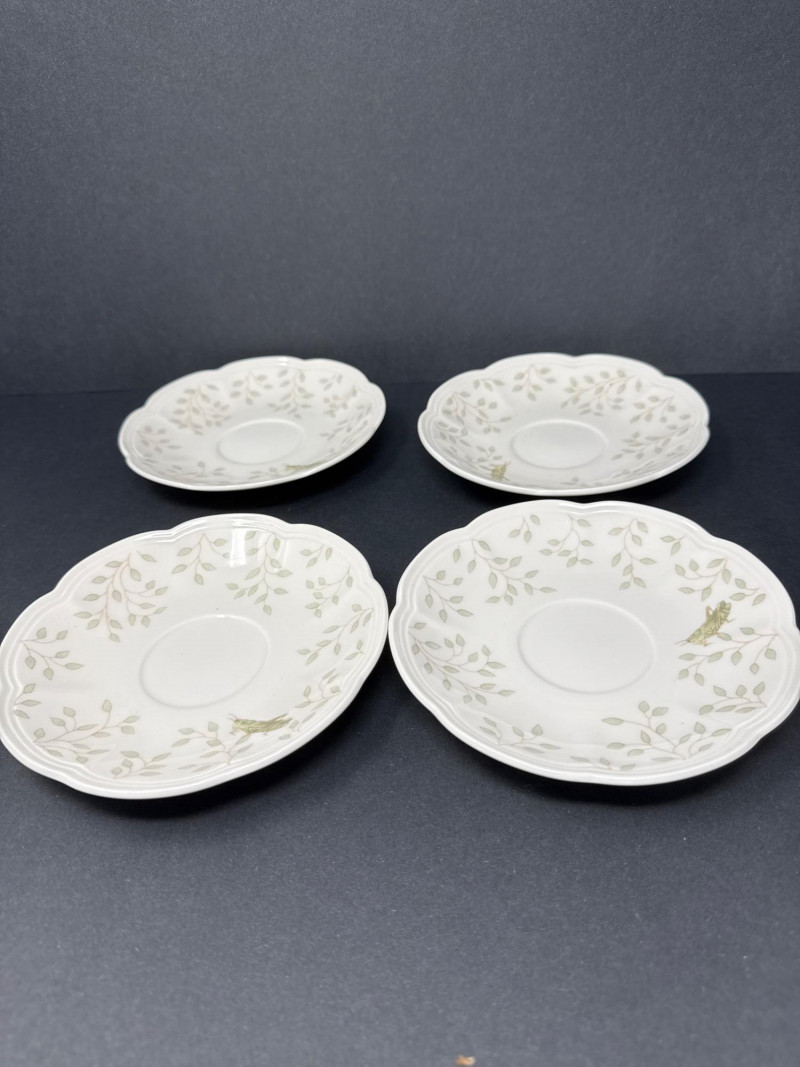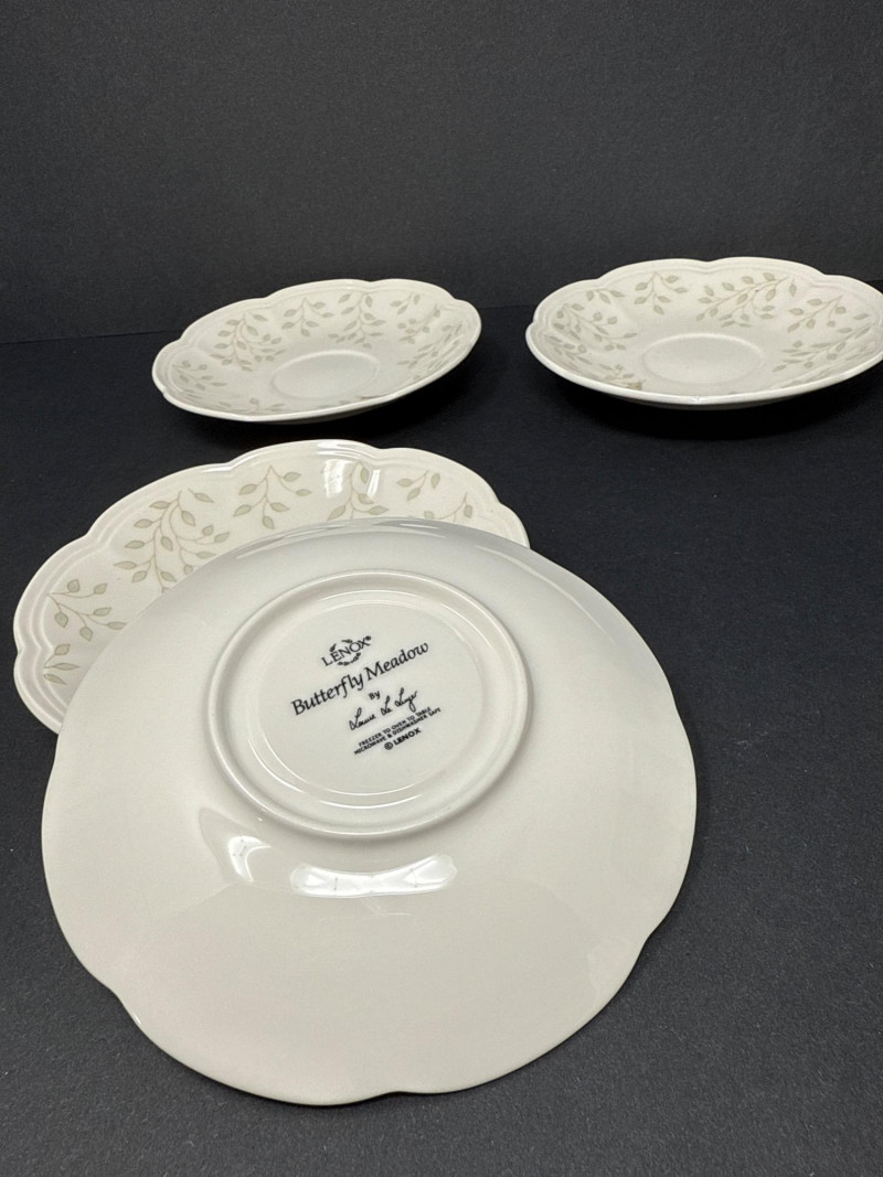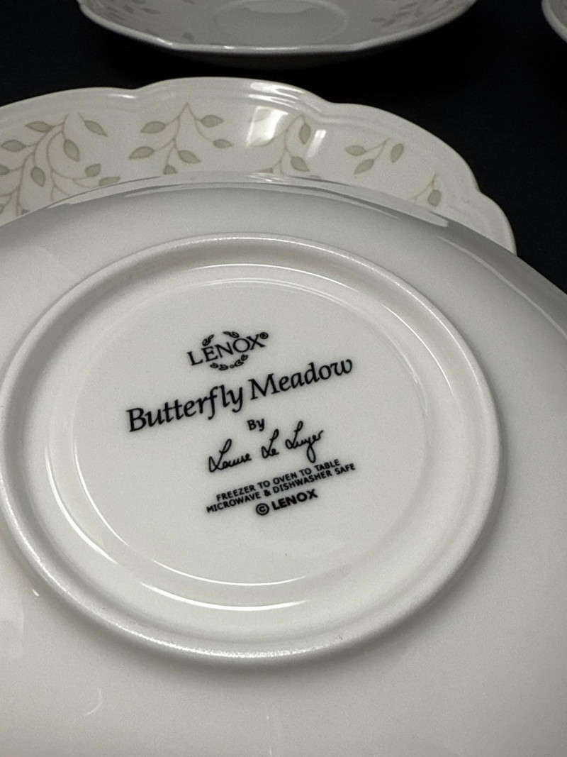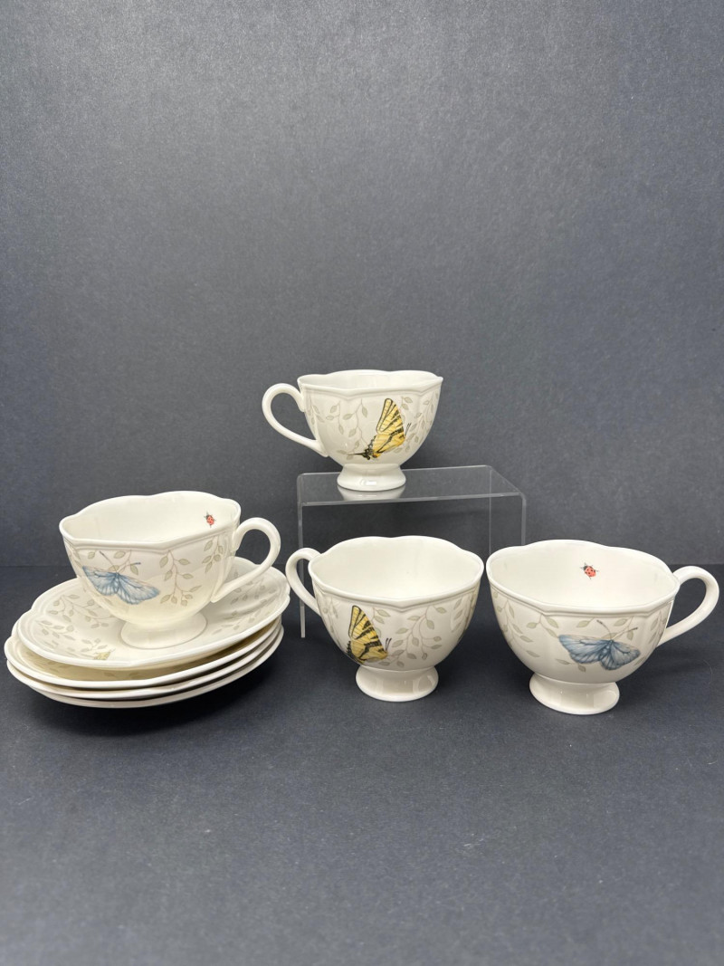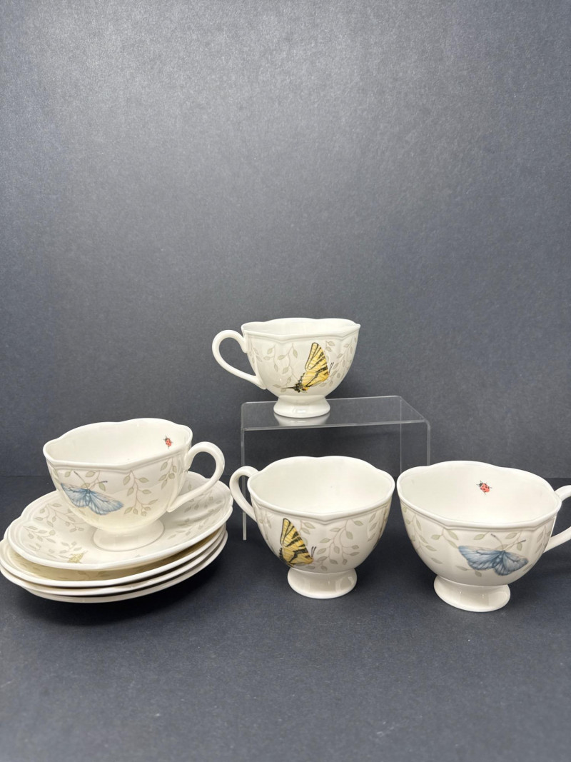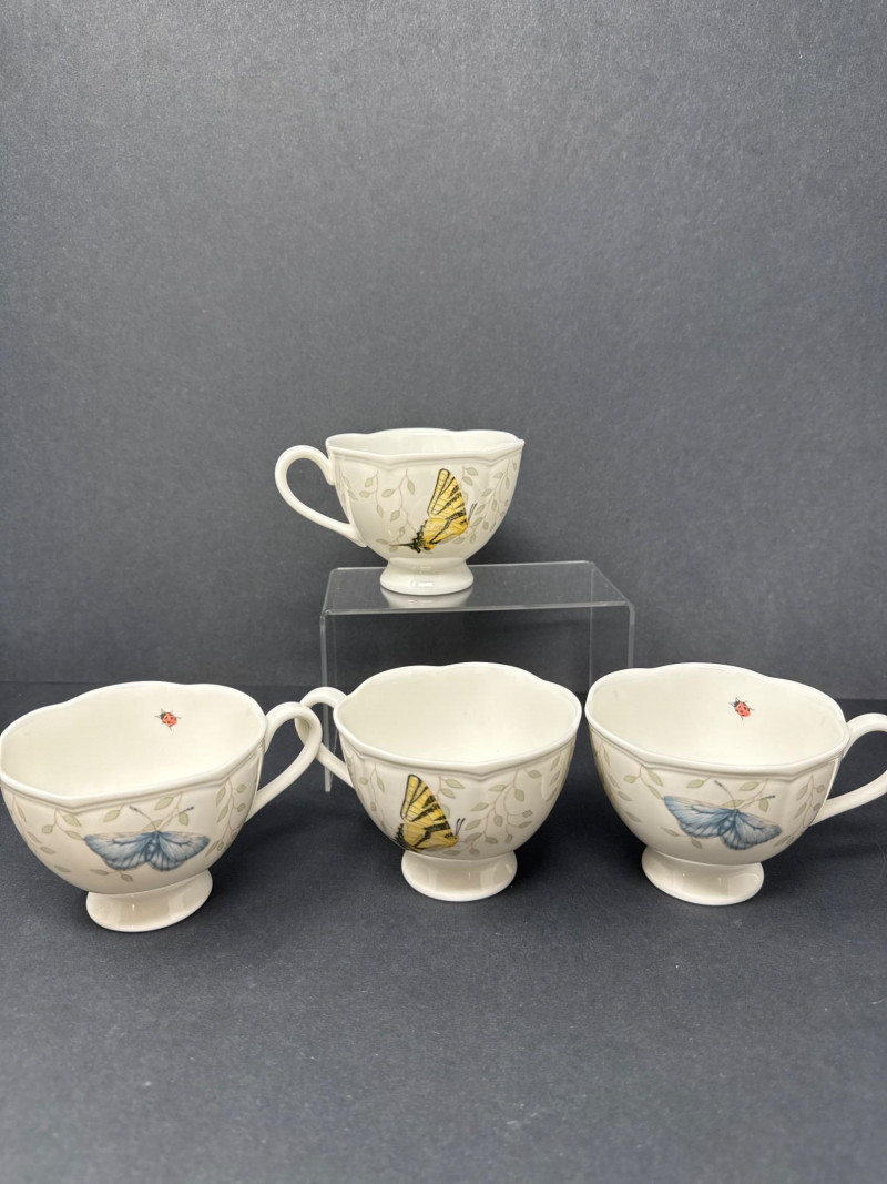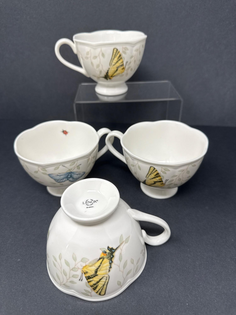 Lenox “Butterfly Meadow” Porcelain Teacups & Saucers – Set of 5 This charming set from Lenox’s Butterfly Meadow collection features five porcelain teacups and saucers adorned with embossed leaf detailing and delicate butterfly and ladybug motifs in soft pastels. Designed by Louise Le Luyer, each piece captures the whimsy of nature with sculptural finesse and botanical elegance. Maker: Lenox