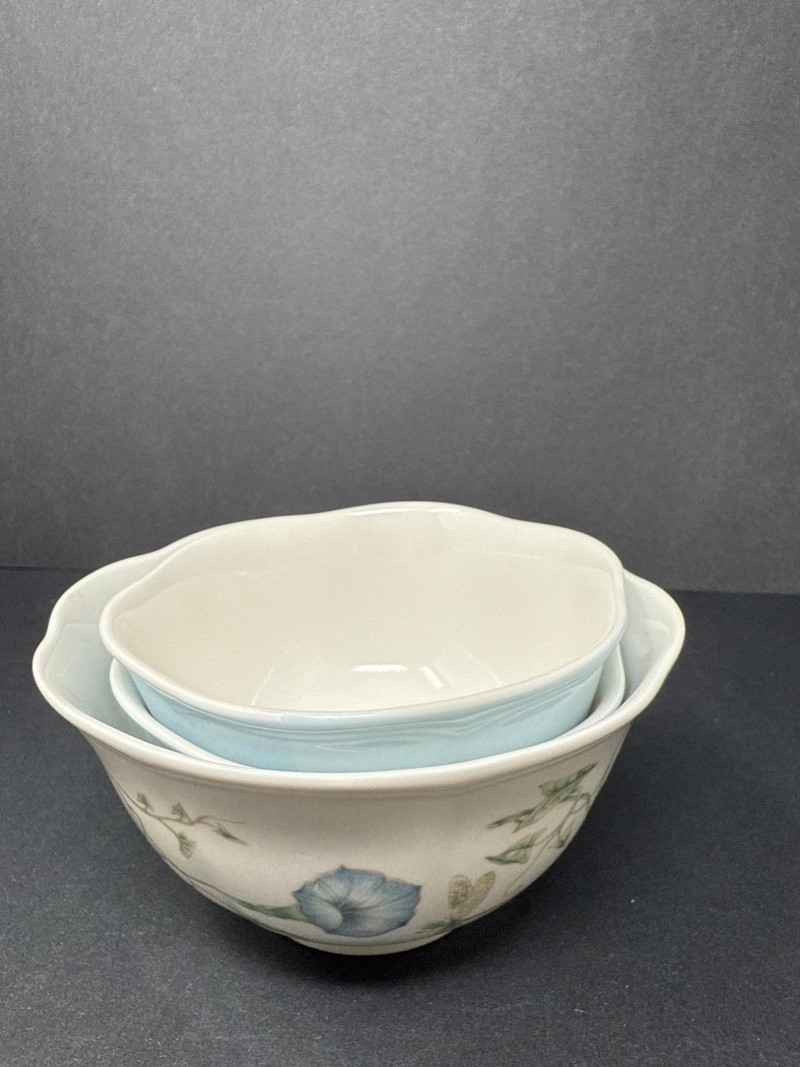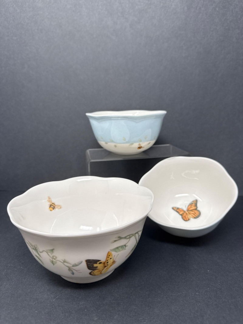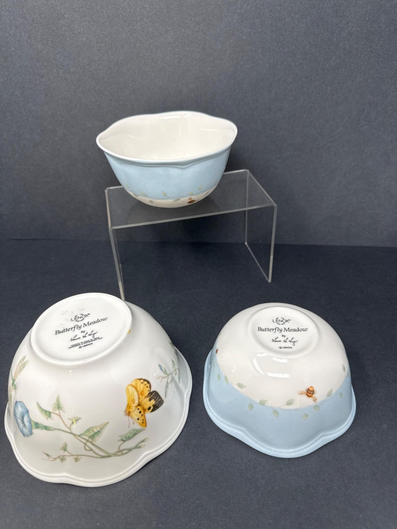 Serving Tray – Swallowtail Design Dimensions: 10.5" diameter Pattern: Butterfly Meadow “Swallowtail” by Louise Le Luyer Design: Porcelain tray with scalloped edge, decorated with swallowtail butterflies, bees, and florals. Chrome center handle for serving. Markings: Underside marked “Lenox Butterfly Meadow – Swallowtail” Style Notes: Practical as a pastry or dessert tray, also serves as a decorative accent piece within the Butterfly Meadow series. Bowls – Assorted Butterfly Meadow Designs Dimensions: Two bowls: 5.5" wide × 3" tall One bowl: 4.75" wide × 2.5" tall Pattern: Lenox Butterfly Meadow by Louise Le Luyer Design: White porcelain with scalloped rims, decorated with butterflies, bees, and floral motifs. One features a blue accent band, others with full floral decoration. Markings: Each stamped “Lenox Butterfly Meadow” Style Notes: Versatile bowls for rice, cereal, or desserts. Mix of sizes adds variety and flexibility for table use or display. About the Maker: