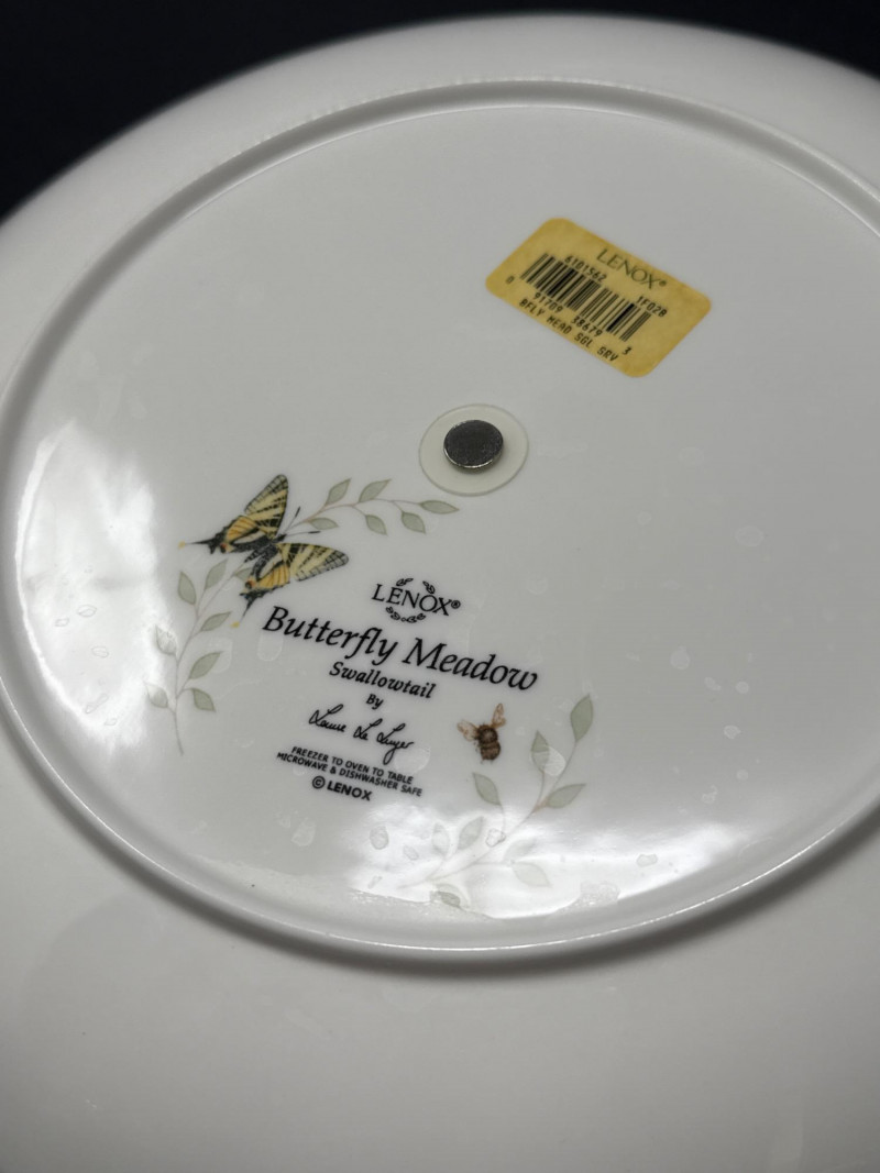 Lenox, founded in 1889, is renowned for fine porcelain and American dinnerware. The Butterfly Meadow line, introduced in 1999, features detailed botanical and butterfly illustrations by artist Louise Le Luyer, making it one of Lenox’s most popular and collectible series.