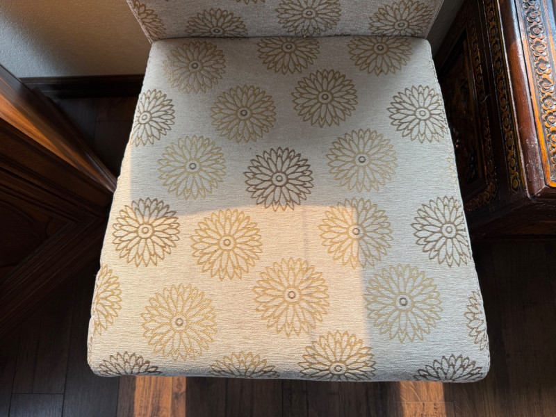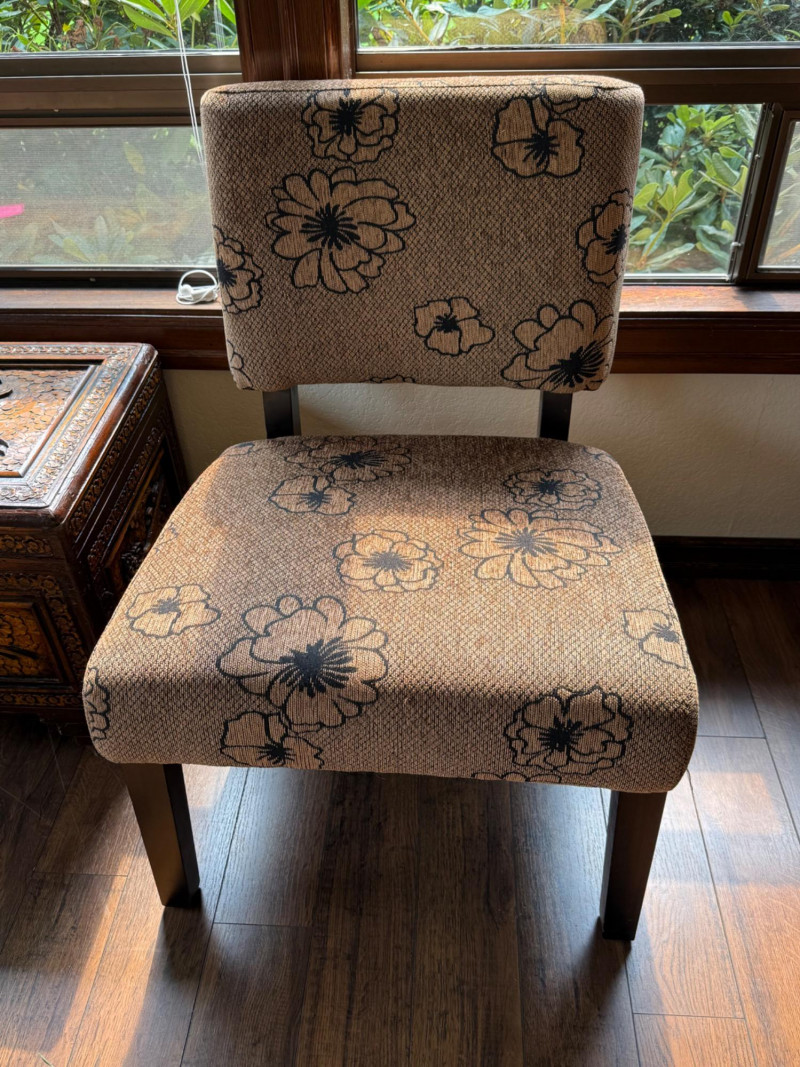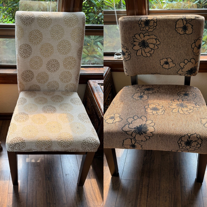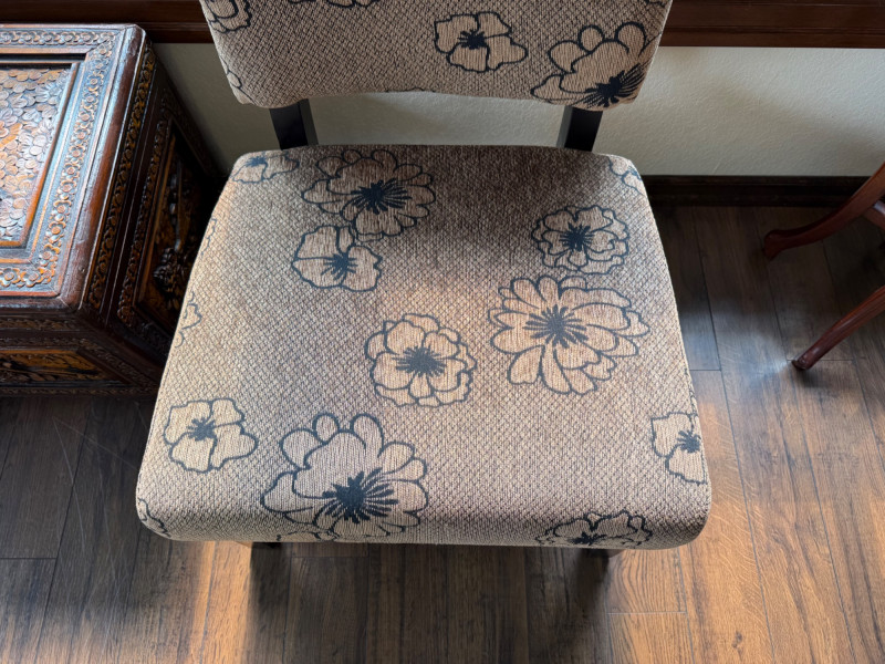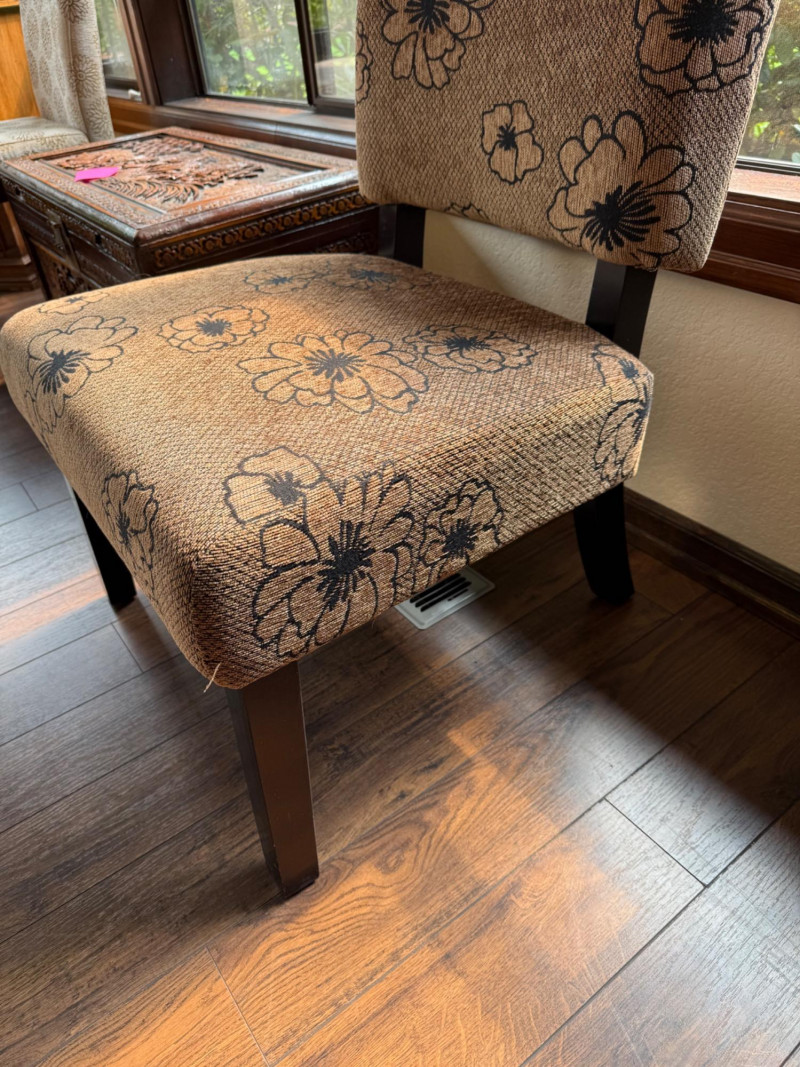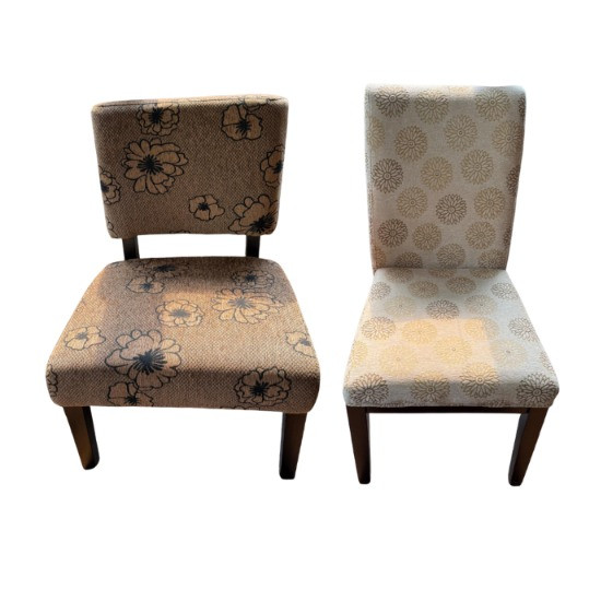 Chair A - Office Star Parsons Dining Chair – Bassett Capri Cream Inspired Upholstery Maker: Office Star Products (inspired by Bassett Capri) Style: Parsons dining/desk chair Upholstery: Cream fabric with floral medallion pattern Dimensions: 19" W × 21" D × 37.5" H Features: Upholstered tall back, cushioned foam seat, solid wood legs, intended for residential use Chair B - Office Star Jasmine Accent Chair – Flower Mocha Upholstery Maker: Office Star Products Style: Jasmine accent chair Upholstery: Mocha brown fabric with bold black floral pattern Seat Dimensions: 24" W × 20" D × 17" H Overall Dimensions: 33" H × 23.5" W × 22.5" D Features: Upholstered medium back, cushioned foam seat, dark solid wood legs, intended for residential use