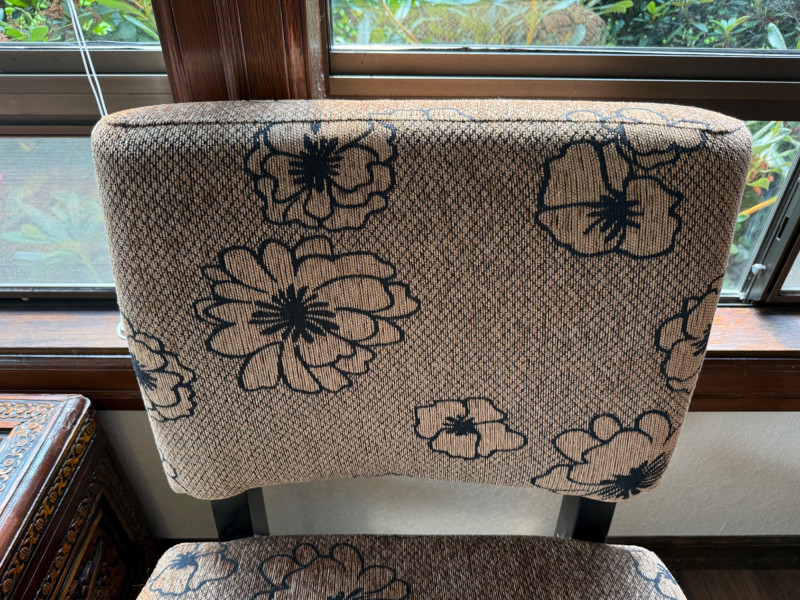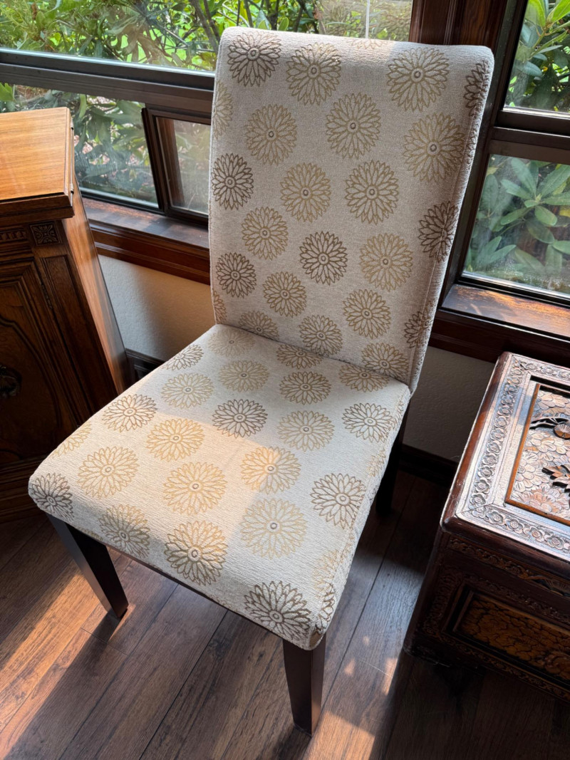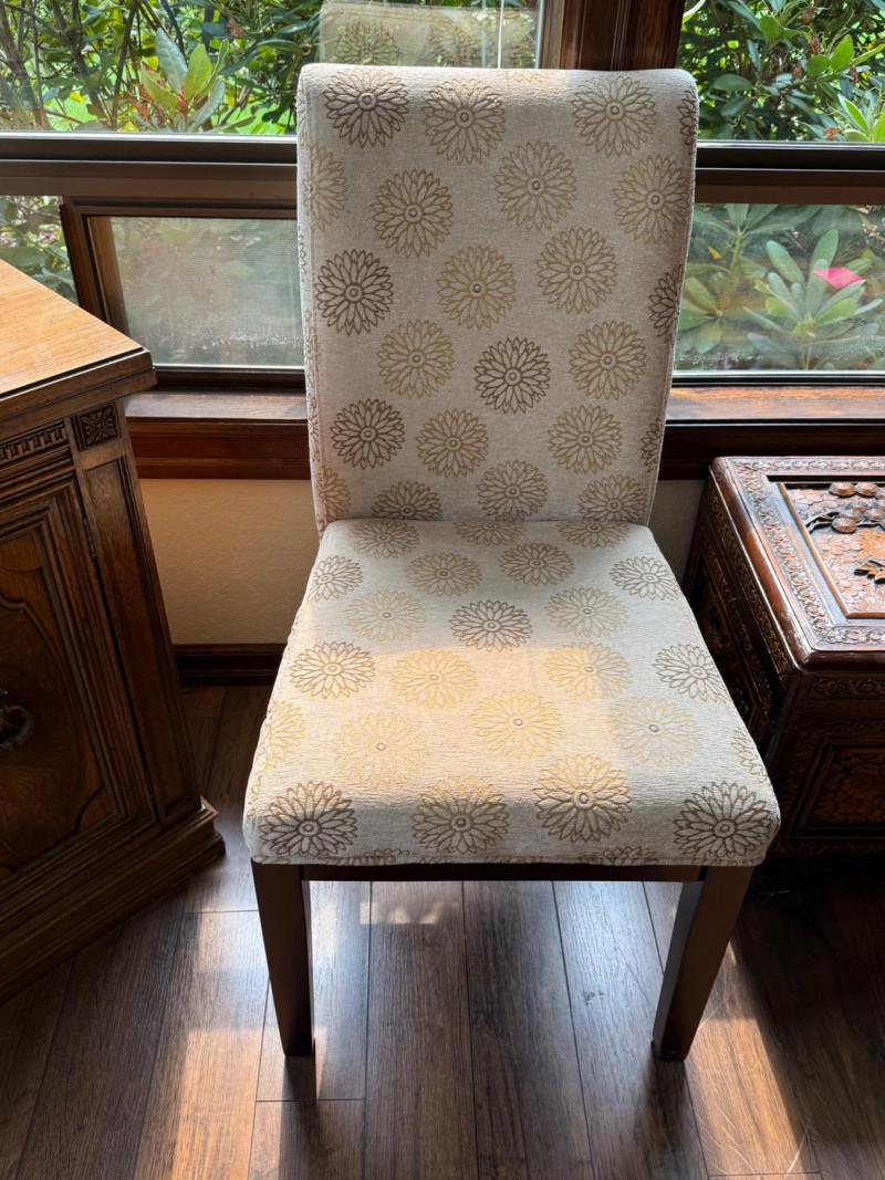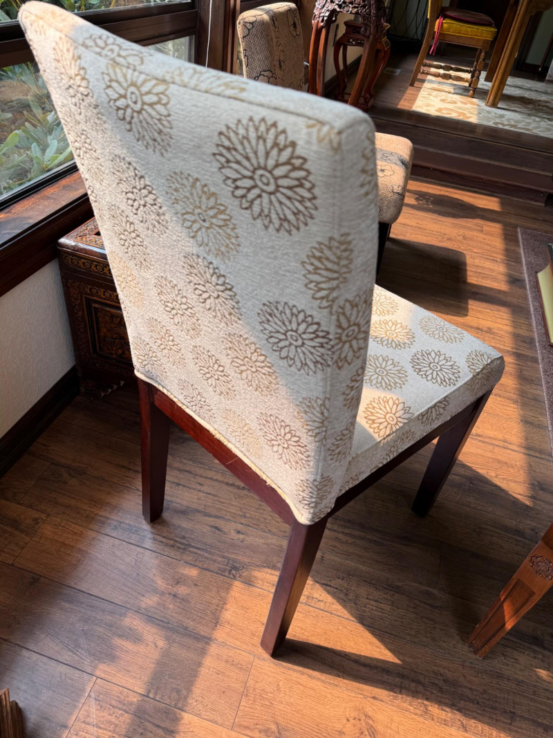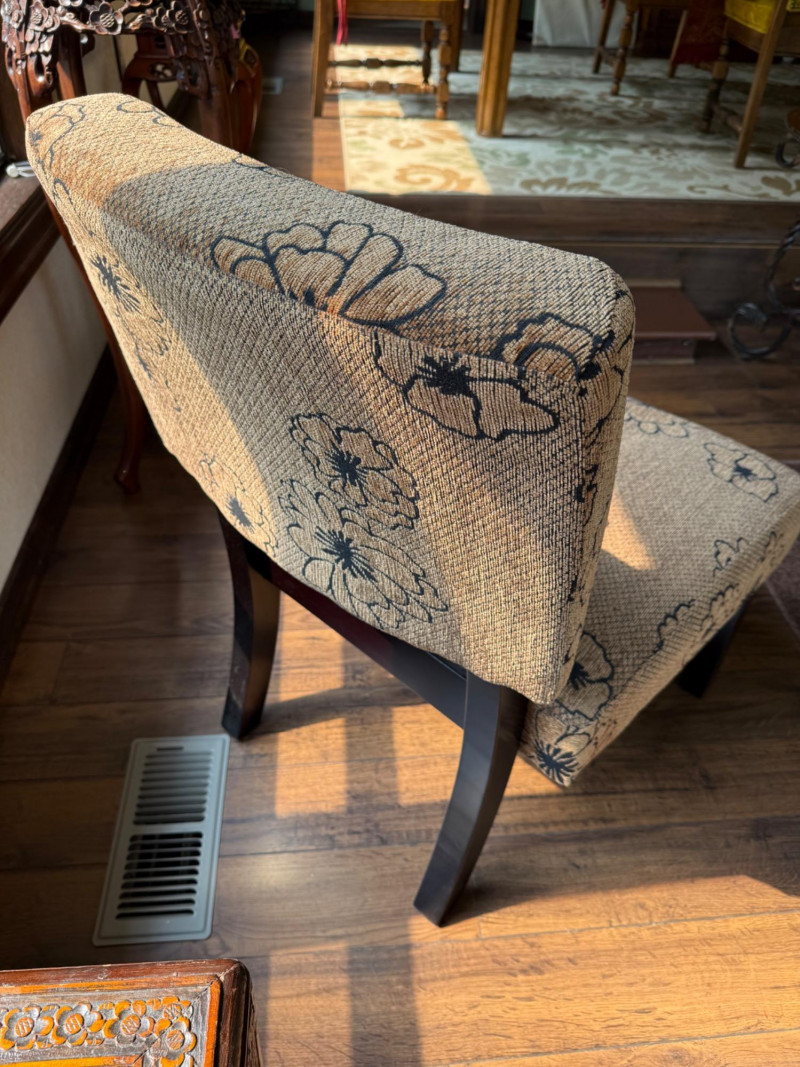 Chair A - Office Star Parsons Dining Chair – Bassett Capri Cream Inspired Upholstery Maker: Office Star Products (inspired by Bassett Capri) Style: Parsons dining/desk chair Upholstery: Cream fabric with floral medallion pattern Dimensions: 19" W × 21" D × 37.5" H Features: Upholstered tall back, cushioned foam seat, solid wood legs, intended for residential use Chair B - Office Star Jasmine Accent Chair – Flower Mocha Upholstery Maker: Office Star Products Style: Jasmine accent chair Upholstery: Mocha brown fabric with bold black floral pattern Seat Dimensions: 24" W × 20" D × 17" H Overall Dimensions: 33" H × 23.5" W × 22.5" D Features: Upholstered medium back, cushioned foam seat, dark solid wood legs, intended for residential use