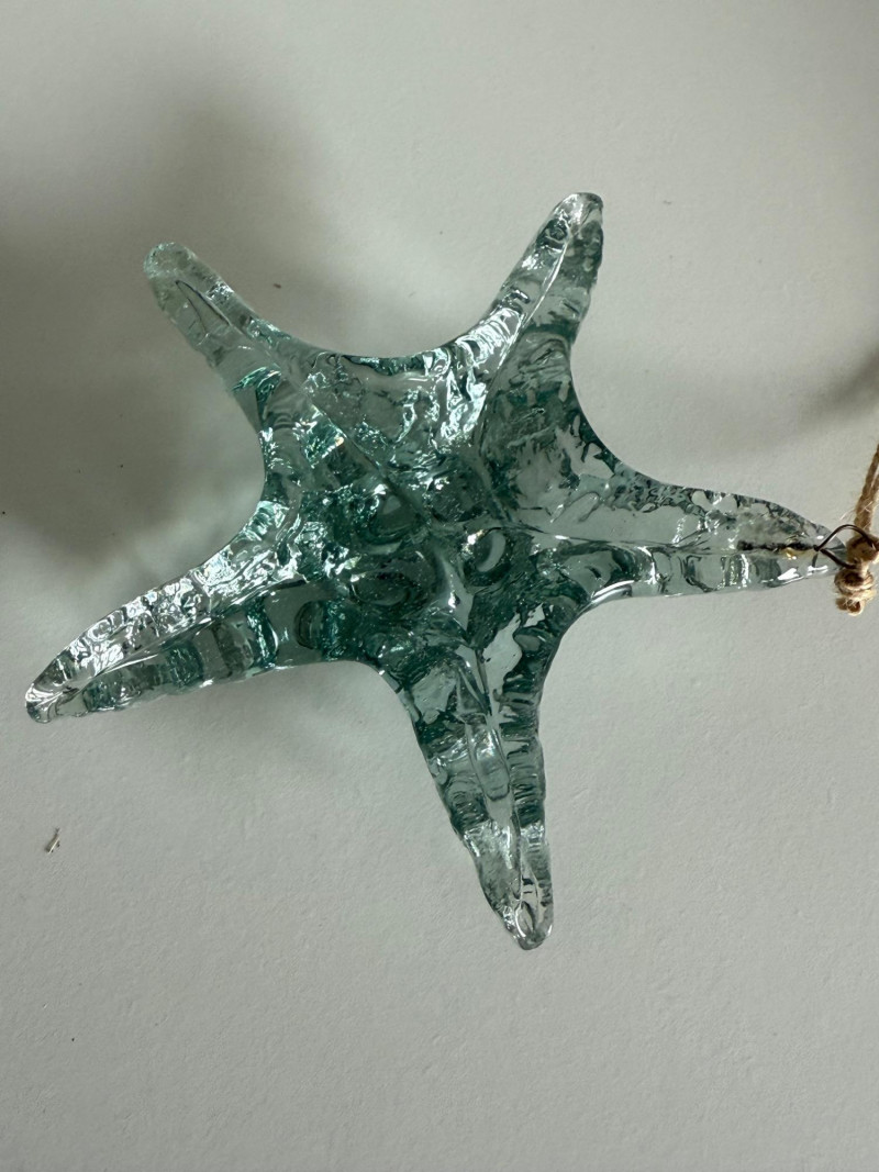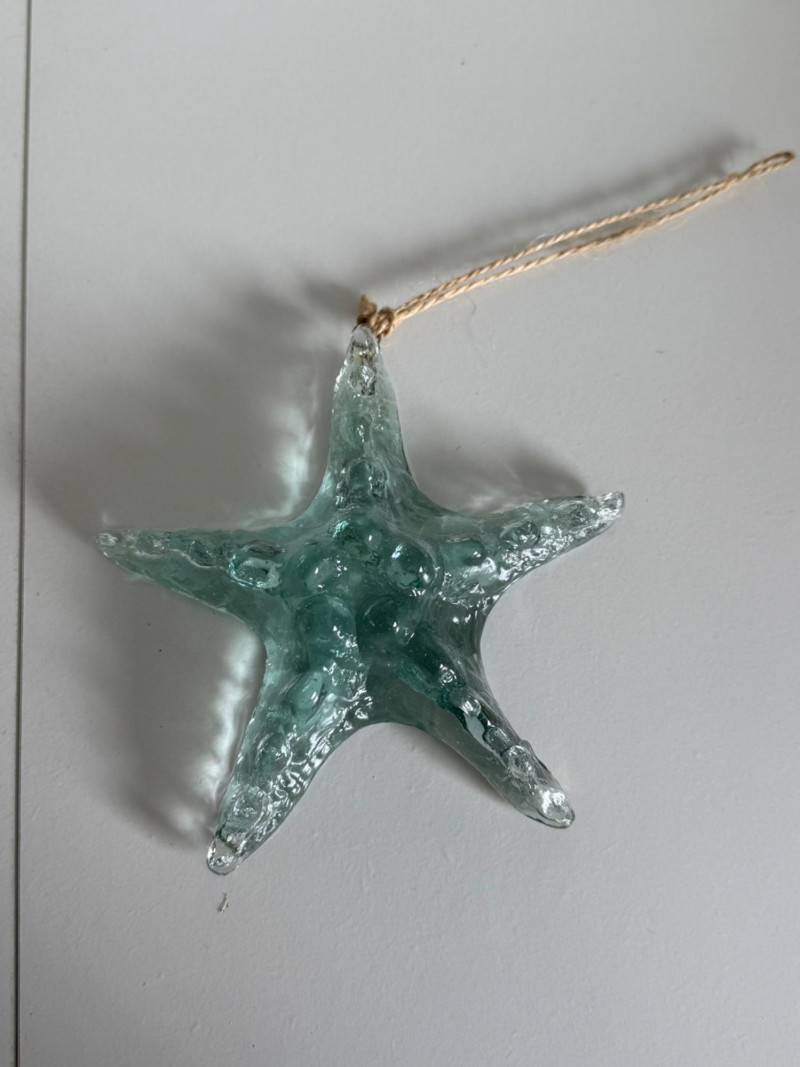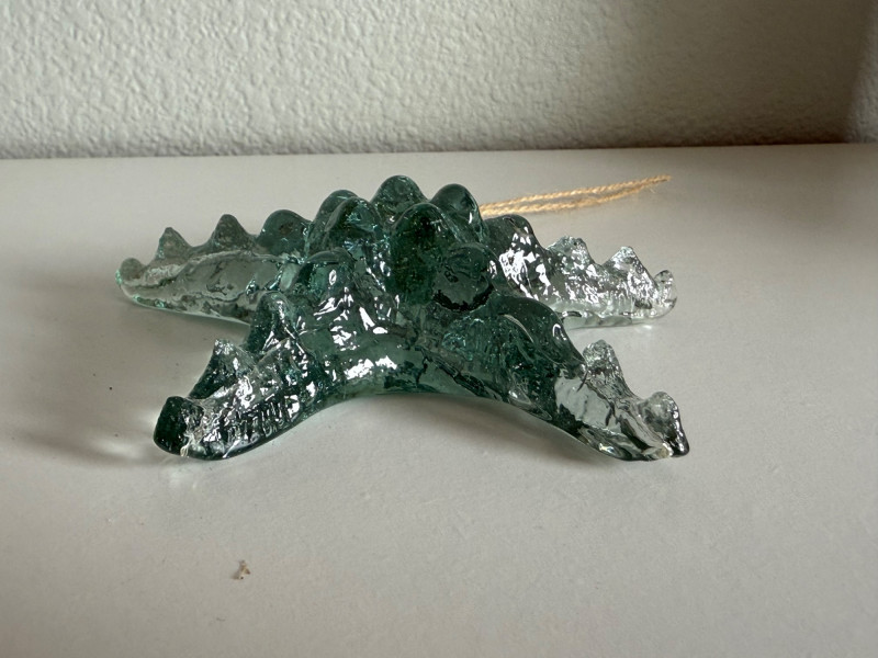 Dimensions: approx. 6" H x 5.25" W B. Starfish Ornament – Light aqua glass starfish with raised surface textures and an organic form. Comes with a looped cord for hanging.
