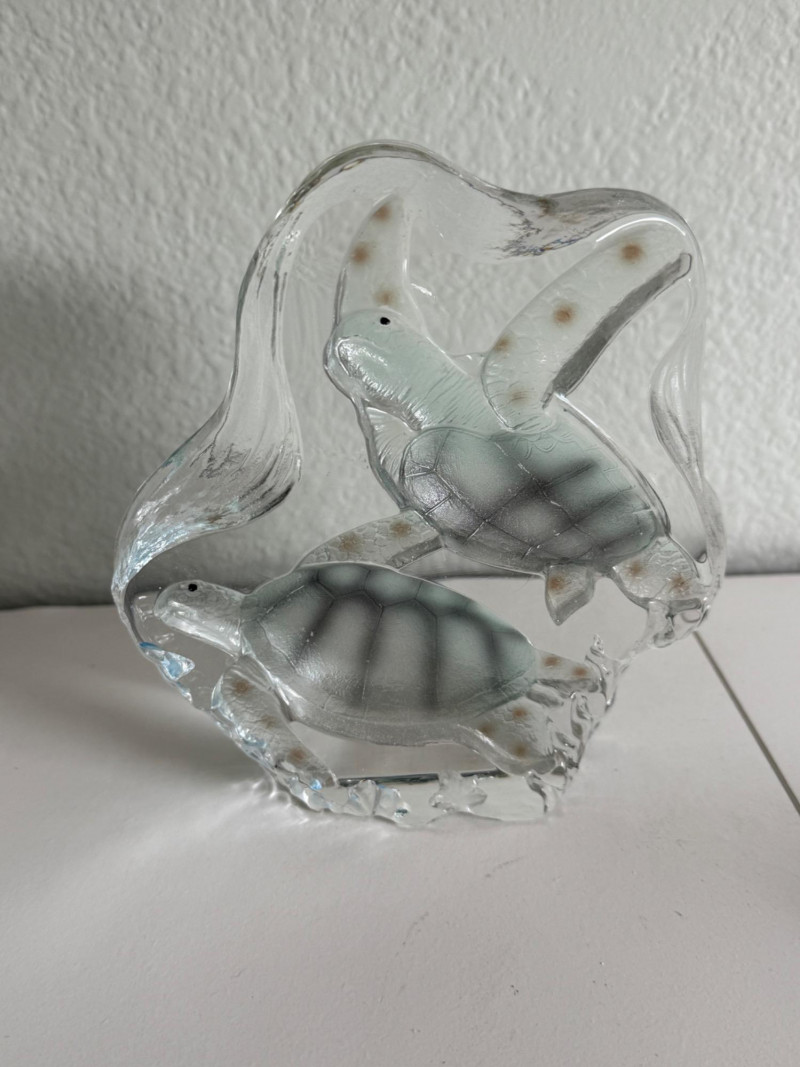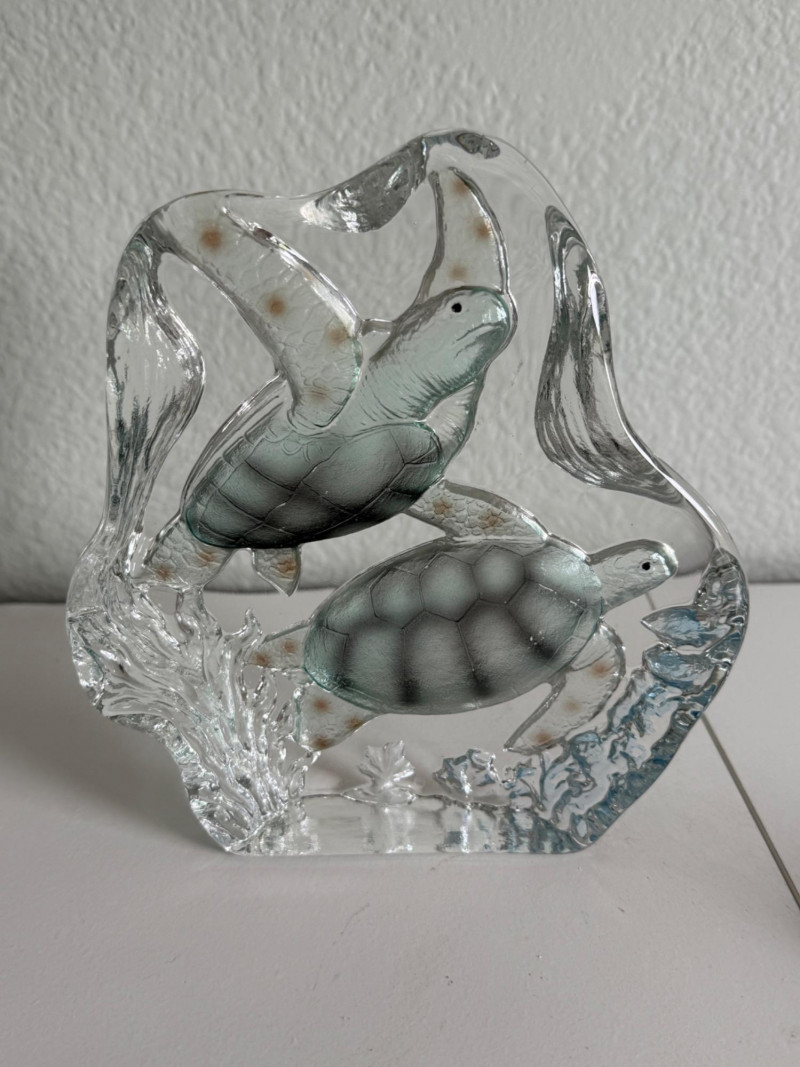 This lot includes two ocean-themed glass pieces: A. Sea Turtle Sculpture – Freestanding clear glass block featuring two molded sea turtles gliding among seaweed and coral motifs. Subtle green and gray accents highlight the turtles’ shells, adding depth to the underwater scene.