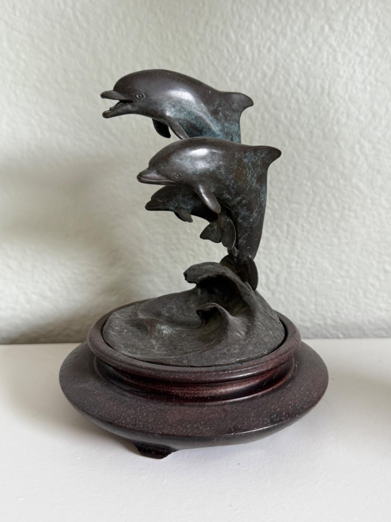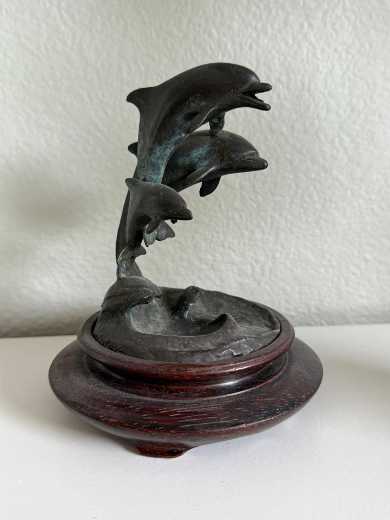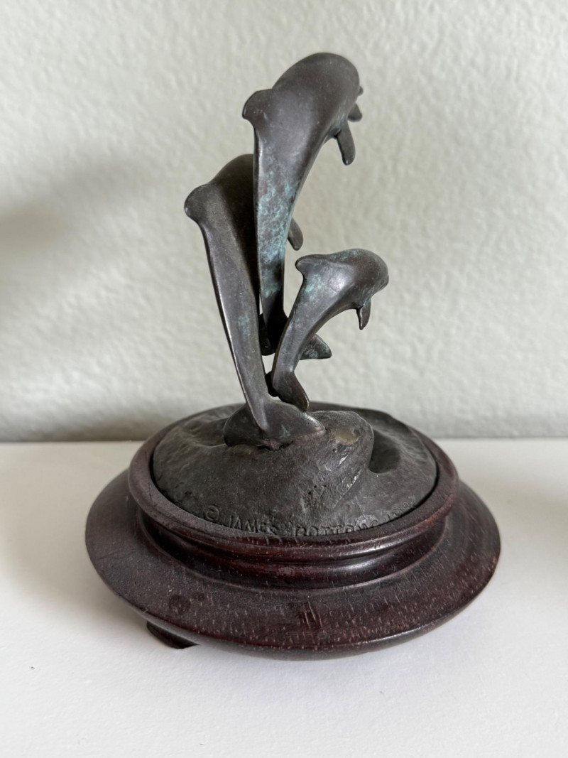 James Bottoms Bronze Dolphin Family Sculpture, 1984 Material: Cast bronze with natural patina Base: Mounted on a round wooden display base Dimensions: 5" tall Design: Three dolphins leaping above stylized ocean waves Sculpted with fluid lines and realistic detail Markings: Signed and dated on the base, “© James Bottoms 1984” Artist Note: