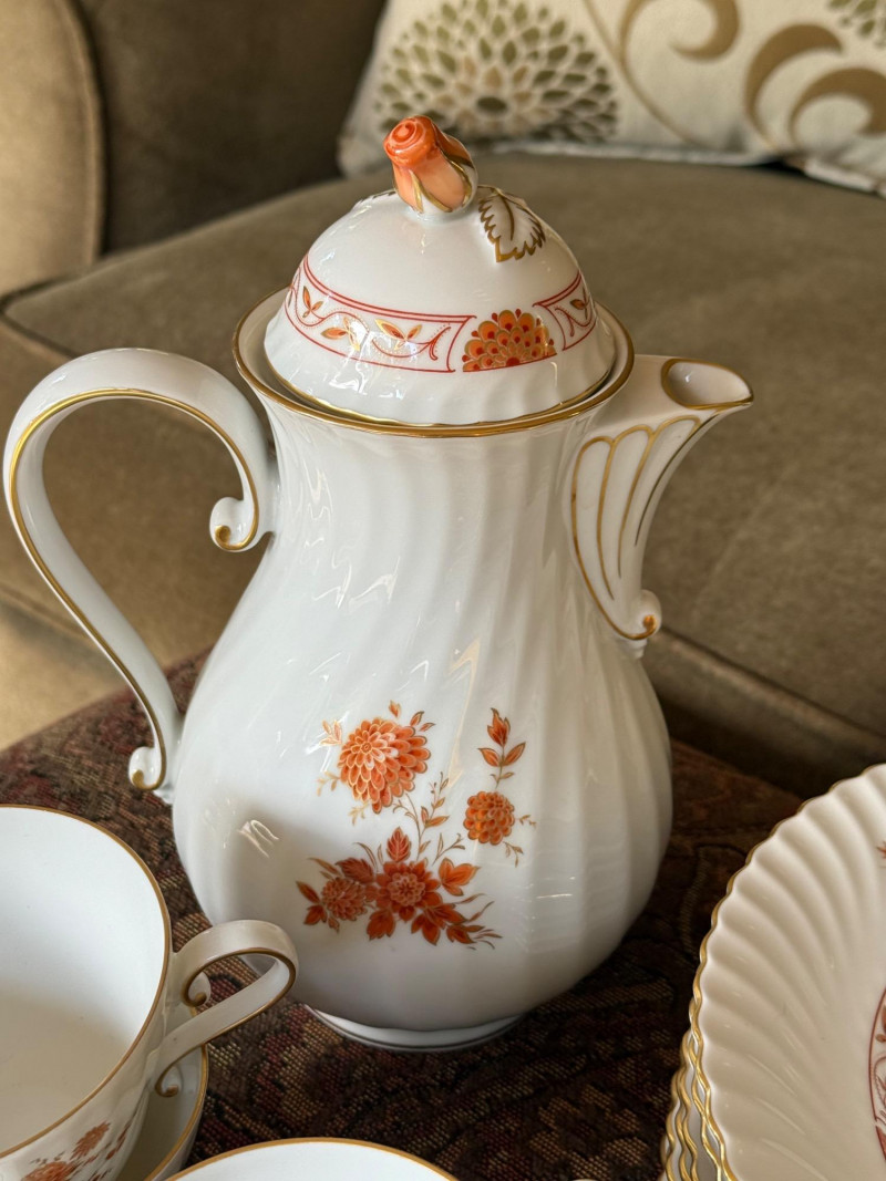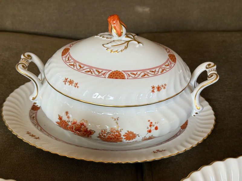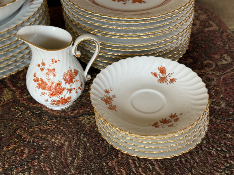 Fine Bavarian Porcelain Dinner Service Set A refined mid-century porcelain dinner service by Alboth & Kaiser, featuring the elegant “Burgund” pattern. Each piece showcases vibrant orange-red floral sprays framed within patterned borders, accented with gilt trim and scalloped, fluted edges. The set bears the crowned “AK” Alboth & Kaiser Bavaria mark alongside the pattern name “Burgund,” affirming its origin and authenticity. Set Includes: Serving Pieces (5): – 1 large lidded tureen with separate underplate (2 pieces total)
