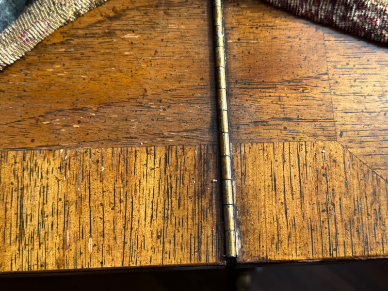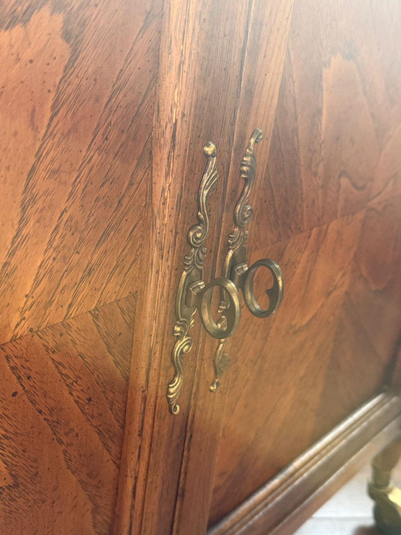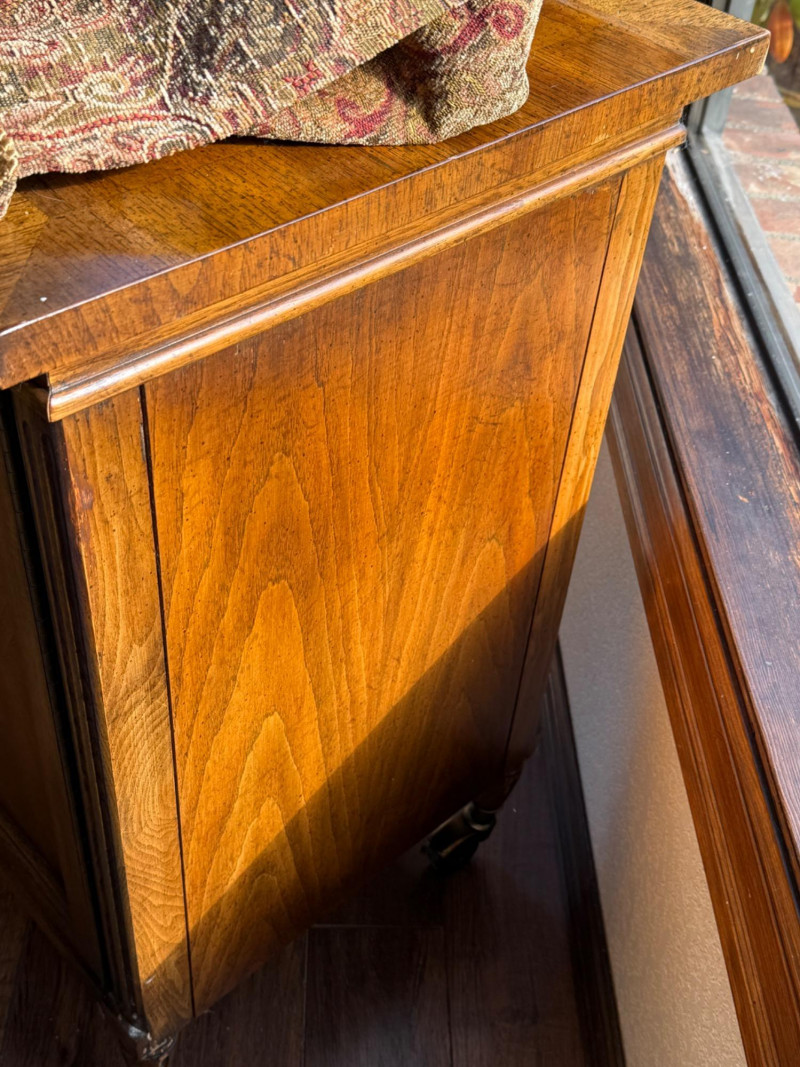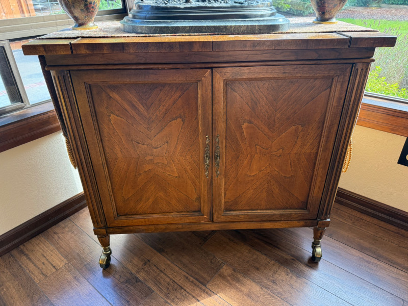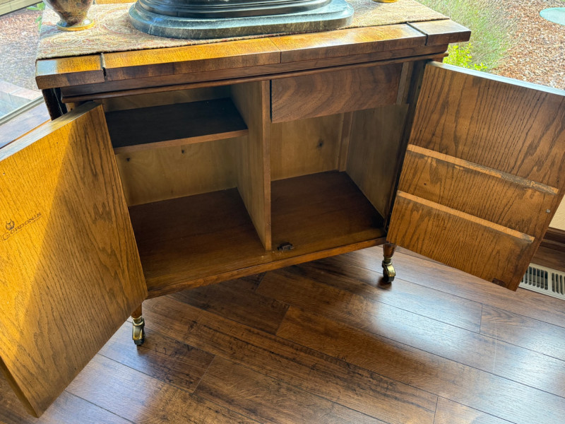 Gordon’s Johnson City Rolling Cabinet A mid-20th-century cabinet by Gordon’s Inc., Johnson City, Tennessee. Constructed with walnut veneer over hardwood, the piece features two paneled doors with butterfly-pattern inlay, opening to interior shelving and a drawer. The hinged top expands for service use. Supported on turned legs with brass-capped casters for mobility. Retains original brass hardware and stamped maker’s mark inside the door.