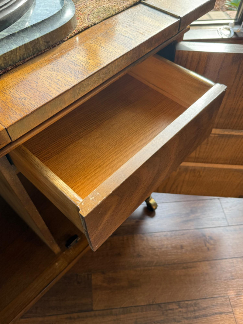 Features: Expandable top, drawer, interior shelving, brass pulls, casters