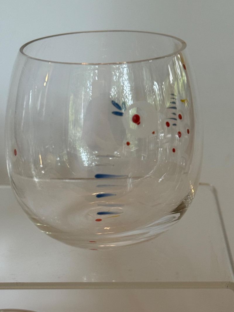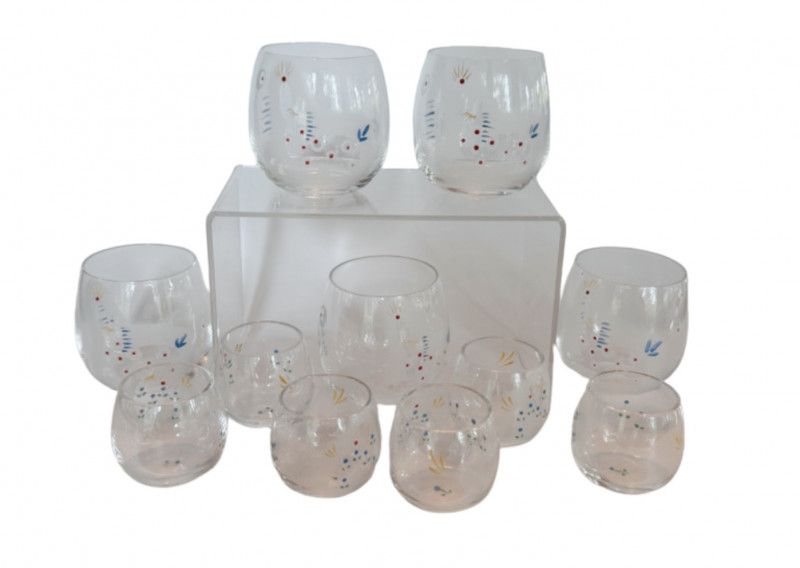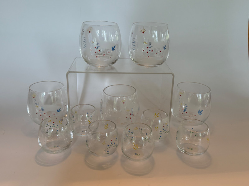 Vintage Hand-Painted Shot Glasses with Abstract Animal Motif This whimsical set of 11 hand-painted shot glasses showcases etched animal-inspired forms rendered in abstract style, accented with bold strokes of red, blue, and yellow enamel. The irregular sizing and expressive design suggest small-batch studio production, possibly mid-20th century.