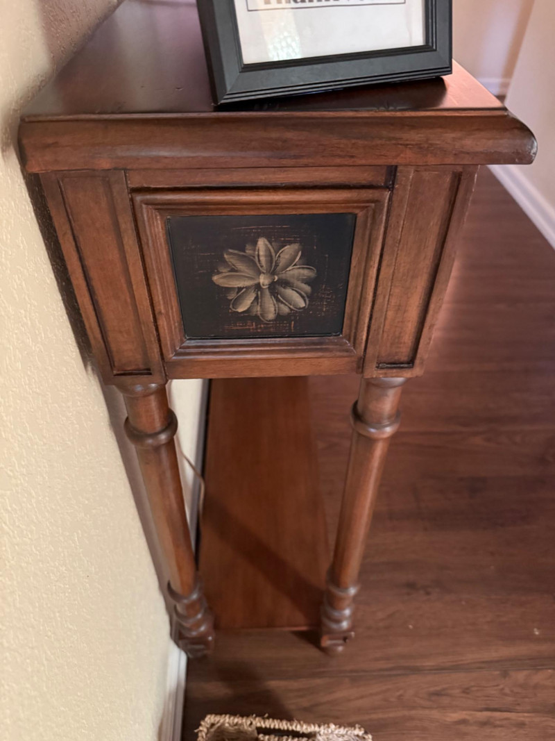 A long, narrow wooden console table featuring four drawers with black painted fronts and decorative gold scroll motifs. The drawers are fitted with circular metal pulls. The table is supported by six turned legs and includes a full-length lower shelf for additional display or storage. Each side panel is detailed with a carved floral medallion. 57” W × 11” D × 33.5” H Wood with painted accents Four drawers with decorative painted fronts Lower stretcher shelf Carved floral medallion side panels Turned wood legs Traditional, likely late 20th century Designed as a console table Suitable for entryways, hallways, or behind a sofa Contents on or in the table are not includedCarved Wood Console Table with Black Accented Drawers