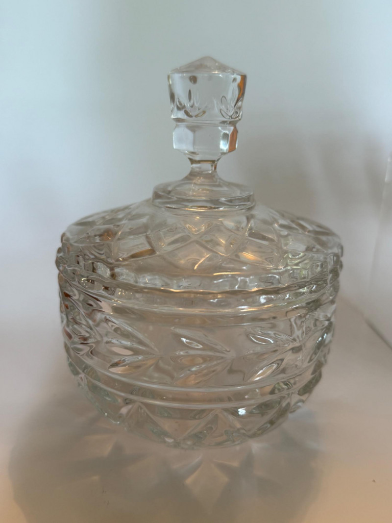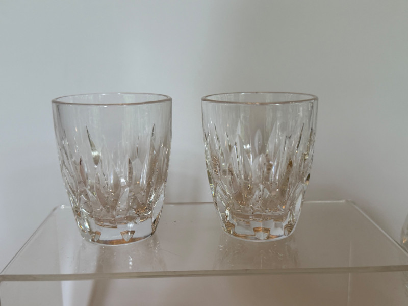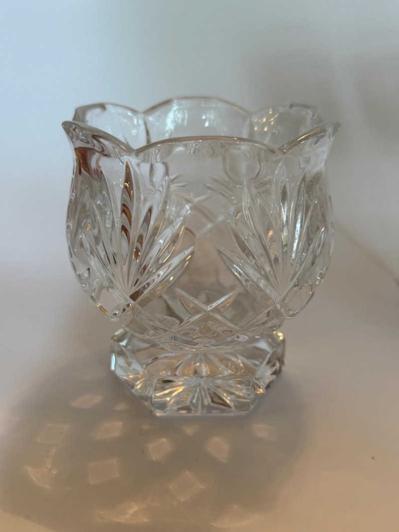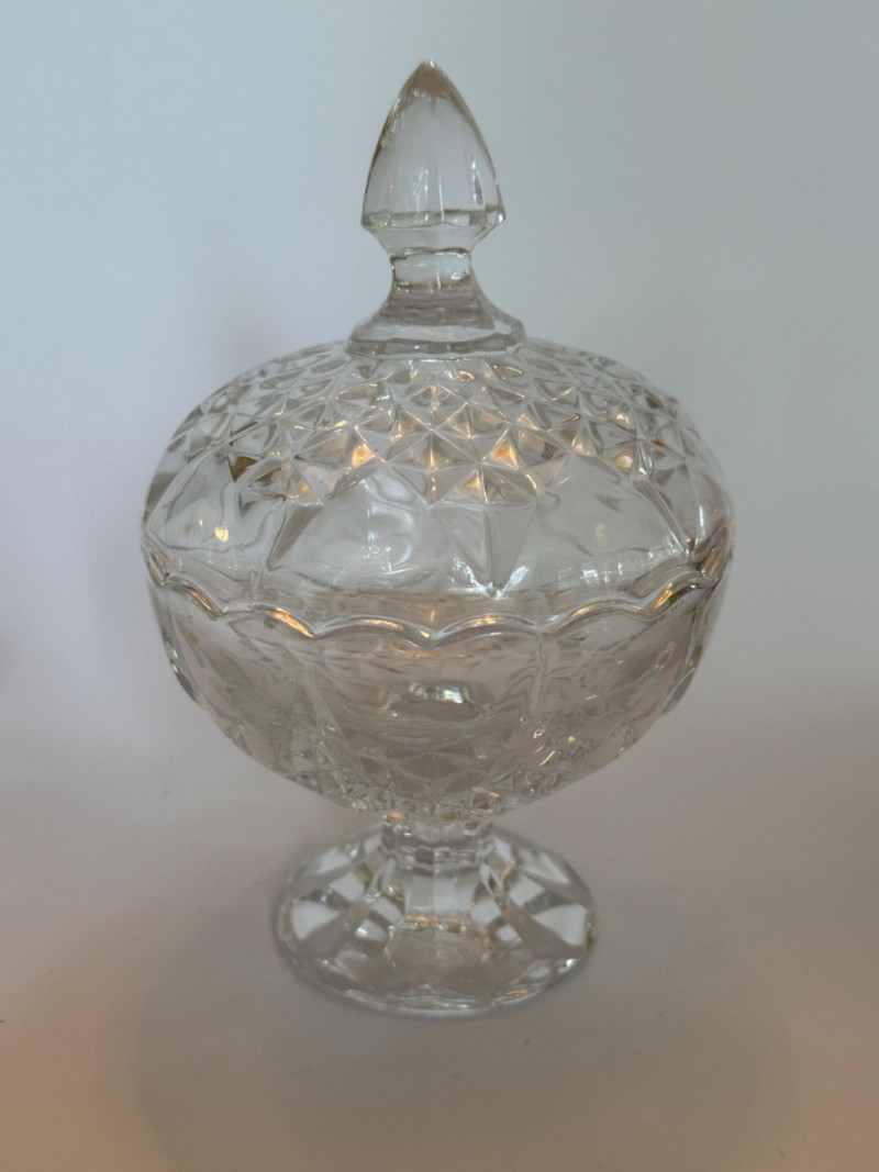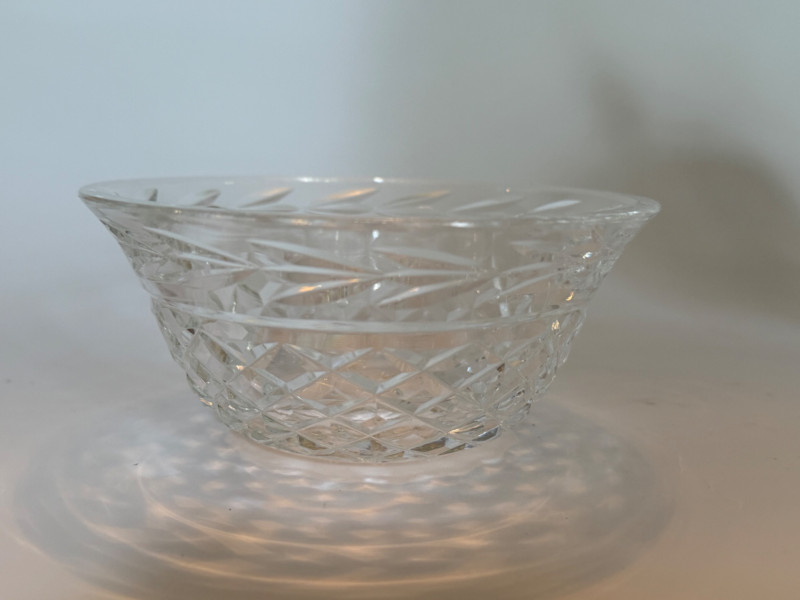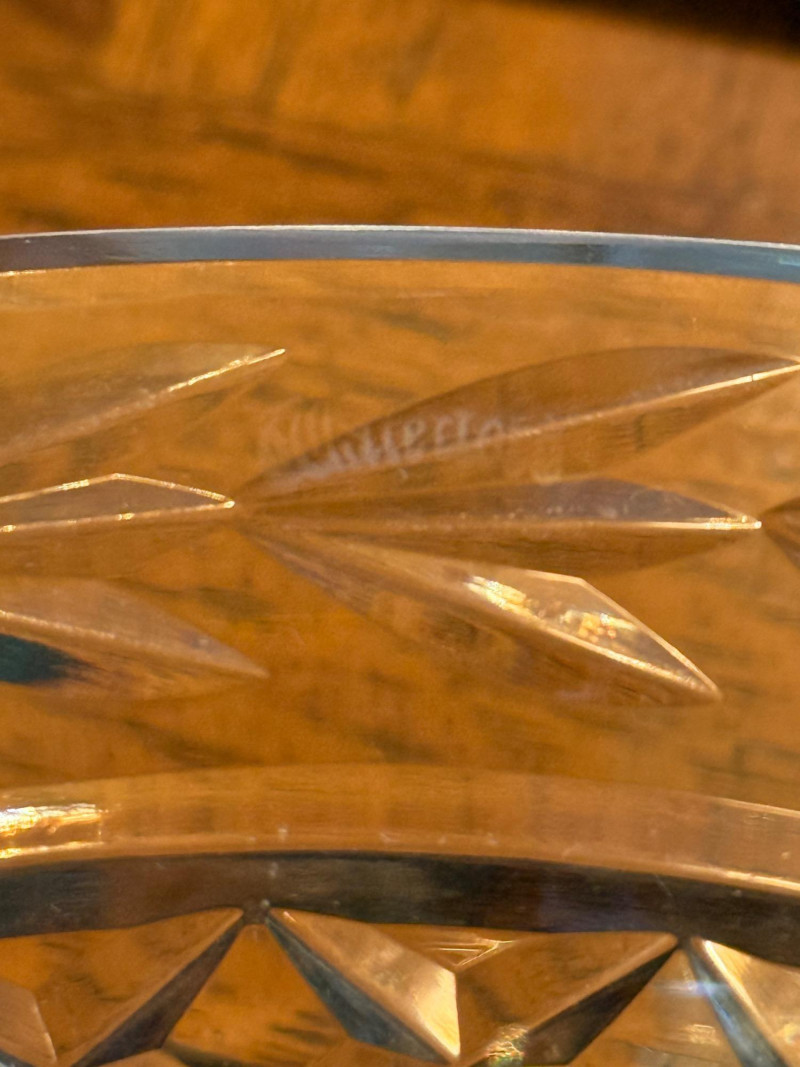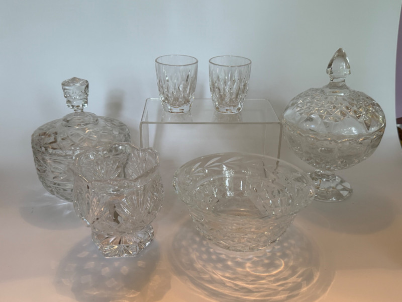 Waterford Bowl, Crystal Candy Dishes & Shot Glasses A. Waterford Piece Round Bowl – Authentic Waterford crystal bowl in the “Glandore” pattern, showcasing alternating leaf and diamond-cut panels. Classic Irish craftsmanship with brilliant clarity and symmetry. B. Crystal Candy Dishes Covered Jar with Stopper – Substantial cut glass jar with a multi-faceted stopper. Weighty feel and prismatic sparkle. Pedestal Lidded Compote – Tall compote with domed lid and faceted finial. Vertical cuts and pedestal base lend height and presence. Pair of Small Pedestal Bowls – Compact diamond-cut bowls with short pedestal bases. Ideal for display or serving. C. Shot Glasses / Tumblers Pair of Tumblers – Waterford-style “Kildare” pattern with vertical and cross-cut facets. Versatile size suitable for use as larger shot glasses or small tumblers. Measurements: Approx. 2.25" to 6.5" tall.