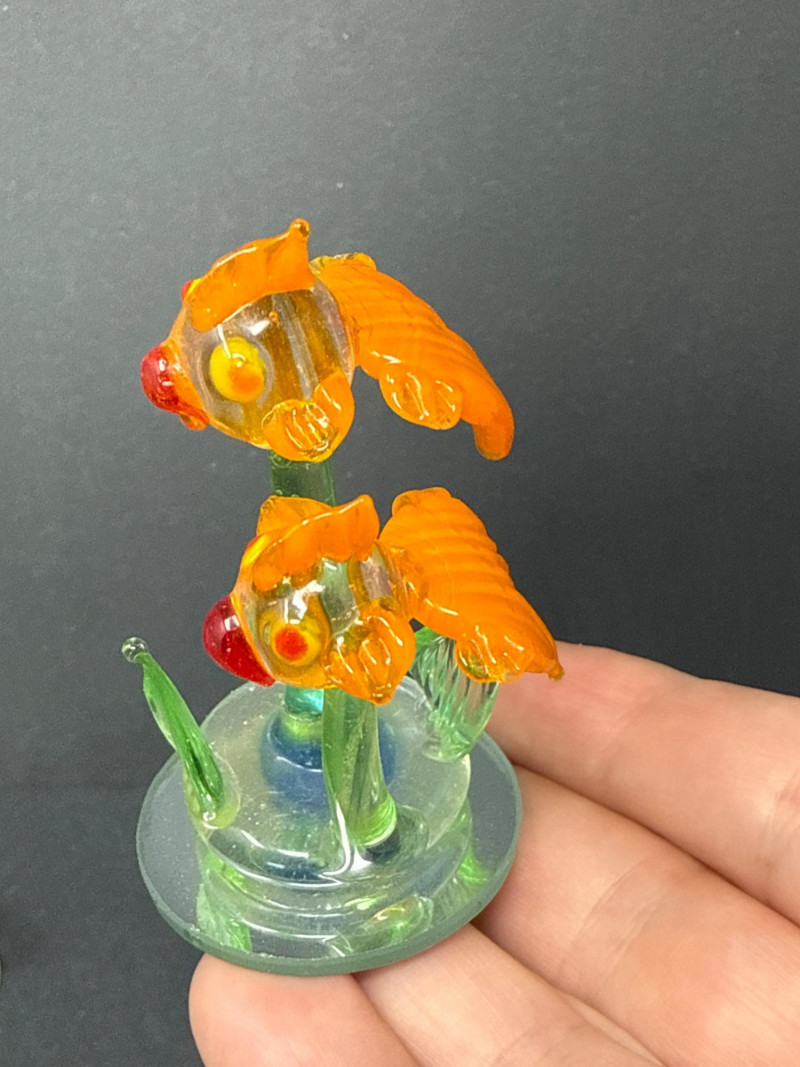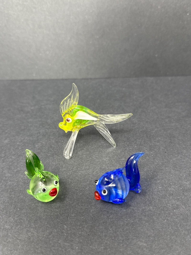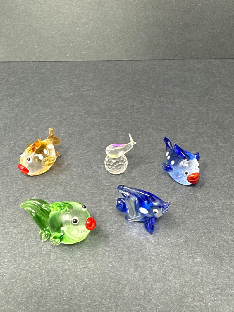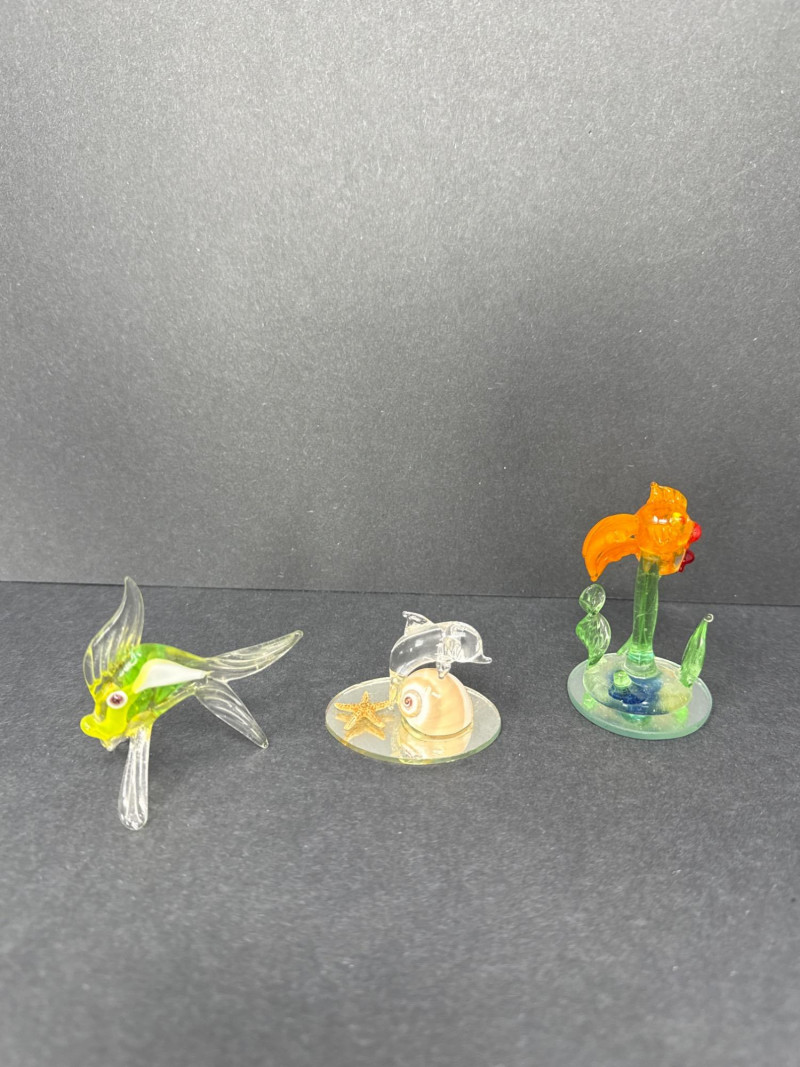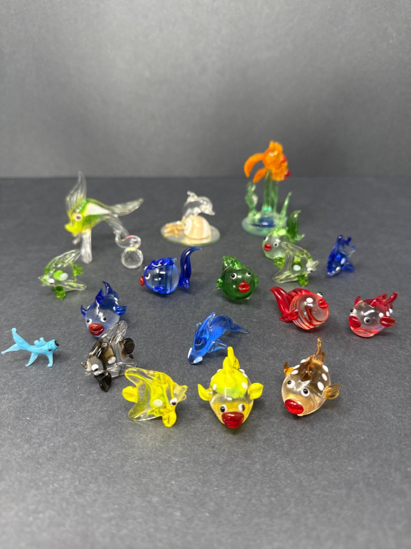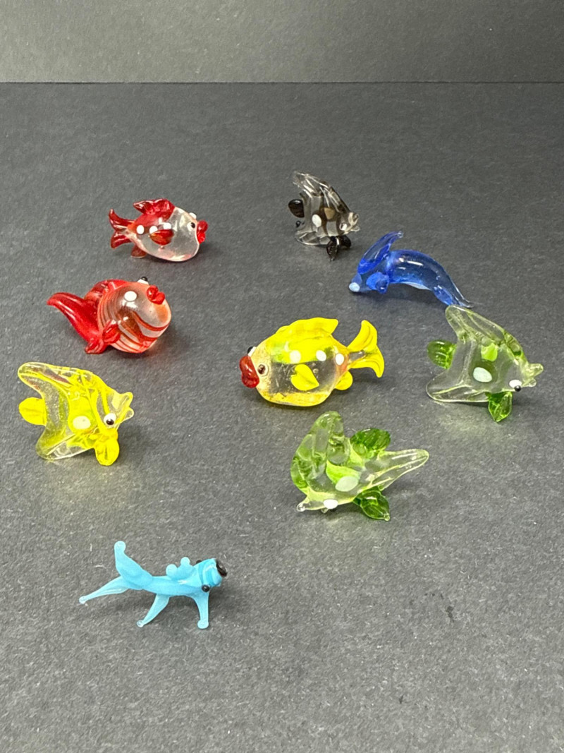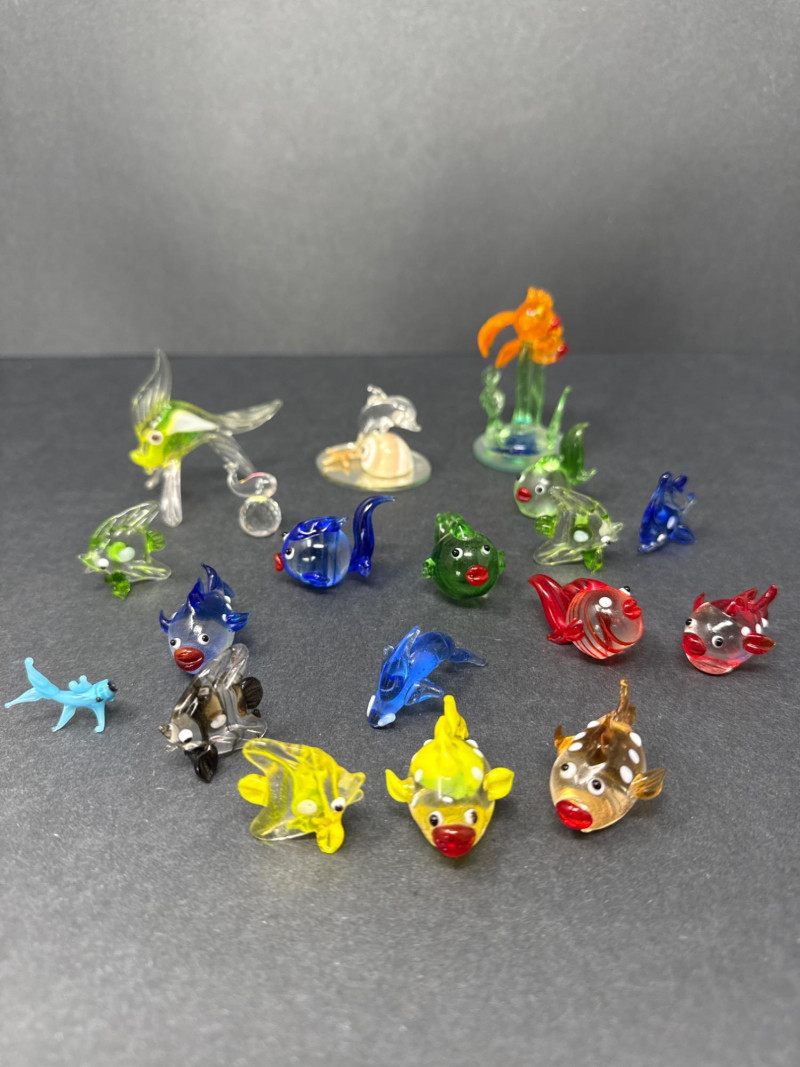 Collection of Miniature Art Glass Fish Figurines A vibrant and whimsical collection of miniature art glass figurines depicting fish and sea creatures in a variety of stylized forms. This decorative grouping showcases playful expressions, detailed fins, and a lively palette of red, blue, green, yellow, amber, and clear glass. Highlights include: Sculptural Pair: Two orange fish swimming among aquatic plants on a shared glass base Dolphin Scene: Dolphin leaping over a seashell, rendered in clear and blue glass Green Angelfish: With translucent fins and a vivid green body Small Dolphin: Deep blue glass with curved tail detail Small Shark: Light blue glass with stylized dorsal fin Assorted Fish: miniature fish in varied colors and patterns, each uniquely crafted