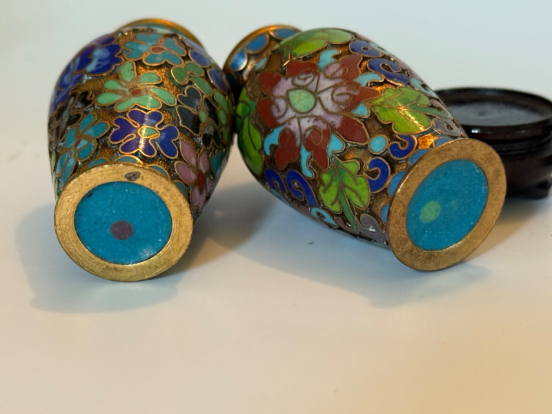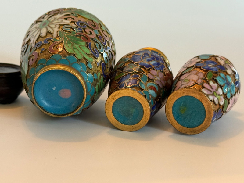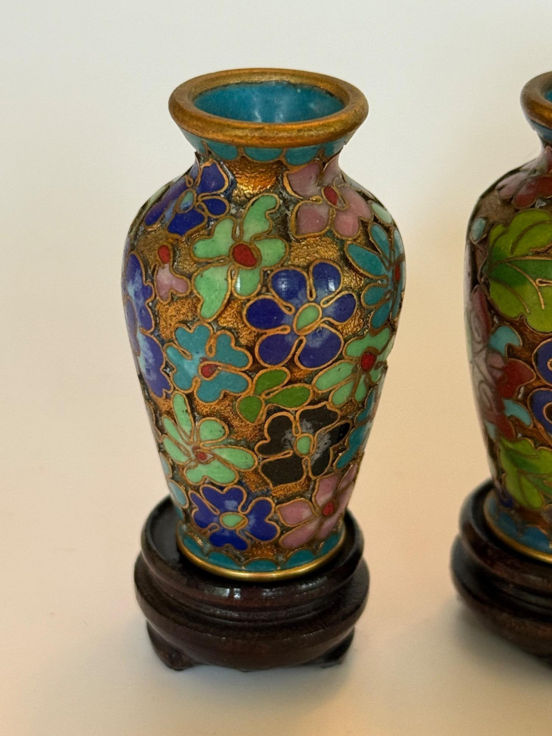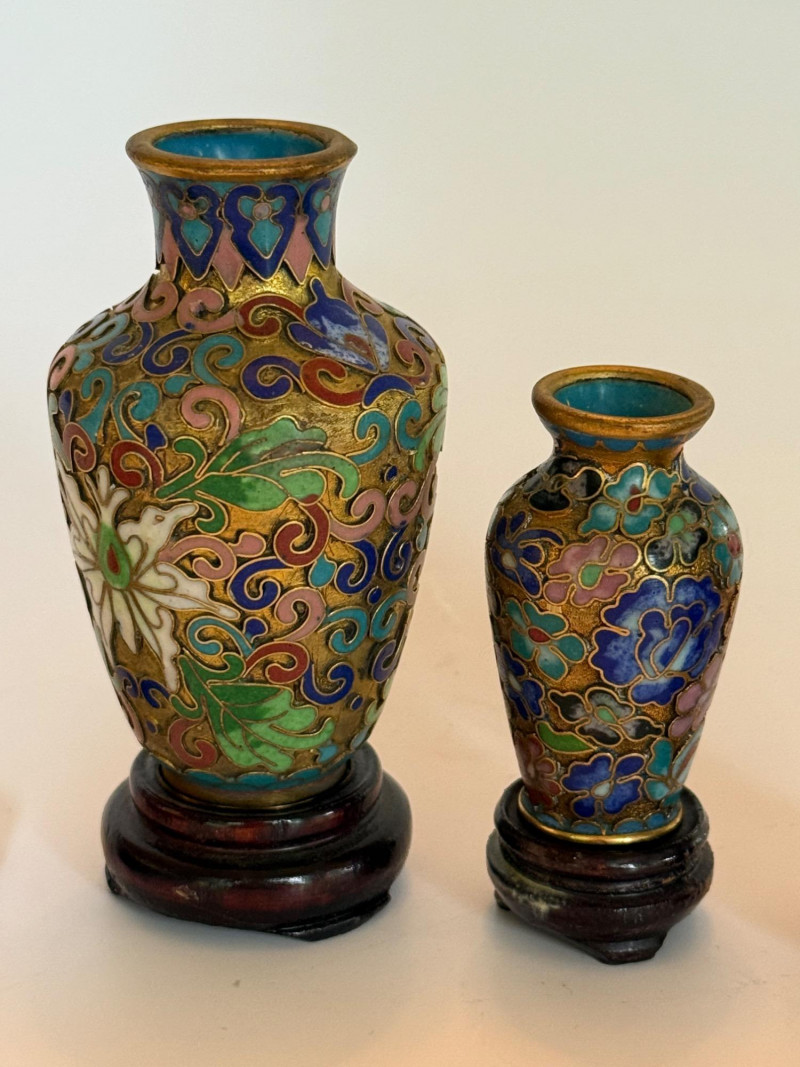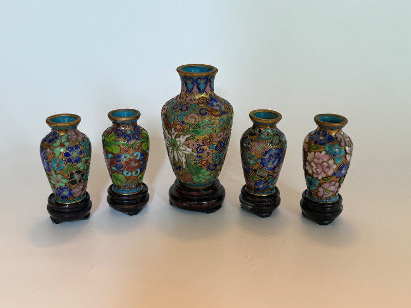 Set of Five Miniature Chinese Cloisonné Vases with Stands A collection of five miniature Chinese cloisonné vases, each exquisitely adorned with multicolored floral and foliate motifs outlined in delicate gilt wire. The designs feature vibrant blossoms and scrolling foliage in rich hues of blue, green, pink, red, and turquoise. Interiors and bases are finished in classic turquoise enamel, enhancing their traditional appeal. Each vase is paired with a finely carved wooden stand, perfectly fitted to elevate its display. Dimensions: Approx. 2" – 3" tall Set Includes: (1) Tall cloisonné vase with multicolor floral design (4) Smaller cloisonné vases, each with unique floral and foliate patterns (5) Fitted carved wooden stands