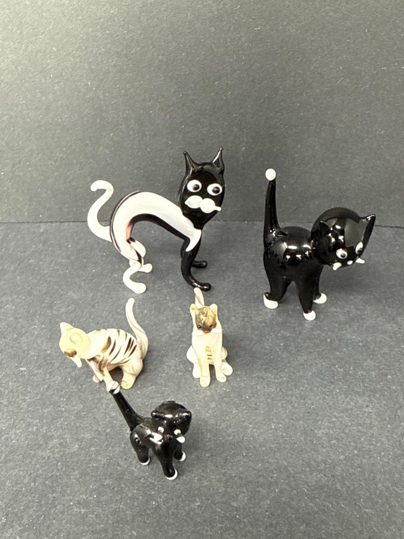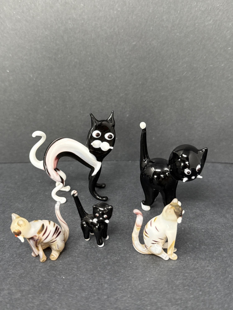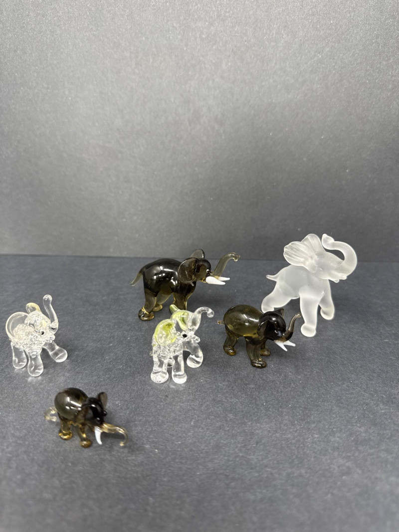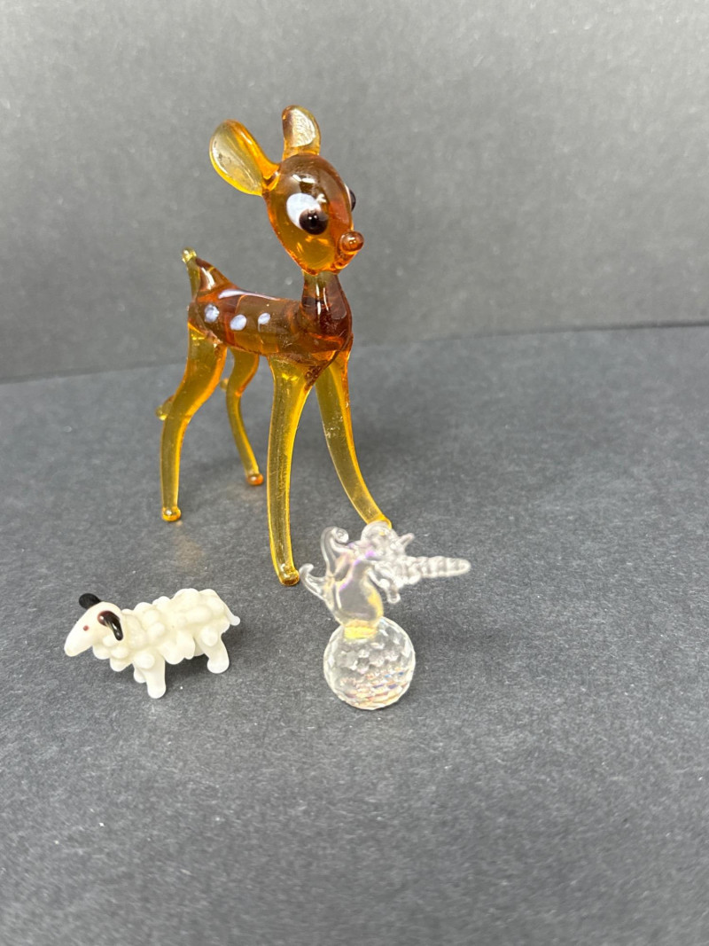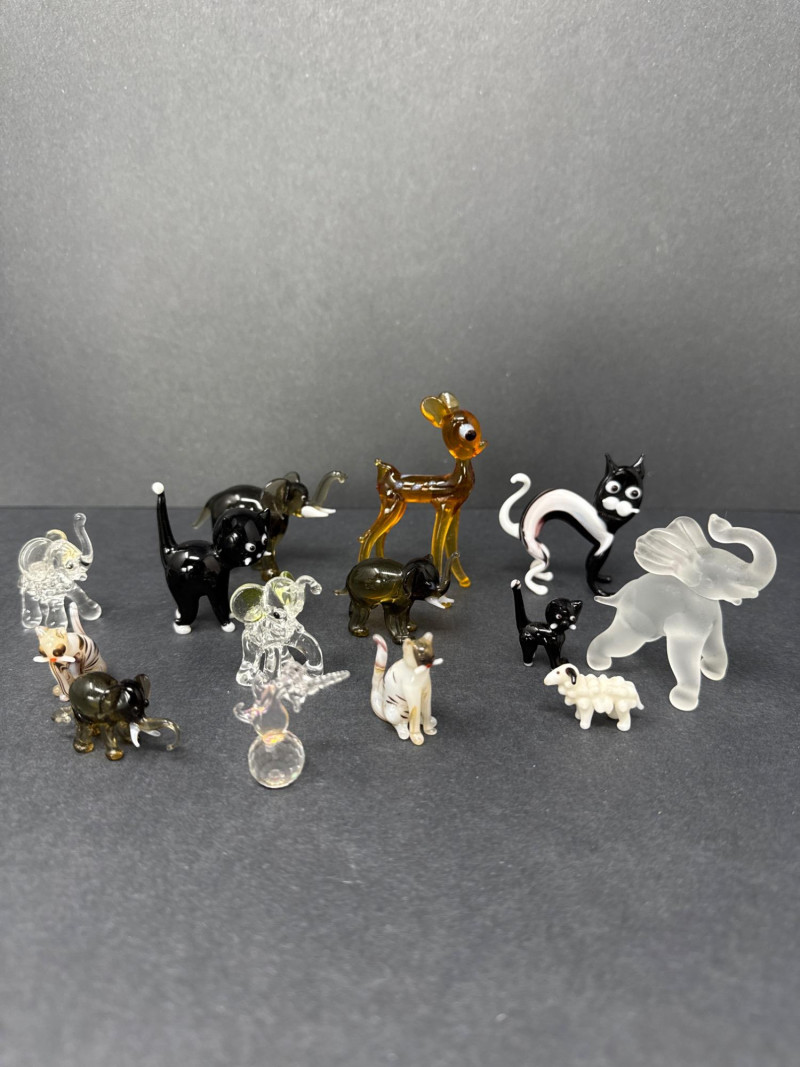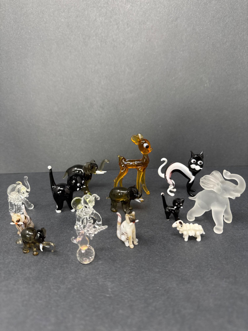 Collection of Miniature Figurines – Elephants, Cats, Deer & More A group of miniature glass figurines, showcasing a variety of animals in different glass finishes including clear, frosted, black, amber, and striped designs. Each piece demonstrates delicate craftsmanship with fine details such as curled tails, raised trunks, and expressive faces. Set Includes: Elephants: Clear, frosted, amber, and black variations with raised trunks Cats: Black, striped, and stylized designs with curled tails and whimsical expressions Deer: Amber-toned glass with white spotted detail Sheep: White glass with textured wool effect Dog: Dark glass miniature Other Animals: Clear glass unicorn atop a sphere, plus an additional small animal form Dimensions: