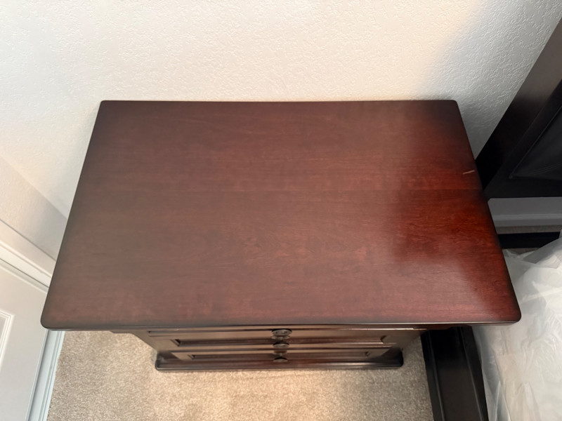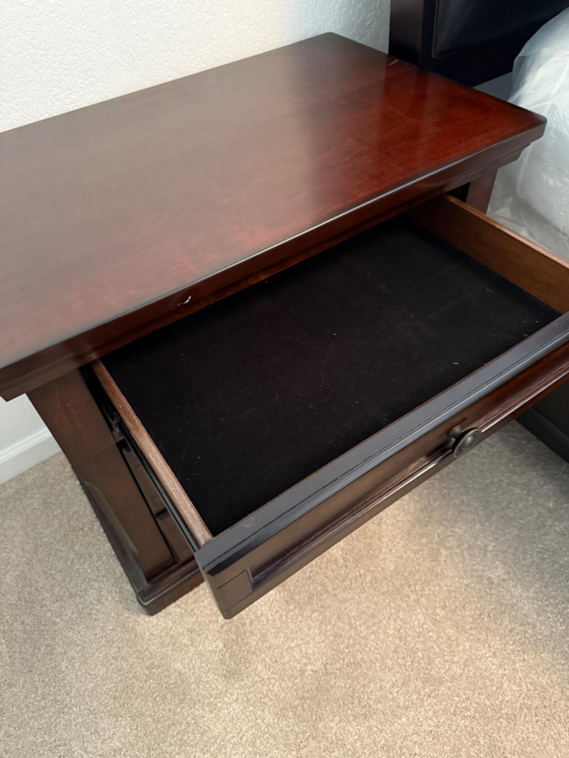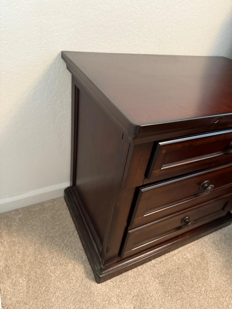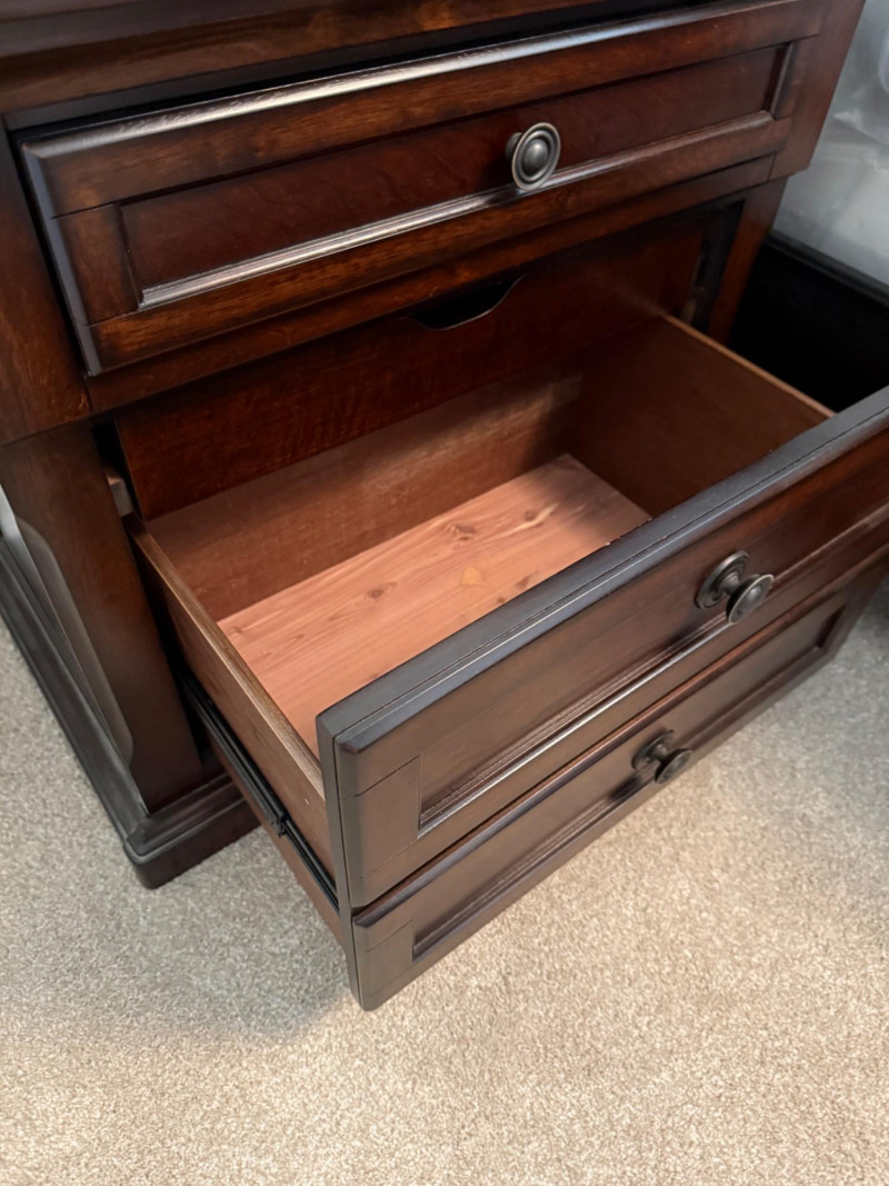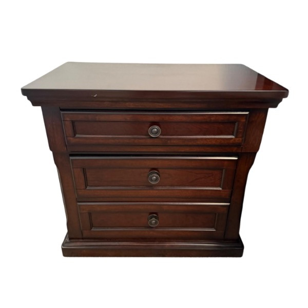 Ashley Furniture Millennium “Porter” Two-Drawer Nightstand Traditional nightstand from the Ashley Furniture Millennium Porter Collection. Crafted with select hardwood solids and veneers, finished in a burnished deep brown tone. Designed with paneled drawer fronts, crown-moulded top, and round dark bronze-tone pulls. Features two smooth-gliding dovetail drawers for storage, with the top panel styled as a decorative false front to create a three-drawer appearance. Marked on back label Model B697-92 – Made in Vietnam.