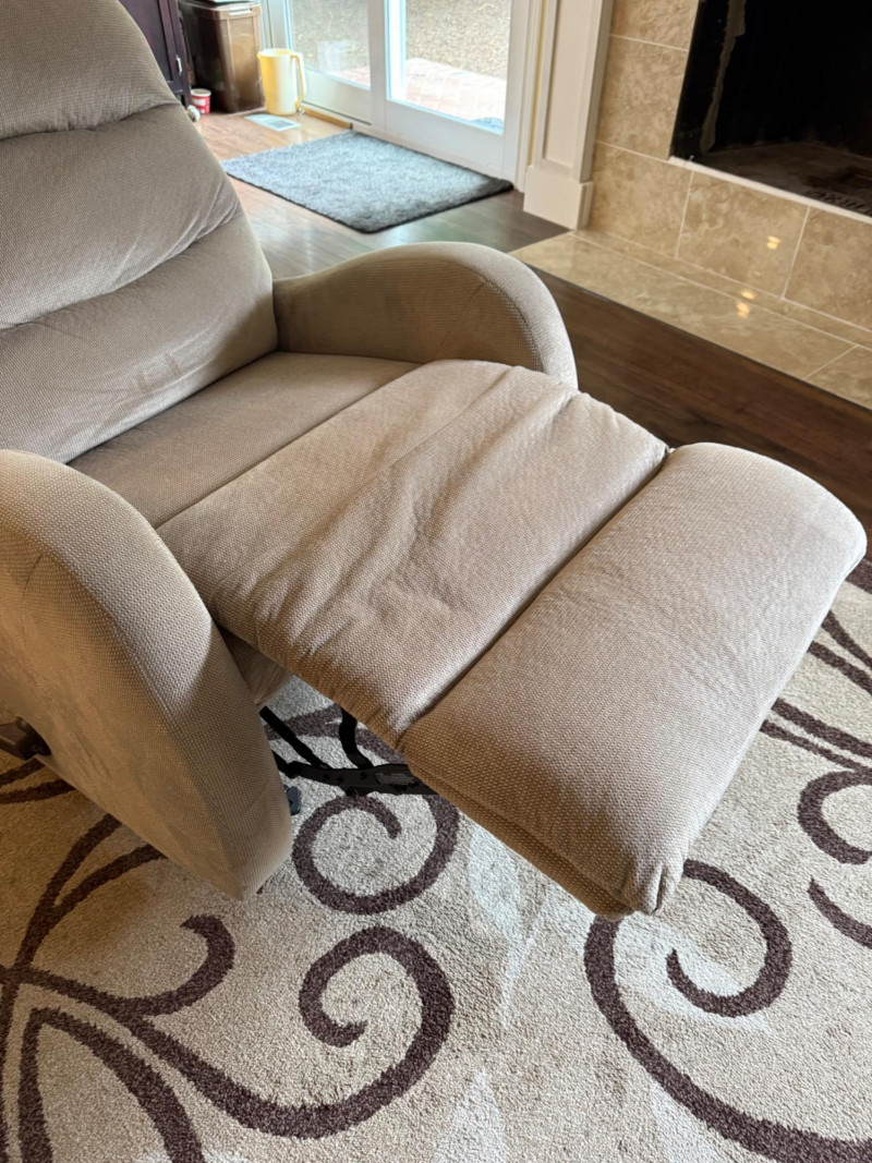 Southern Motion Style Beige Recliner Chair Southern Motion upholstered recliner, Style 1150, finished in a neutral beige fabric. Features a plush channel-tufted back, pillow-style arms, and manual reclining mechanism with extendable footrest. Designed for comfort and support, suitable for living room or lounge use.