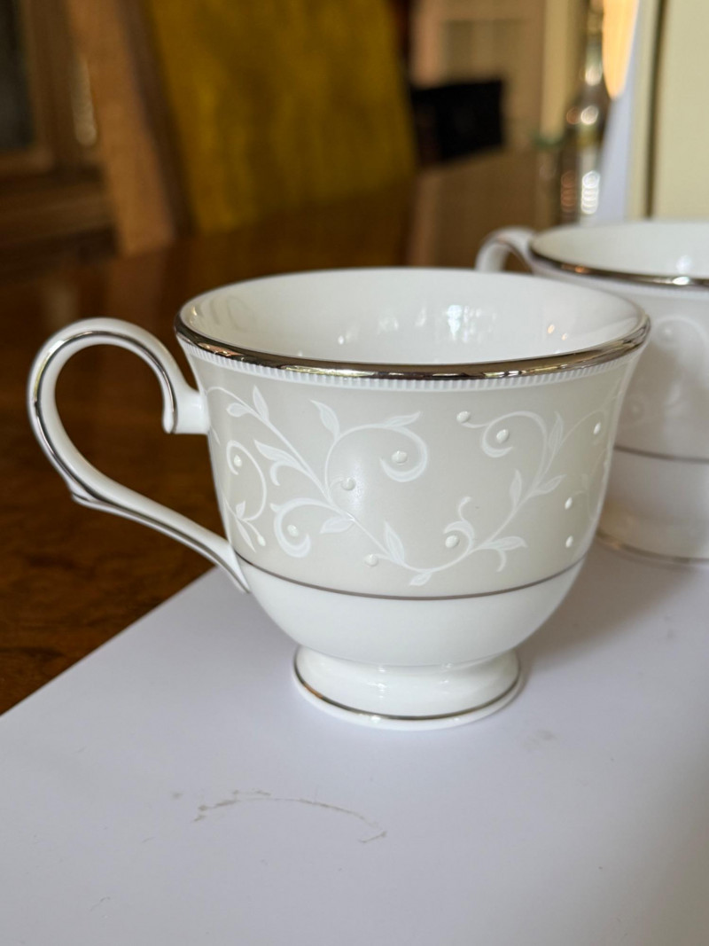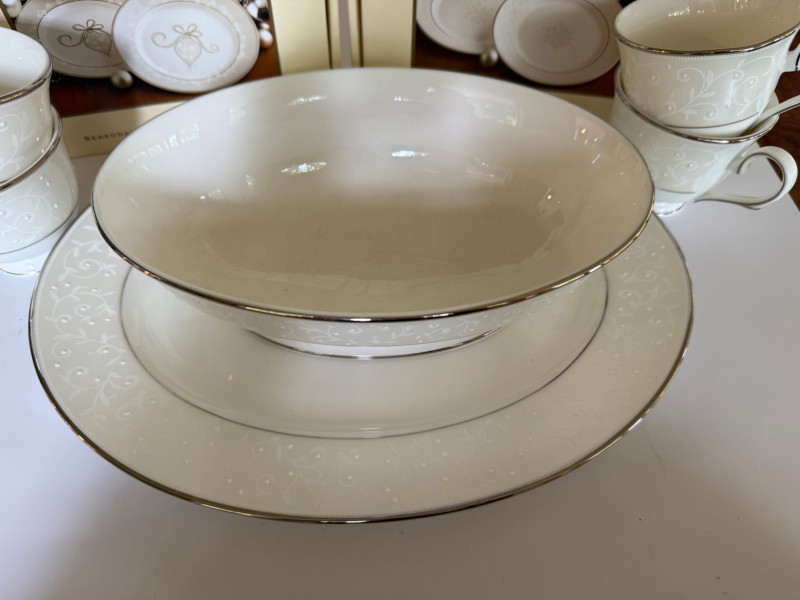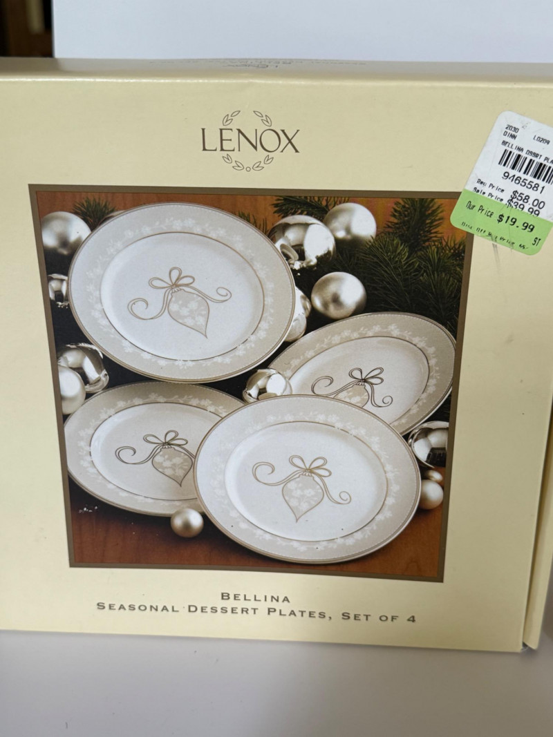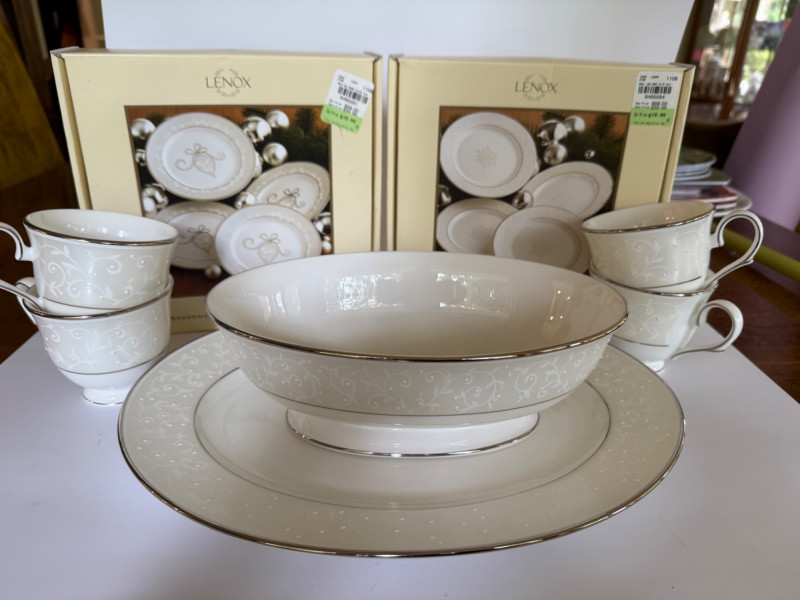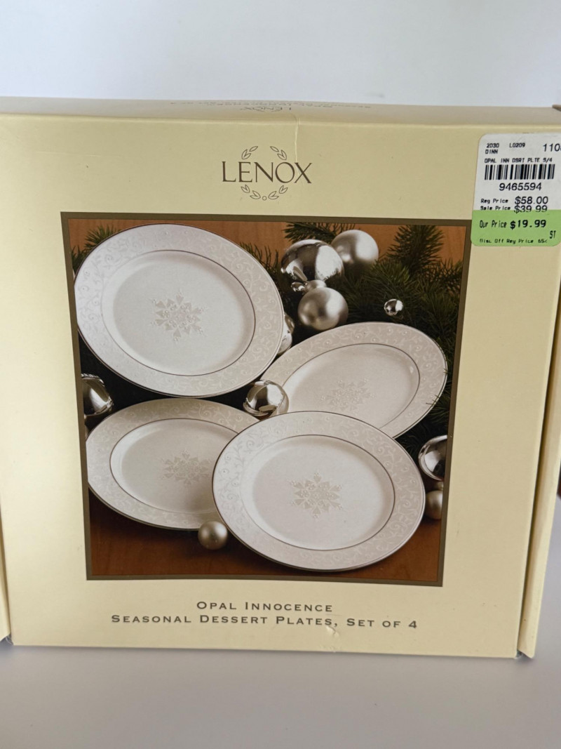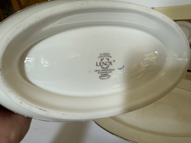 Main Dinnerware – Opal Innocence (Classics Collection) Serving Bowl: (oval) Round Serving Plate: Cups (4): Each approx. 6 oz capacity Pattern/Design: Ivory bone China with flowing vine scrolls, enameled pearl-like dots, and platinum trim on an opalescent background Marking: “Lenox Classics Collection – Opal Innocence,” made in China (other production runs also made in USA) Care: Dishwasher safe Boxed Dessert Plate Sets Set A – Opal Innocence Seasonal Dessert Plates (4) Plates, each approx. 8" wide Snowflake motif with platinum trim Set B – Bellina Seasonal Dessert Plates (4) Plates, each approx. 8" wide Ornament and ribbon motif with platinum trim Set Includes (4) Lenox Opal Innocence cups (6 oz each) (1) Lenox Opal Innocence serving bowl (1) Lenox Opal Innocence round serving plate (1) Boxed set of 4 Lenox Opal Innocence seasonal dessert plates (snowflake design) (1) Boxed set of 4 Lenox Bellina seasonal dessert plates (ornament design, 8" wide)