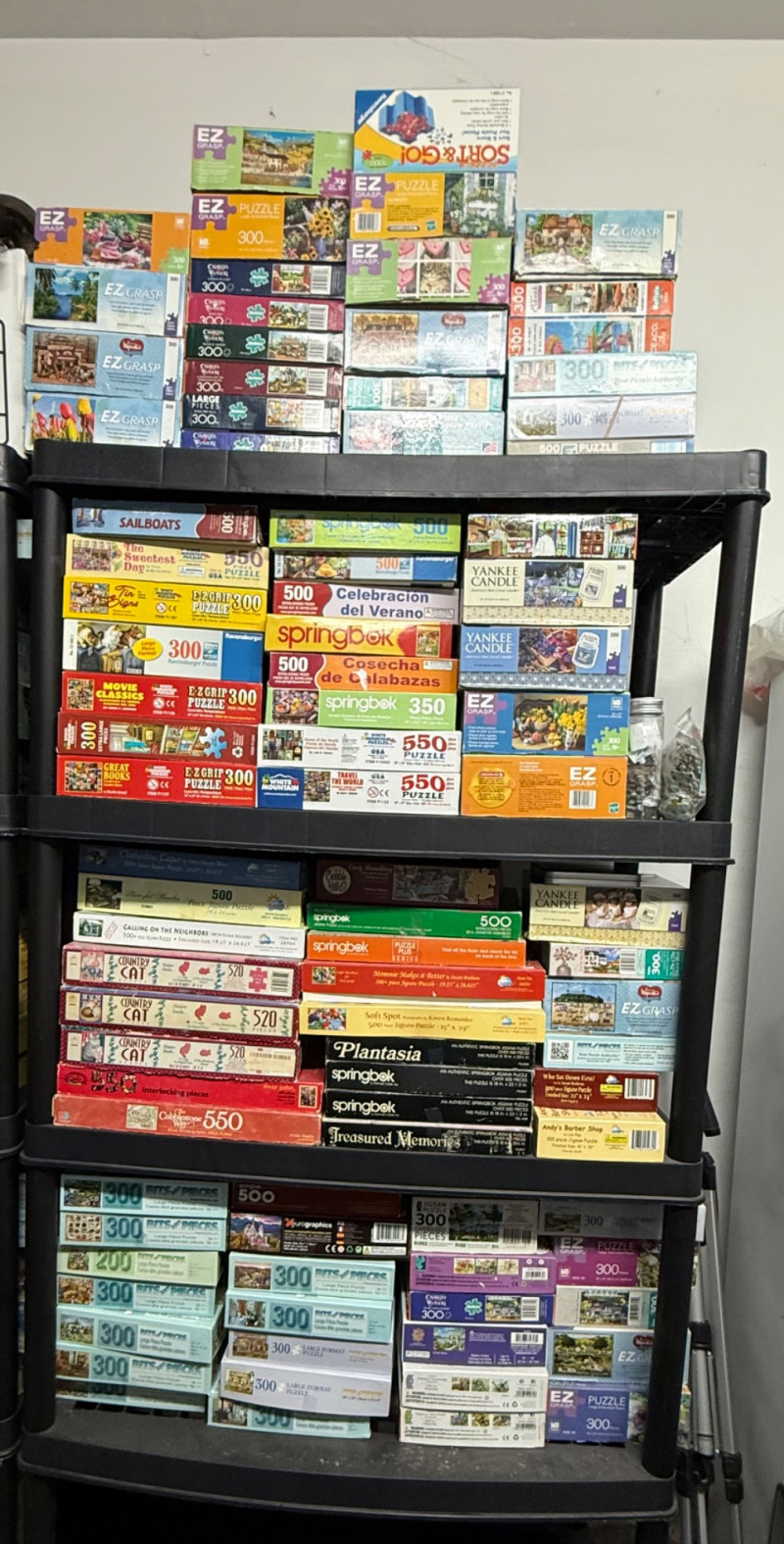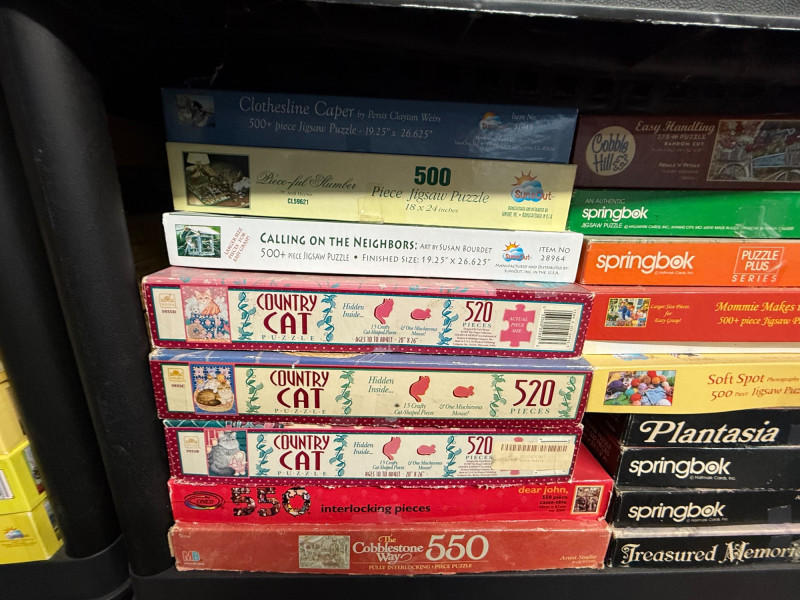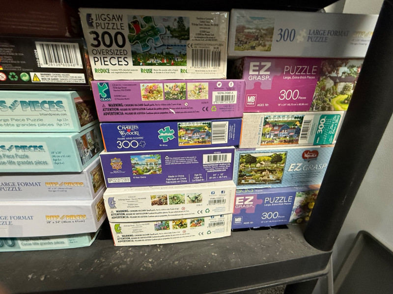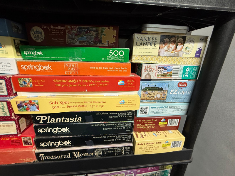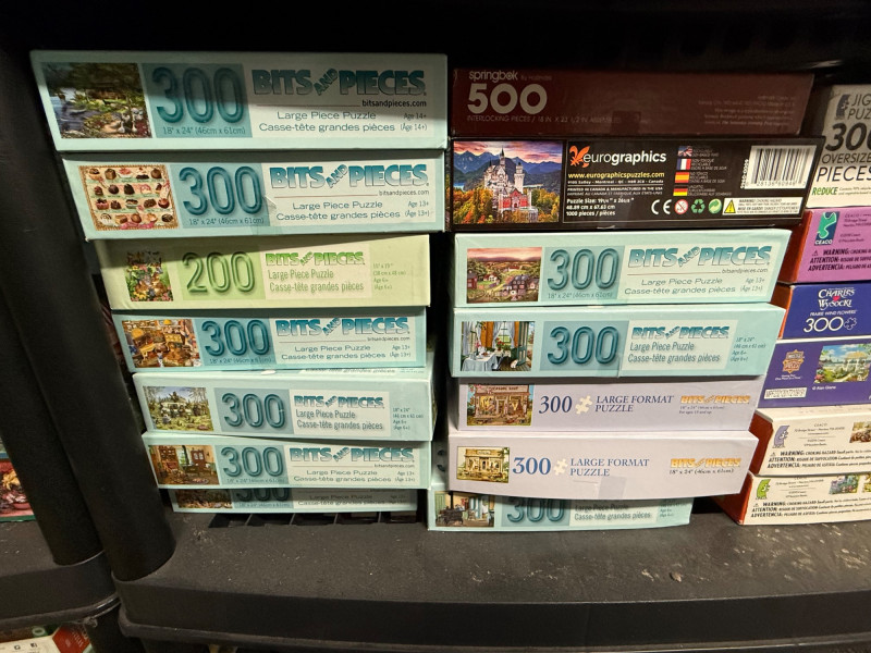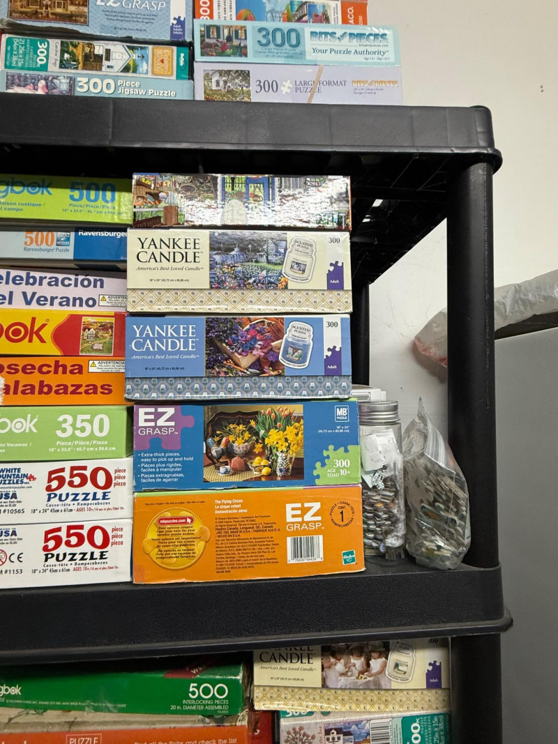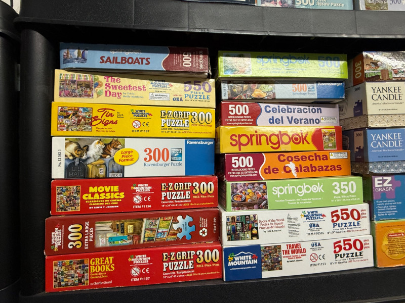 Brands Included: EZ Grip / EZ Grasp – Several 300-piece puzzles with bright box designs, often featuring flowers, landscapes, and animals Springbok – 350-piece and 500-piece puzzles, including seasonal themes like Cosecha de Calabazas and Celebración del Verano Yankee Candle – Cozy home and lifestyle imagery Bits and Pieces – Numerous 300-piece boxes (bottom shelf left) SunsOut – A few larger 550-piece puzzles Assorted / Other – Includes titles like Movie Classics, Great Books, Country Cat, and novelty puzzles Piece Counts: Mostly 300-piece – Dominated by EZ Grip/EZ Grasp and Bits and Pieces 500-piece – Found in Springbok, Yankee Candle, and select others 350–550-piece – Includes Springbok’s 350-piece and SunsOut’s 550-piece selections Themes & Styles: Nature & Landscapes – Tulips, sailboats, gardens, mountains Seasonal / Holiday – Fall harvest, winter holiday scenes Cultural & Lifestyle – Movie classics, literature, sweet shop, cats Novelty – Includes Sort ’n Go puzzle accessory (top shelf) and themed collectible setsLarge Assorted Puzzle Collection #1