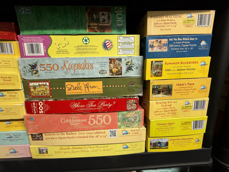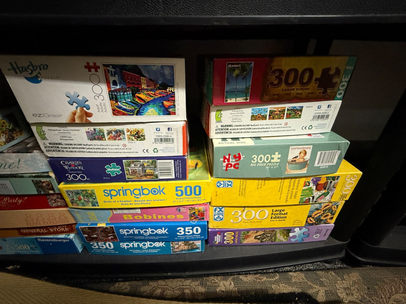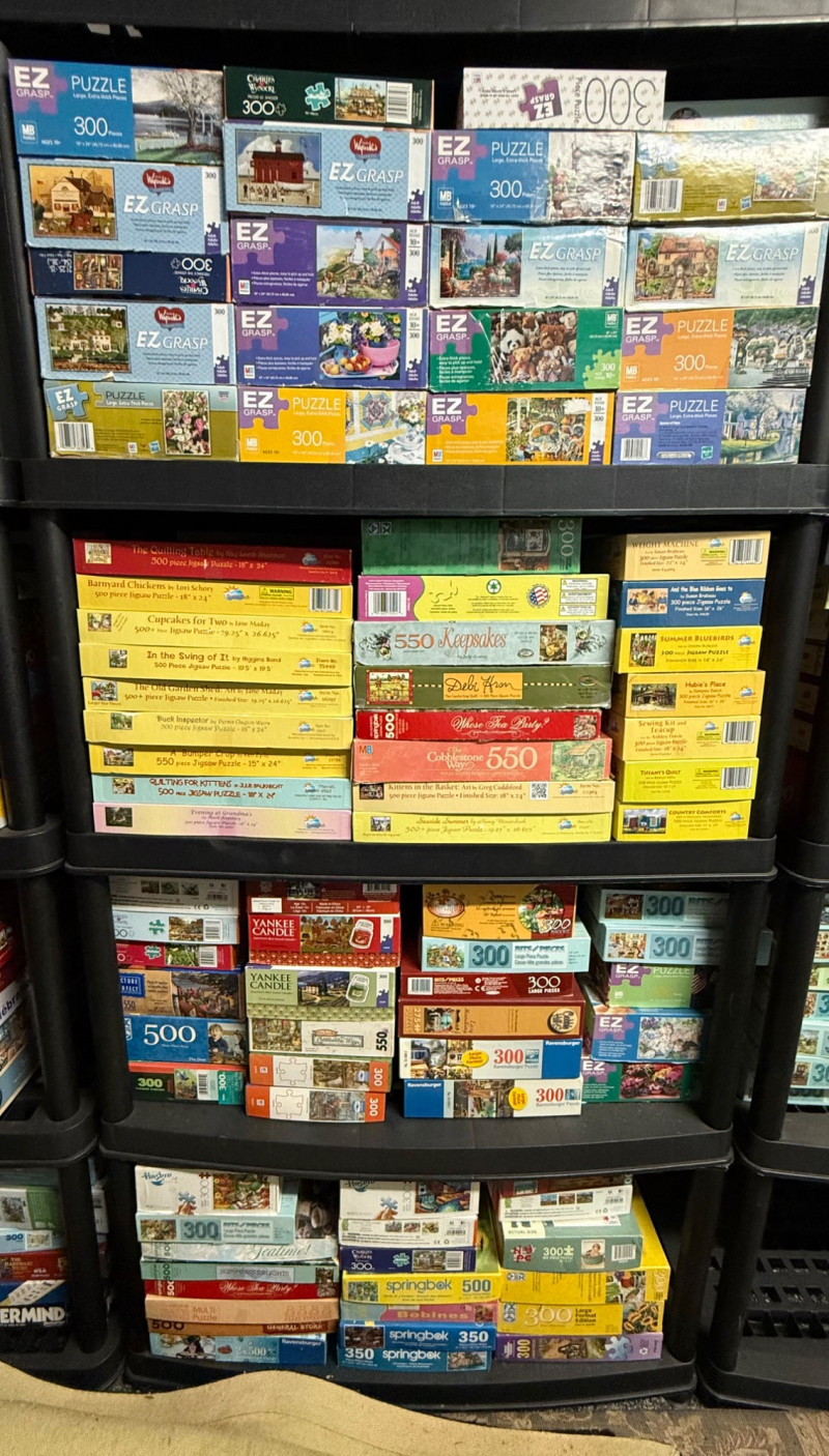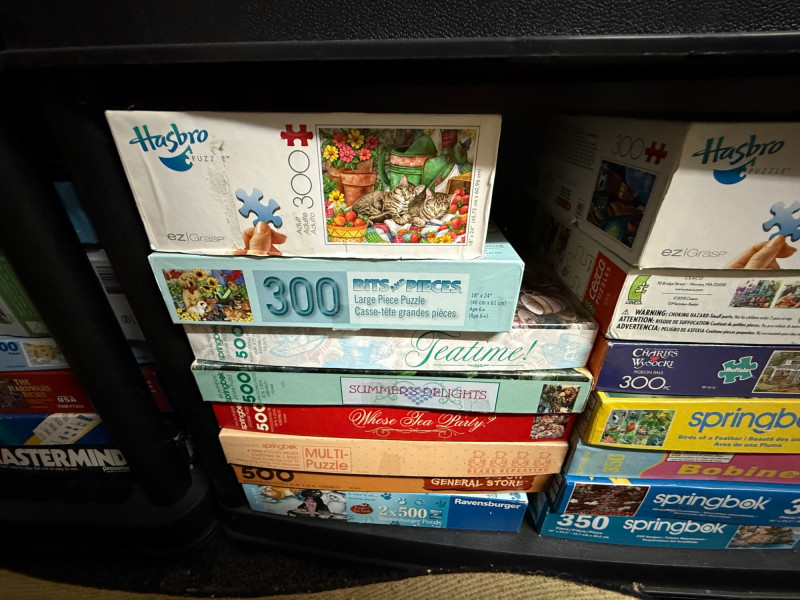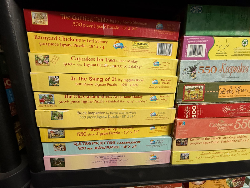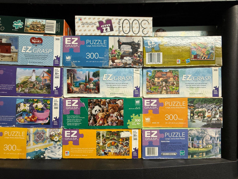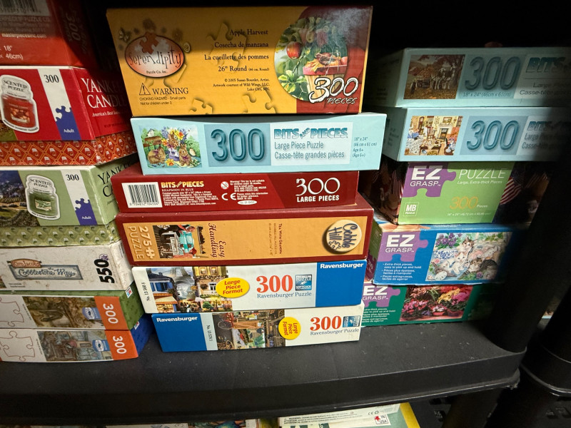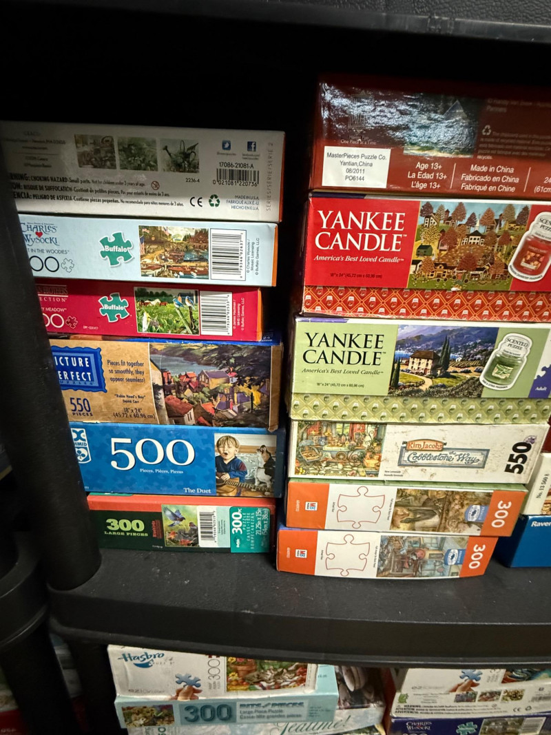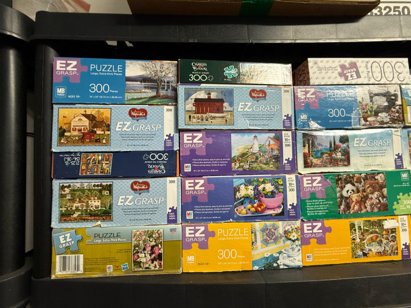 Themes: Scenery, animals, seasonal, artwork, novelty, and branded designs EZ Grasp (MB / Milton Bradley): Scenery, animals, houses, still life, floral Hasbro: Holiday & seasonal themes Yankee Candle: Branded candle imagery Ravensburger: Landscapes and artistic scenes Mixed Brands: Assorted illustrations and scenes Springbok: Landscapes, artwork, novelty themes SunsOut Titles: “The Quilting Table” “Barnyard Chickens” “Cupcakes for Two” “In the Swing of It” “The Old Curiosity Shop” Other assorted titles Springbok: Mixed imagery box designs Hasbro: General scenery and festive scenes Keepsakes: Debbie Mumm Artist Series Cobble Hill / MB Assorted Titles: “Where the Flock Is” “Sewing Kit” “Summer Bluebirds” “Tiffany’s Quilt” “Huber’s Place” “Country Companions”Large Assorted Puzzle Collection #2