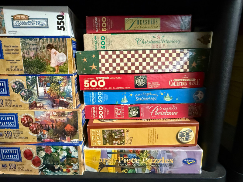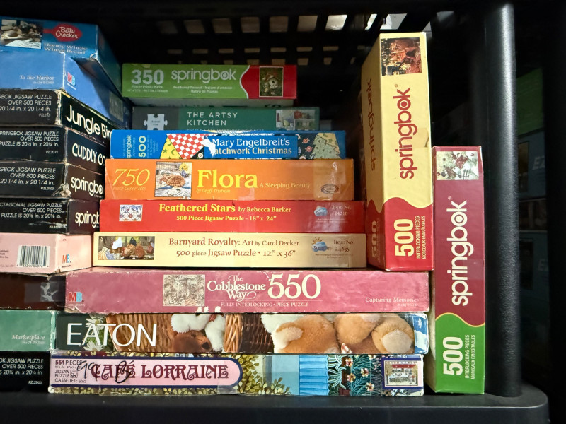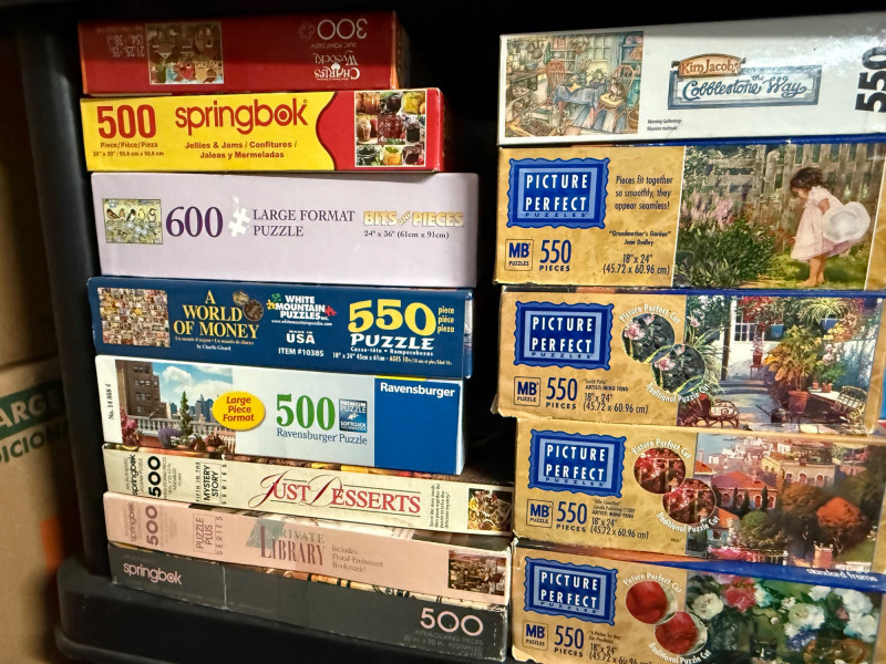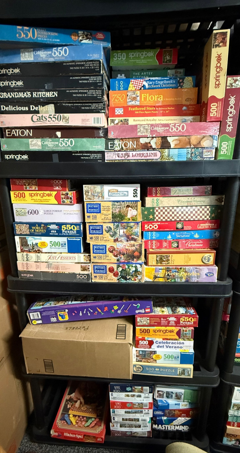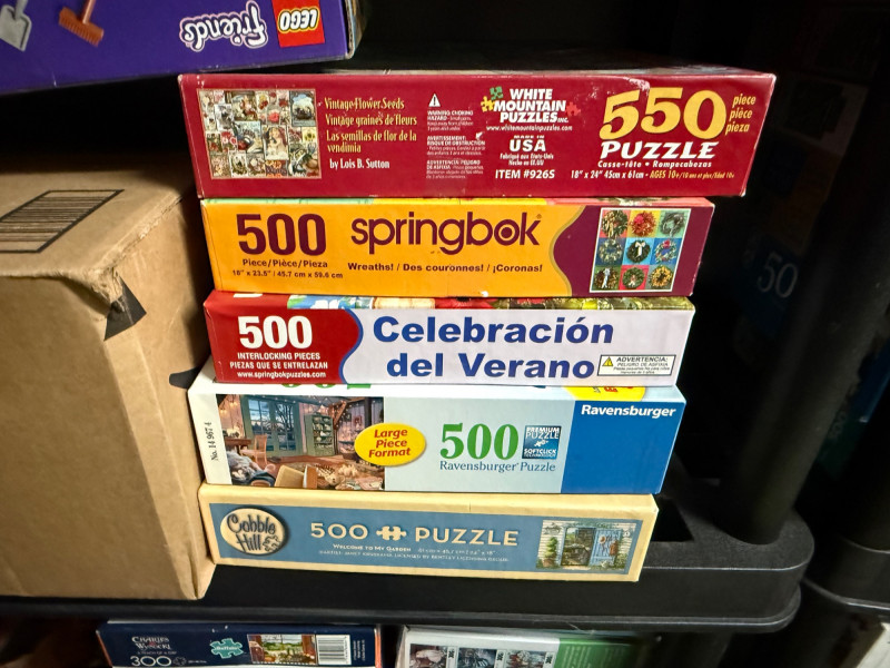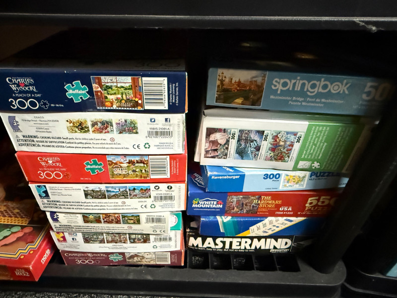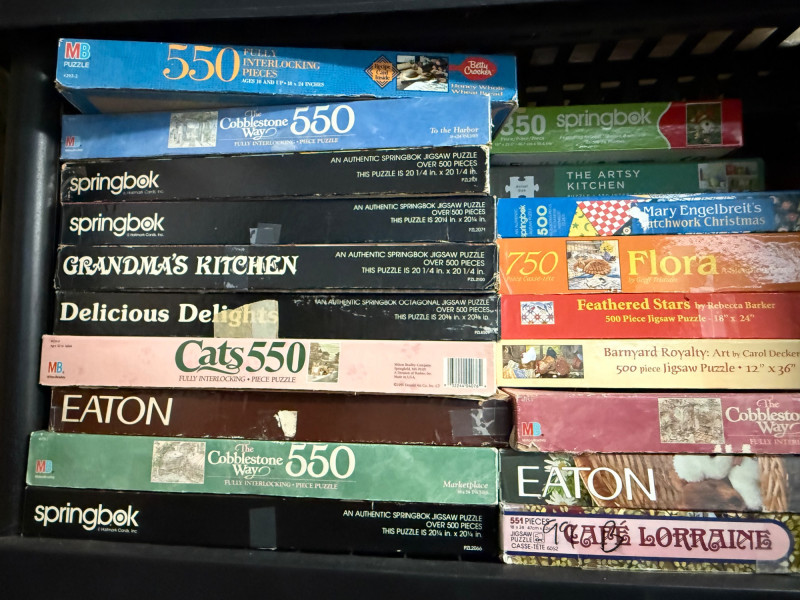 Brands & Publishers Springbok – Beloved titles like Grandma’s Kitchen, Delicious Delights, Cats, Flora, Celebración del Verano, and more Cobblestone Way – Several charming 550-piece puzzles Eaton – Assorted classic titles Ravensburger – 500-piece series including World of Money MB Puzzles / Picture Perfect – Scenic and seasonal 550-piece puzzles Other Makers – Includes Christmas Collection, Hidden Spiel, and large-format puzzles 300-piece 350-piece 500-piece (majority) 550-piece 600-piece (large-format) 750-piece Holiday & Christmas scenes Cats and animals Kitchen & food (Desserts, Grandma’s Kitchen) Nature & florals Scenic landscapes Money & educational puzzles Classic children’s and vintage European designs Over 40 boxed puzzles (various conditions) Mix of vintage and modern releases Bonus: boxed Mastermind game includedLarge Assorted Puzzle Collection #3