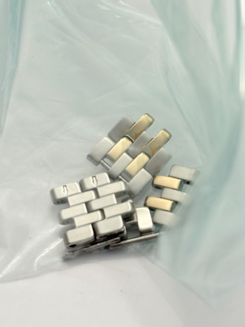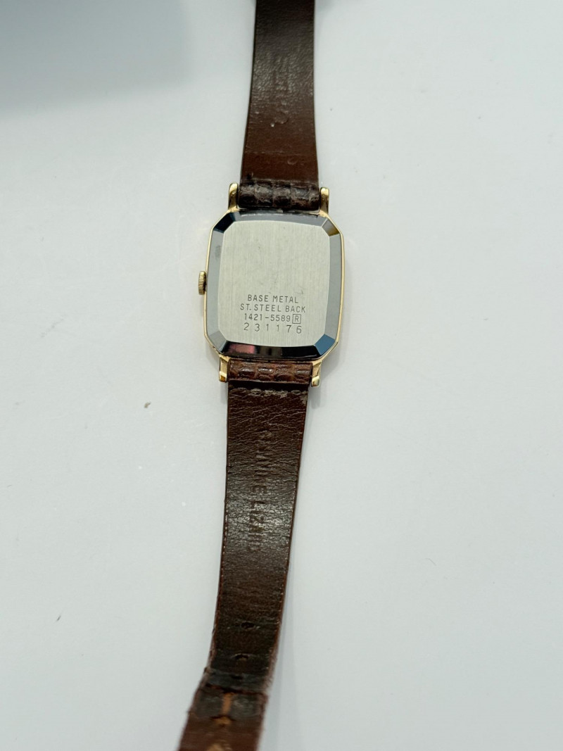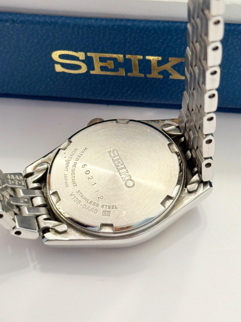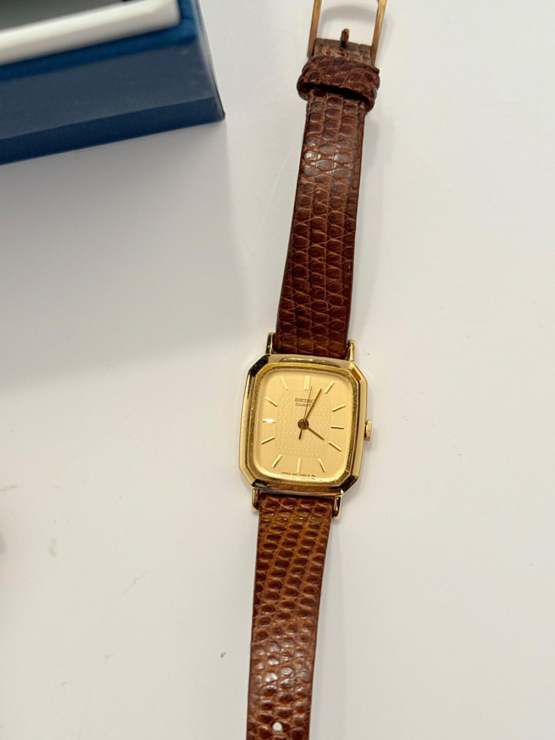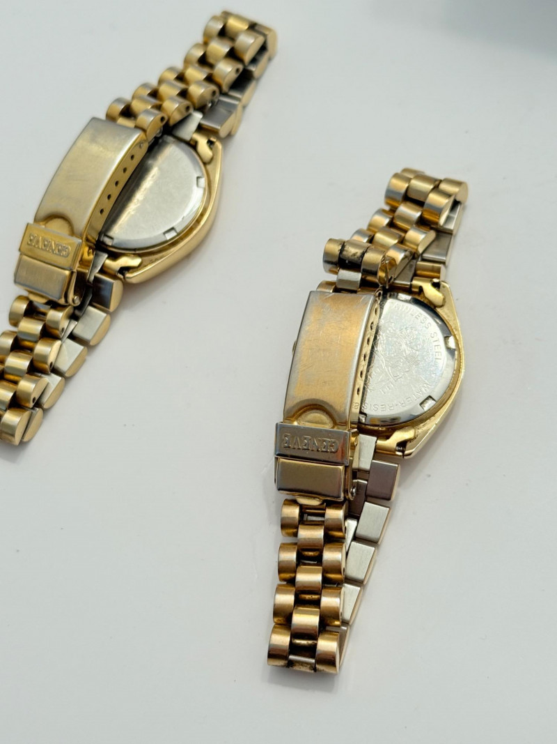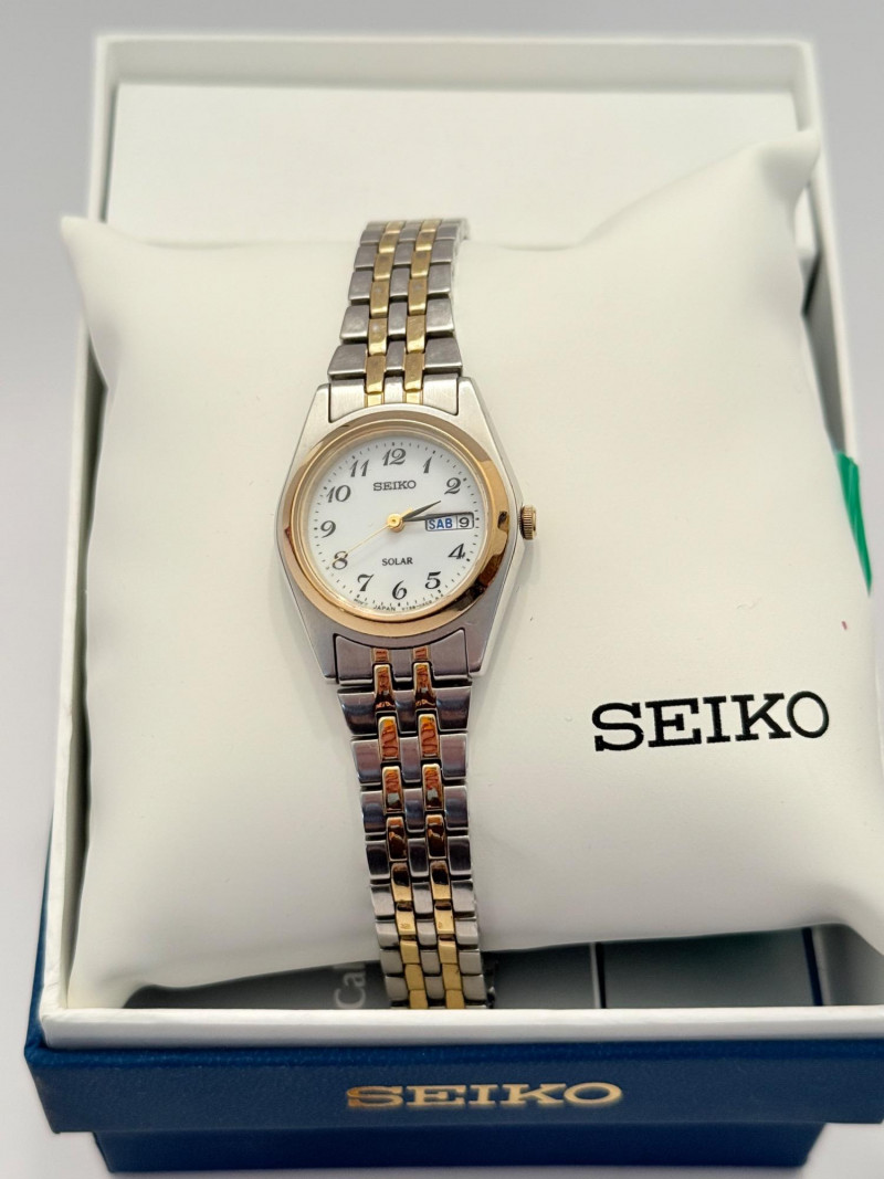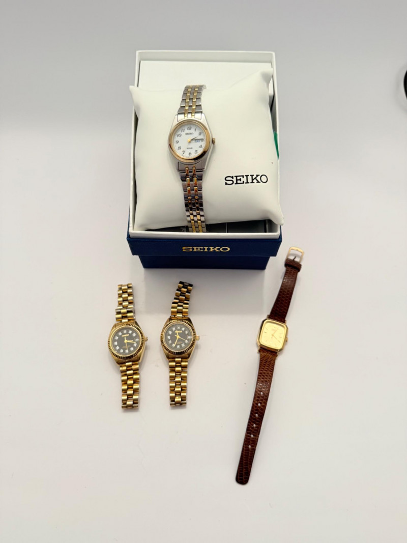 Model: Seiko SUT110 Movement: Solar quartz (Caliber V138) Design: Two-tone stainless steel (silver & gold-tone) Dial: White with Arabic numerals, date at 3 o’clock Condition: Appears new/unused, boxed with pillow Notable: Reliable solar-powered movement, elegant everyday style Brand: Geneva (fashion brand) Dial: Black with faux diamond markers, date window Bracelet: Gold-tone jubilee-style metal band Case Back: Stainless steel, marked “Geneva” Notable: Stylish and affordable; not luxury-grade Model: Seiko Quartz, Caliber 1421 Case: Gold-tone, rectangular shape Strap: Brown embossed leather Dial: Gold-tone with stick markers and seconds hand Era: Likely 1980s–1990s Notable: Vintage charm with minimalist elegance1. Seiko Ladies Bracelet Watch (Boxed)