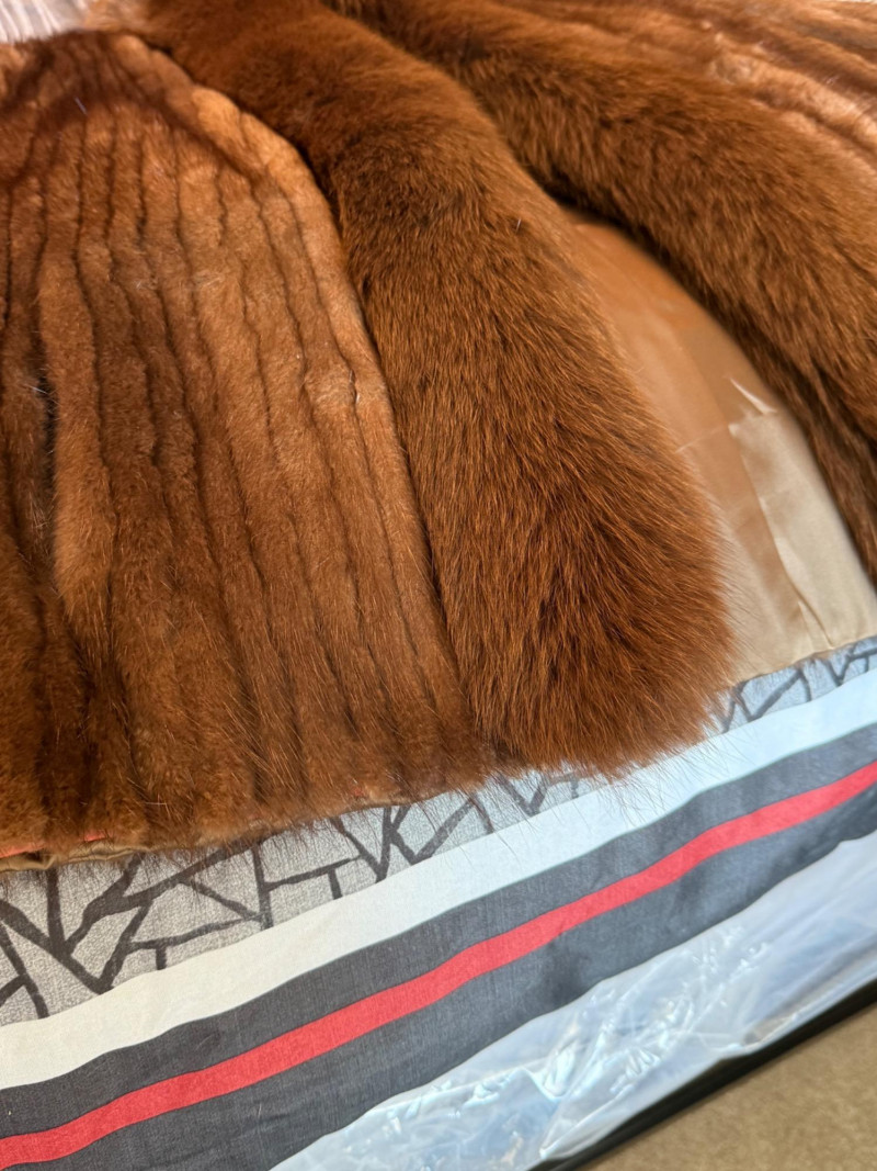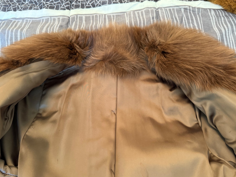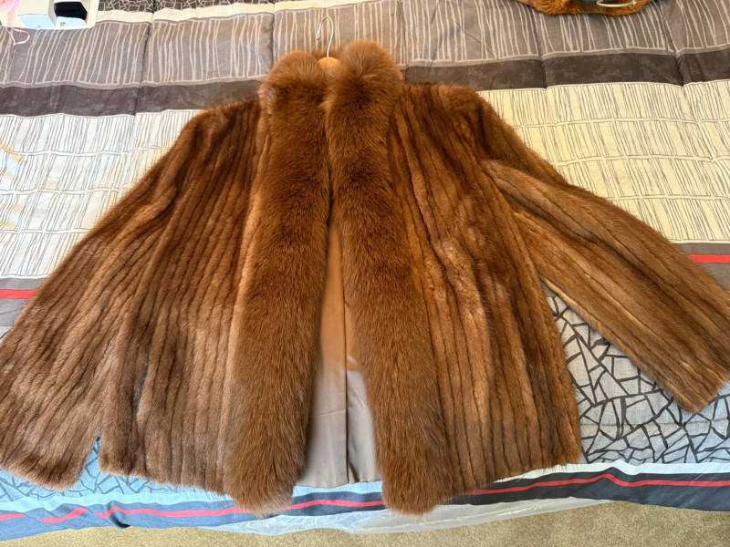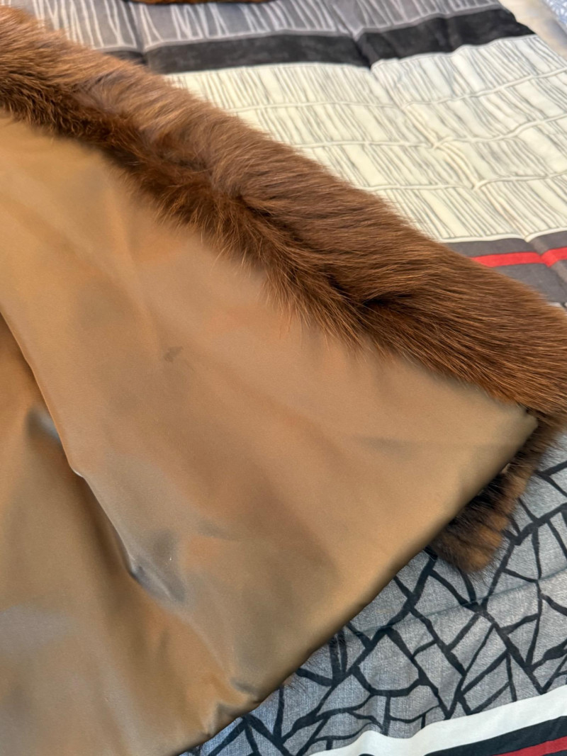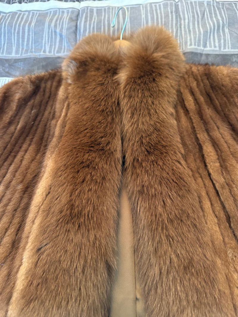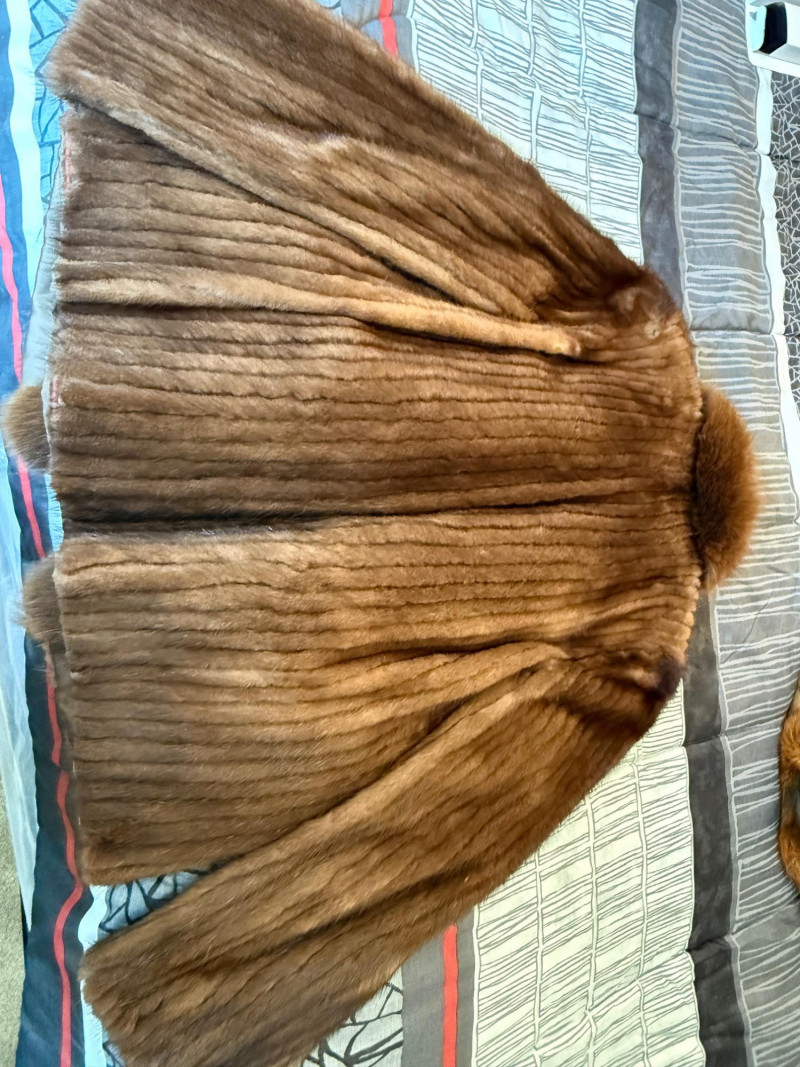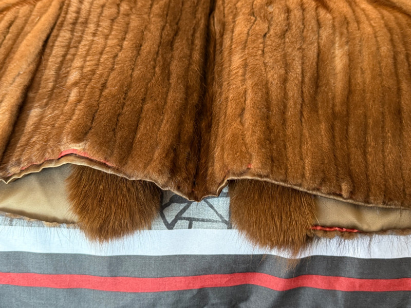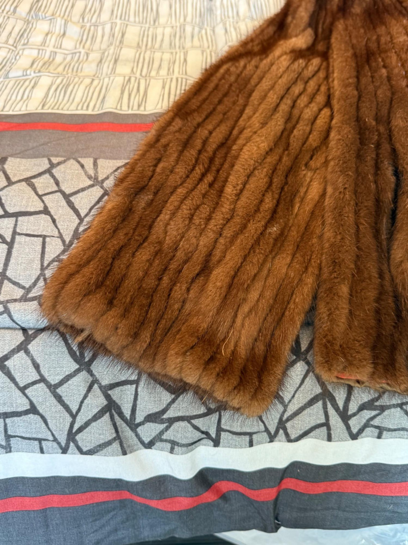 Vintage Mink Coat A vintage mid-length mink coat in natural brown, designed with vertical pelting and a full plush collar. Features long sleeves and a satin-like interior lining. Appears to be a women’s size small.