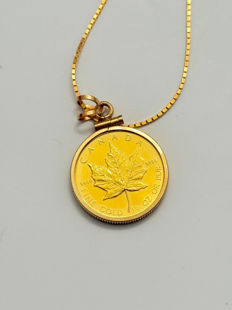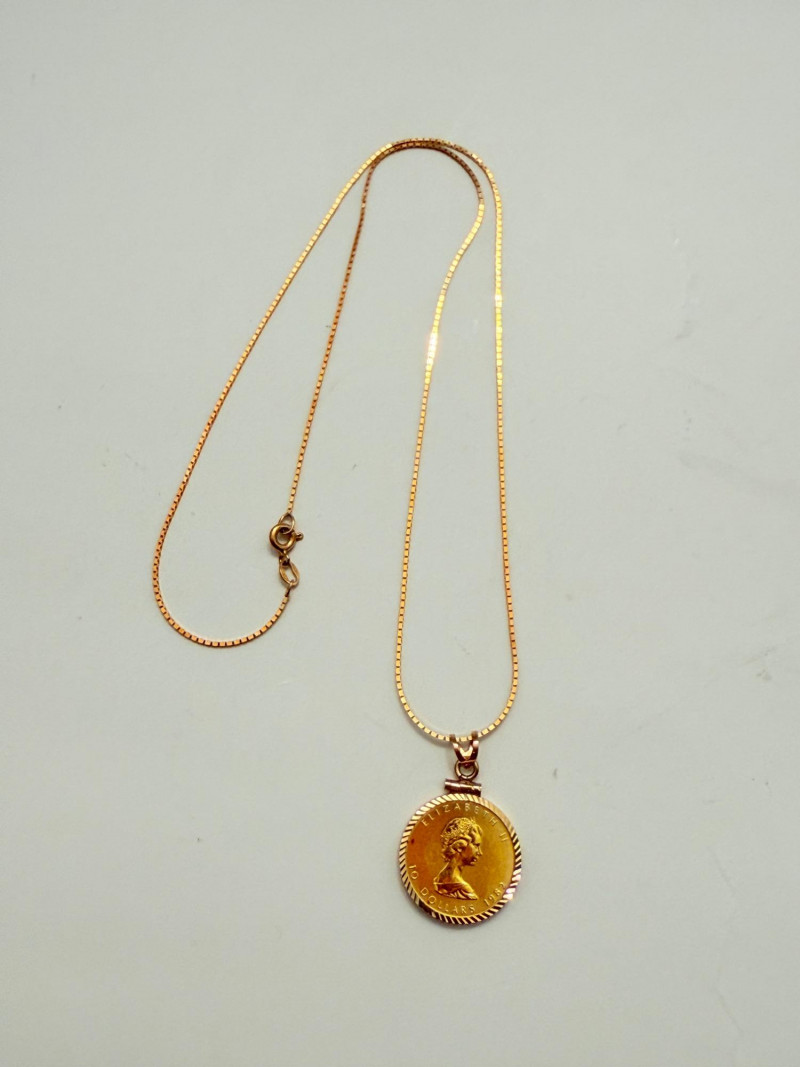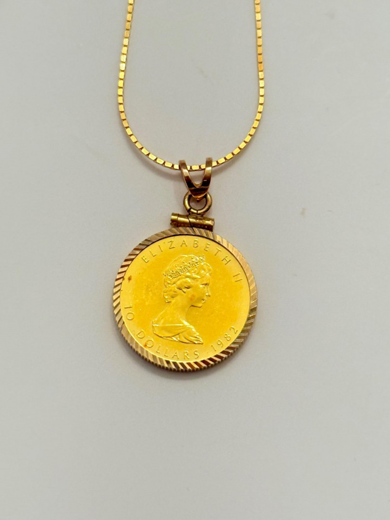 This elegant piece features a 1982 Canadian Gold Maple Leaf coin mounted in a custom 14K gold bezel and suspended from a matching 14K gold box-style chain. A perfect fusion of collectible bullion and fine jewelry craftsmanship. Coin Details: Obverse: Portrait of Queen Elizabeth II, inscribed “ELIZABETH II – 10 DOLLARS – 1982” Reverse: Iconic maple leaf design with “CANADA – FINE GOLD 1/4 OZ OR PUR” and .9999 purity marks Gold Content: 1/4 oz fine gold (.9999) Diameter: Approx. 22 mm Year: 1982 Jewelry Features: Bezel & Bale: Custom 14K gold bezel with integrated stamped 14K gold bale Chain: 14K gold box-style chain with spring ring clasp, stamped 14K Chain Length: 20 inches Total Weight (coin, bezel & chain): 11.8 grams1982 Canada $10 Gold Maple Leaf Coin Pendant on 14K Gold Chain