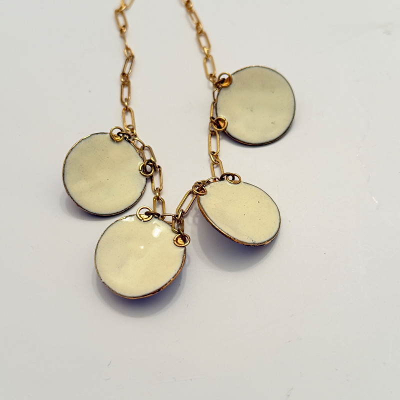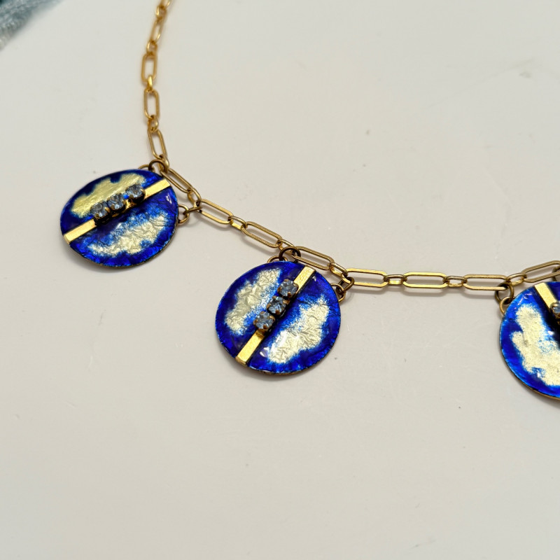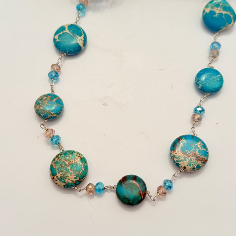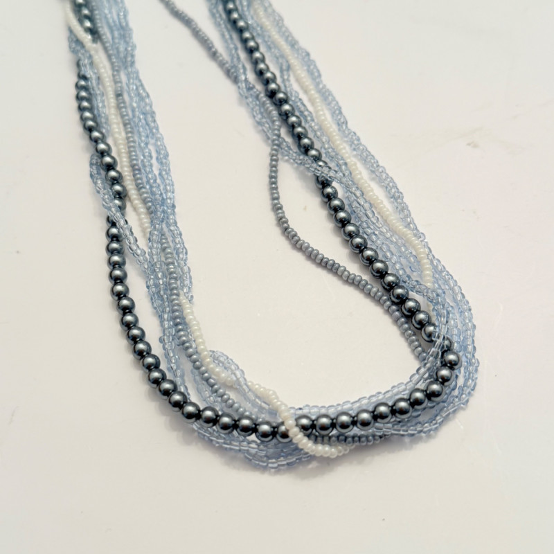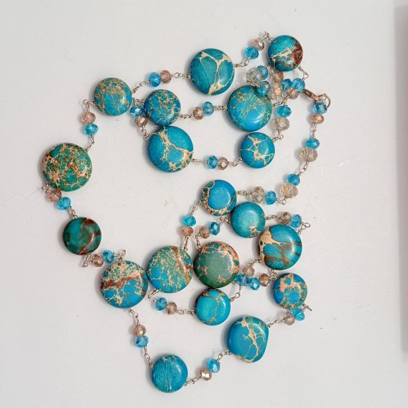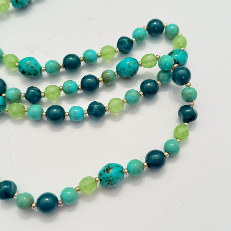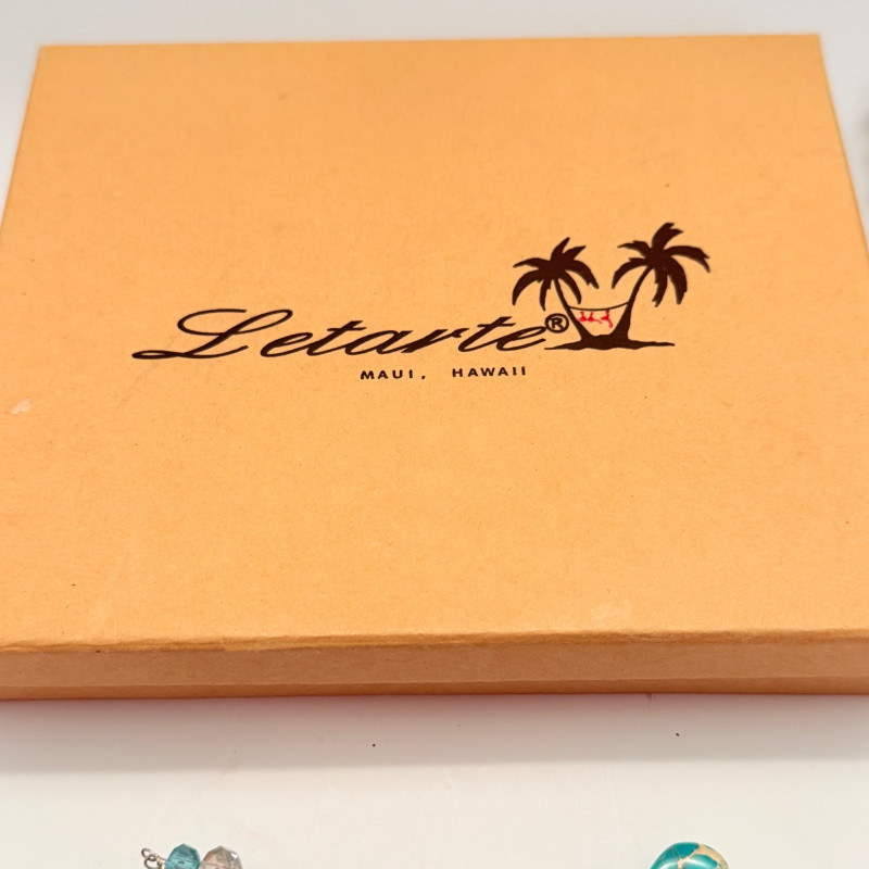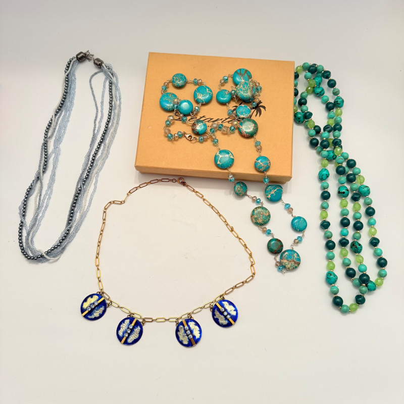 A vibrant mix of vintage and modern styles, this set showcases a variety of materials, colors, and craftsmanship. Perfect for collectors, fashion enthusiasts, or anyone looking to add a splash of personality to their jewelry box. Included Pieces: A. Multi-strand gray and silver beaded necklace with a secure barrel clasp. B. Gold-tone chain necklace featuring four circular blue and white enamel pendants. C. Long strand necklace with polished round beads in shades of green and blue. D. Turquoise-tone beaded necklace with large flat round beads and sparkling crystal accents, presented in a Letarte Maui, Hawaii box. Measurements: