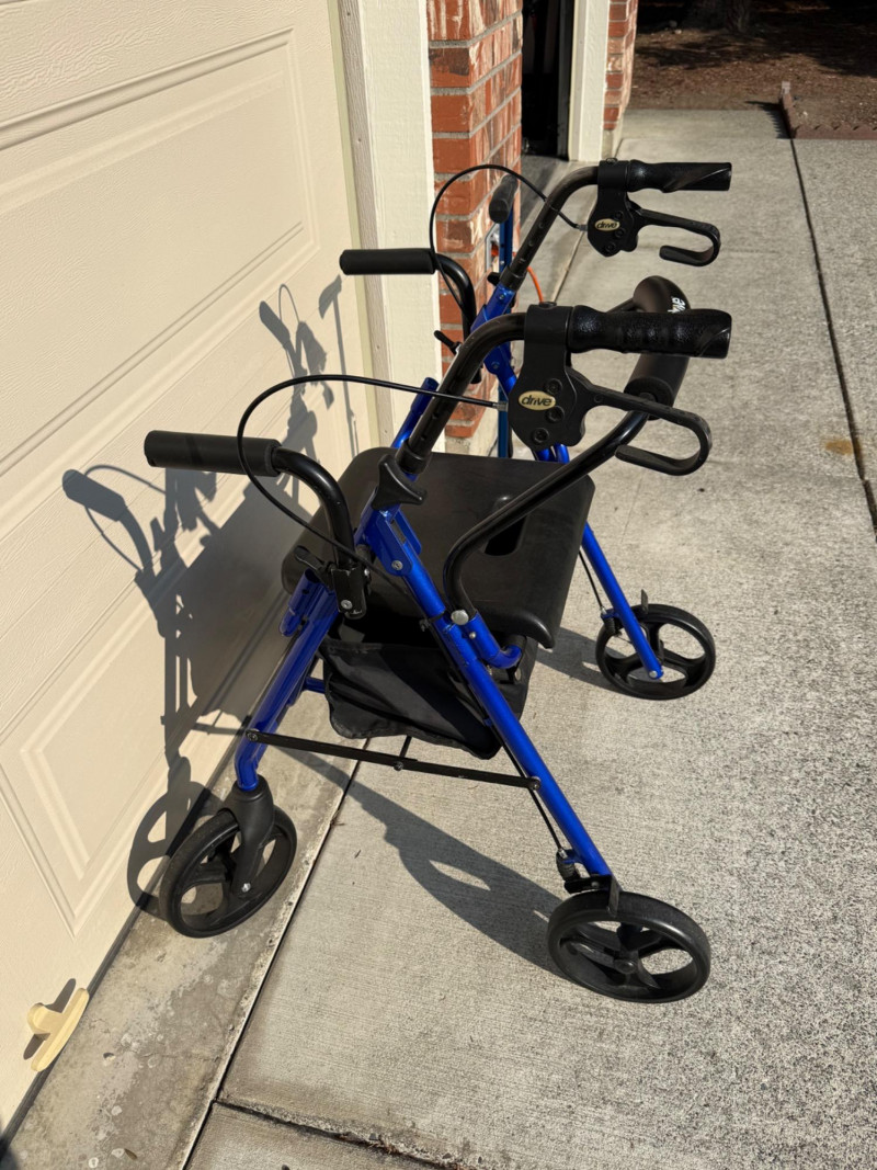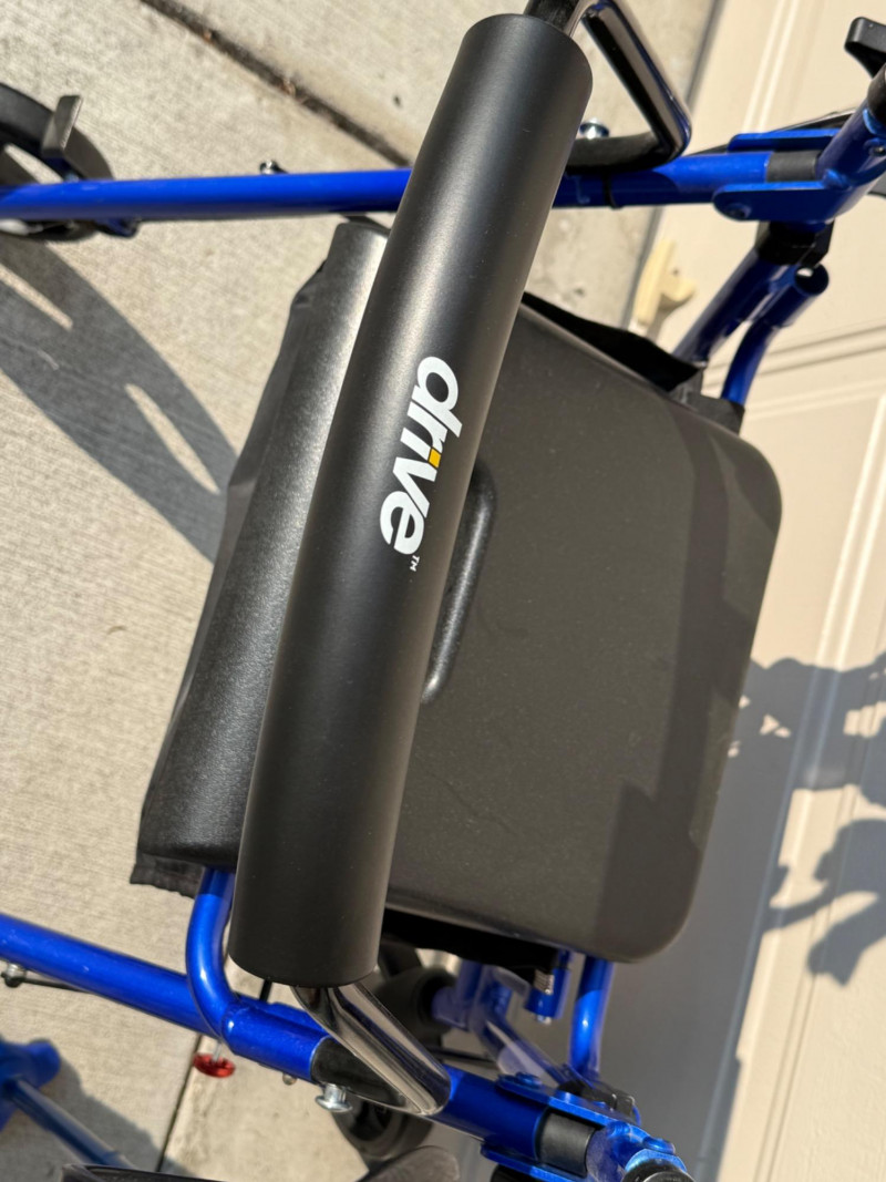 Seat & Backrest: Padded seat Fold-up, removable padded backrest Under-seat storage pouch for personal items Wheels: 7.5" non-marring caster wheels for indoor/outdoor use Brakes: Loop-style hand brakes for safety Adjustability: Handle height: 31" – 37" Width between handles: 17" Dimensions: Overall width: 23.5" Overall depth: 25.5" Weight Capacity: Supports up to 300 lbs Base: Pivoting SteadiGrip™ base with 3 contact points for enhanced stability Height: Adjustable from 30.5" to 37.5" Design Features: Freestanding when not in use Folds compactly to 13.75" for portability WhisperFlex™ pivoting design for balance on uneven terrain Ergonomic handle for comfortDrive Medical Four Wheel Rollator Walker