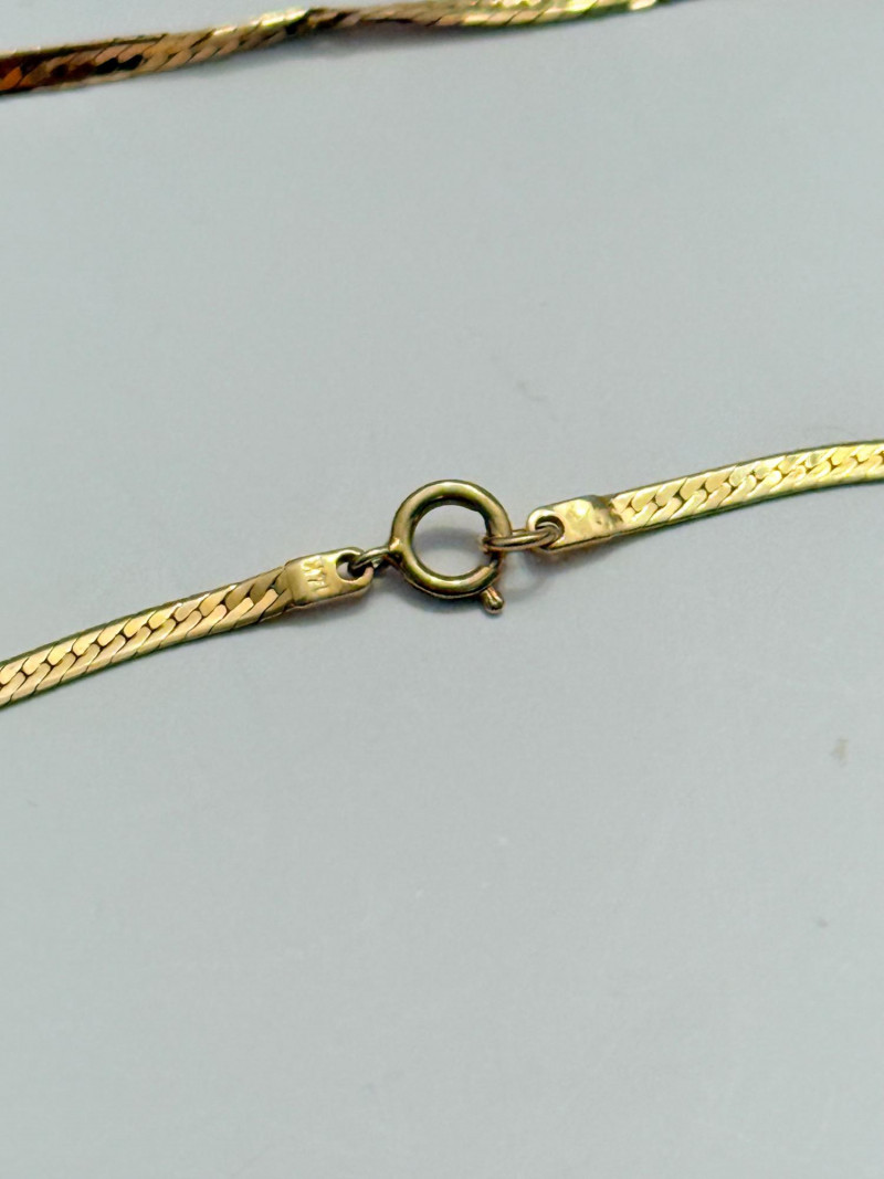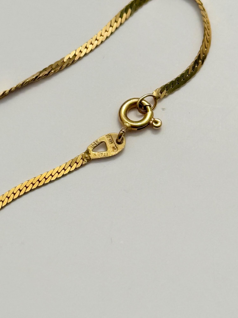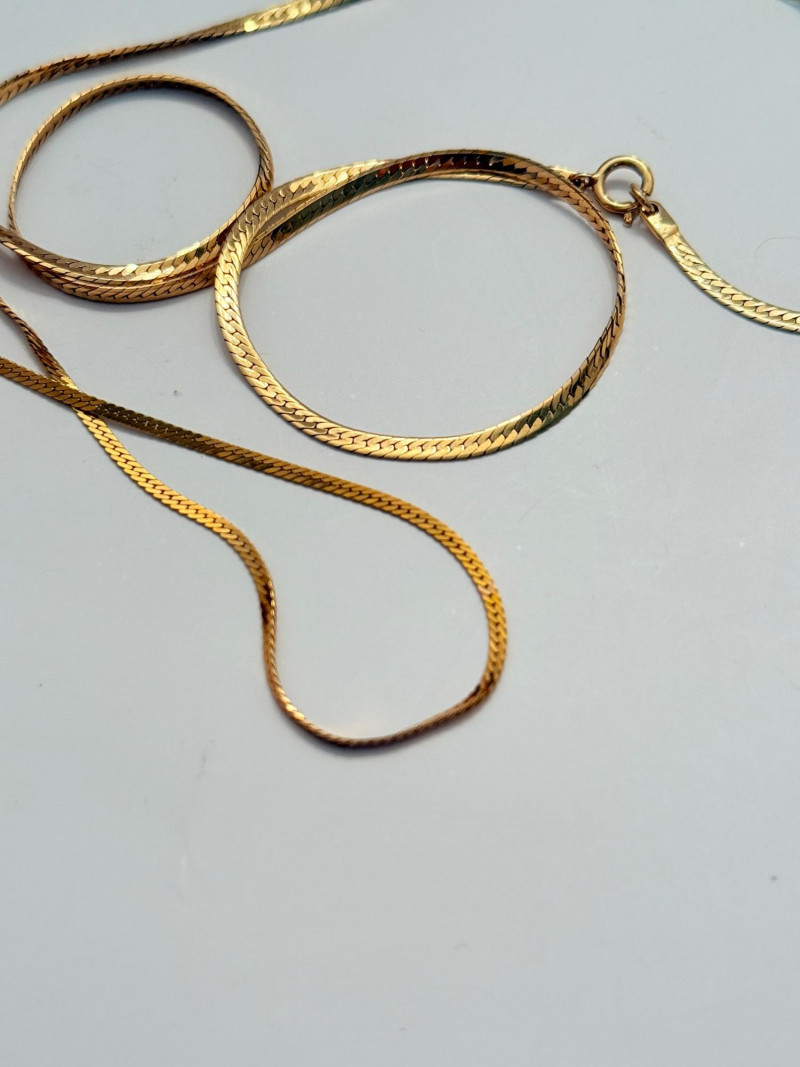 14k Gold Necklace and Bracelet Set – Italian Herringbone Elegance A beautifully matched set featuring fine flat herringbone chains, both stamped 14k Italy, showcasing classic craftsmanship and timeless style. Each piece is secured with a spring ring clasp for ease and durability. Necklace Length: 18 inches Bracelet Length: 7 inches Total Weight: 6.3 grams Gold Purity: 14k Origin: Italy Style: Flat herringbone chain Clasp Type: Spring ring