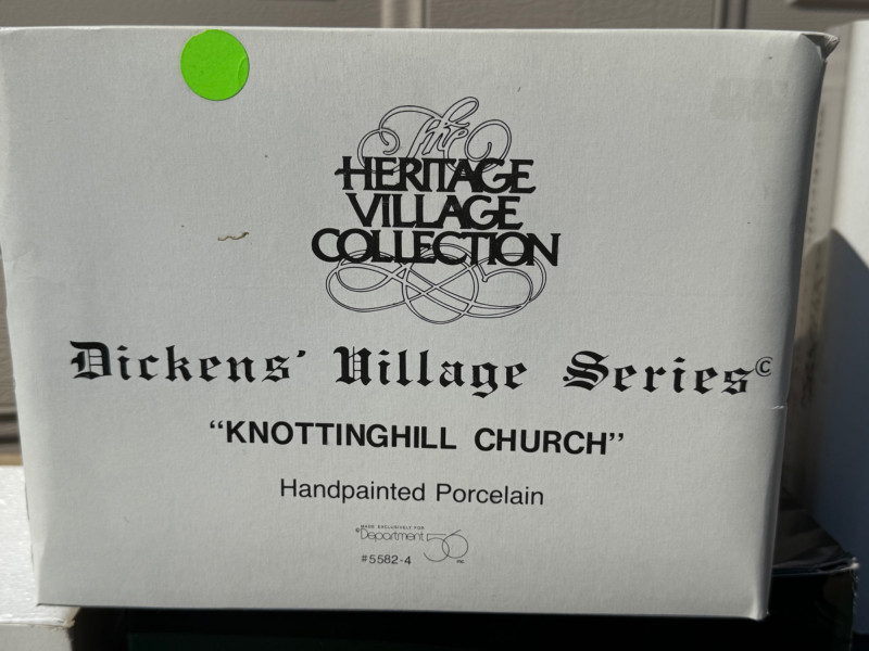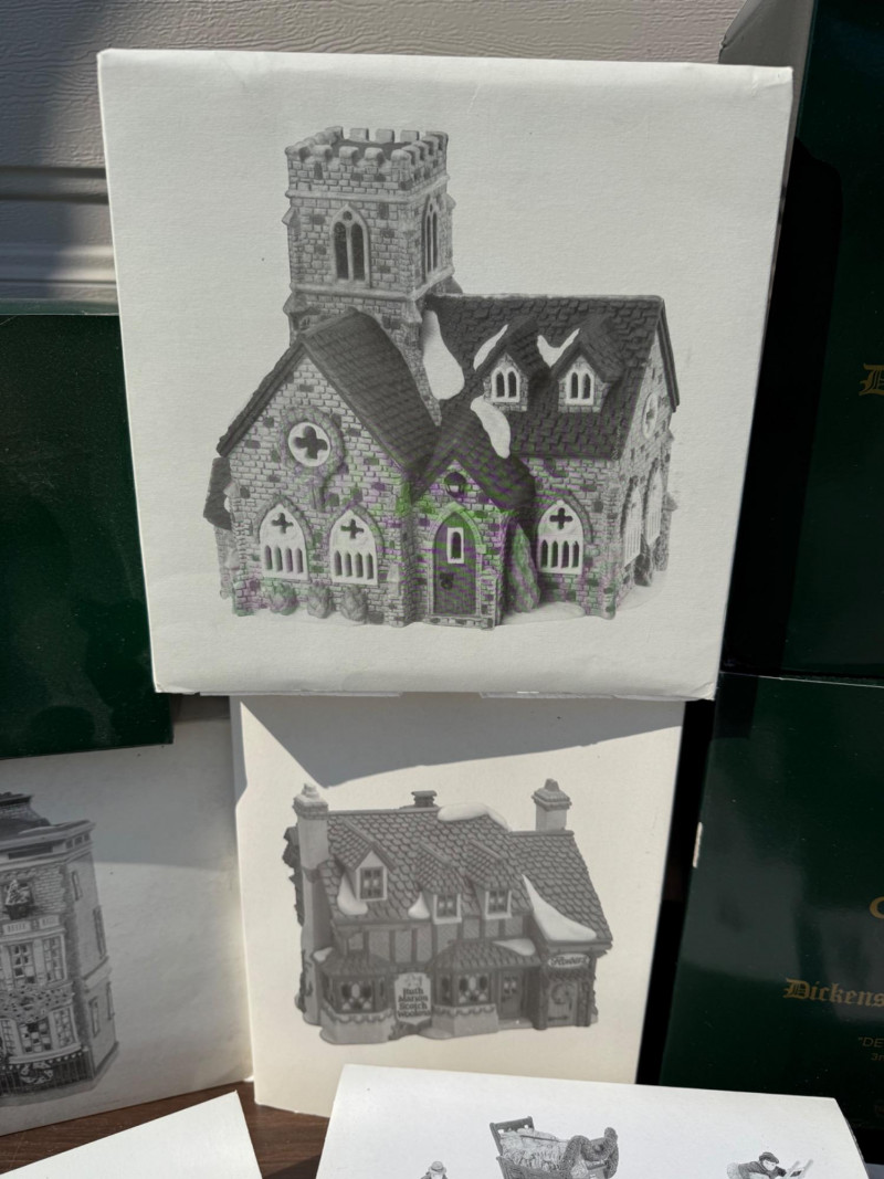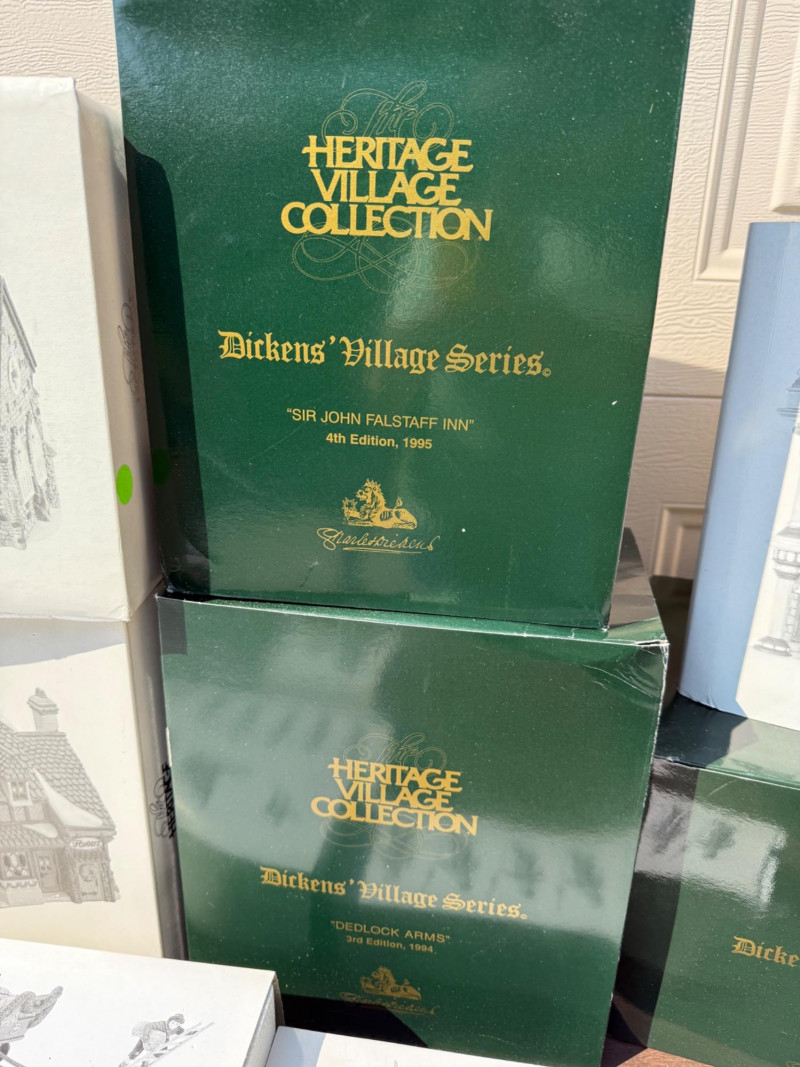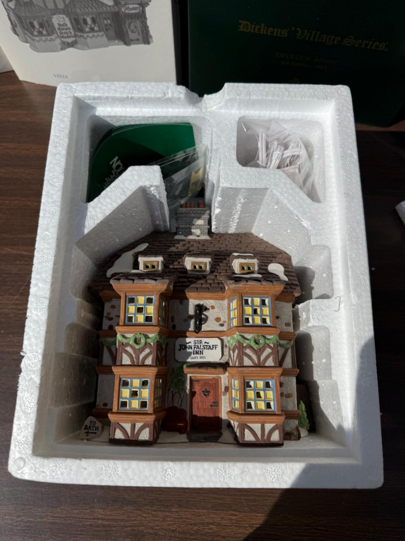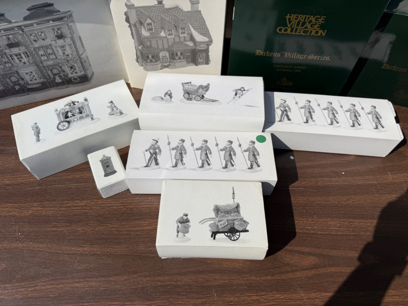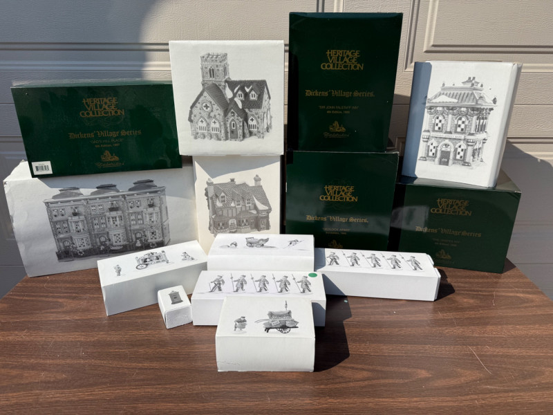 A collection of hand-painted porcelain buildings and accessories from the Department 56 Dickens’ Village Series, part of the Heritage Village Collection. Includes boxed village houses and figurine sets, each with original packaging. Set Includes: Knottinghill Church Sir John Falstaff Inn (4th Edition, 1995) Dedlock Arms (3rd Edition, 1994) Assorted Dickens’ Village Buildings (various boxed houses, including multi-story town buildings and Tudor-style cottages) Accessory Figurines and Carts (boxed, with villagers, children, and market scenes) Features: Hand-painted porcelain Includes original boxes and protective styrofoam inserts Multiple editions from the mid-1990s Mix of large buildings, small cottages, and character accessory sets