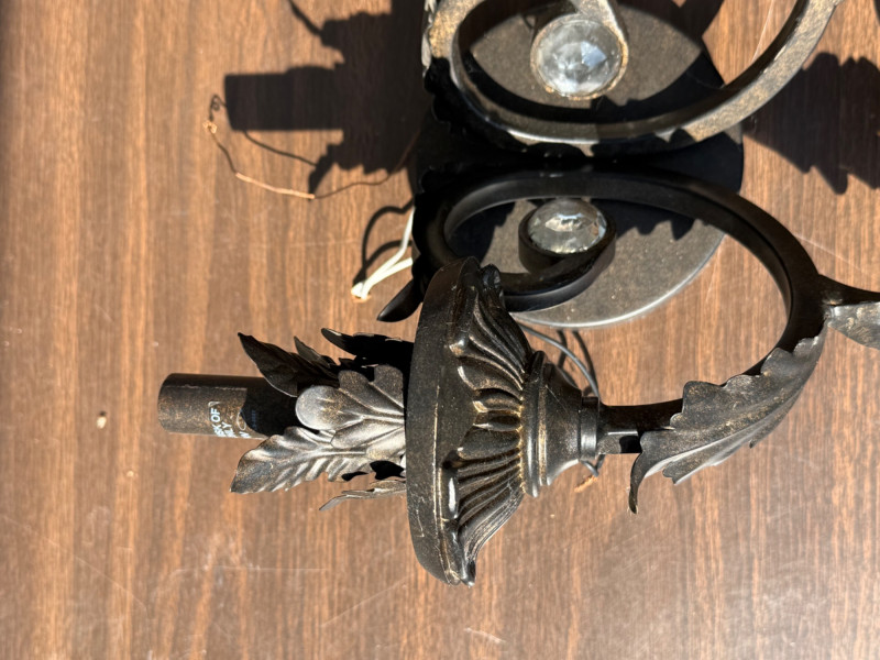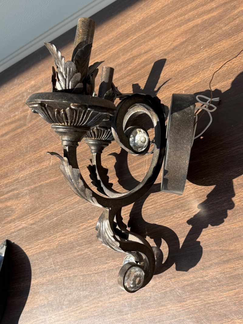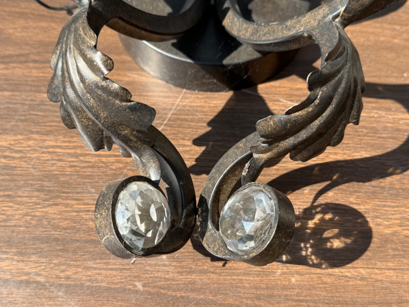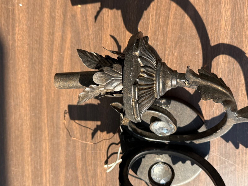 UL-listed and intended for wall mounting with standard hardwiring. Dimensions: 13" W × 15" H × 8" D Finish: Deep bronze with a vintage patina Design: Each sconce features two gracefully curved arms adorned with leaf-motif detailing, culminating in faceted crystal round accents that catch and reflect light beautifully. The symmetrical layout and sculptural form evoke classic European elegance. Functionality: UL-listed and designed for electric lighting. Standard hardwiring required. Suitable for indoor use. Style Notes: A timeless pair that blends ornate craftsmanship with subtle sparkle. Ideal for traditional interiors, vintage-themed spaces, or as statement lighting in entryways and formal rooms. Their rich finish and crystal embellishments offer a warm, ambient glow and a touch of sophistication.Pair of Ornate Metal Wall Sconces with Crystal Accents