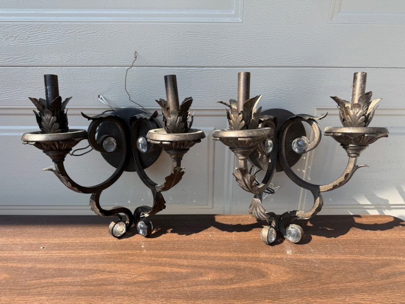 A matching pair of decorative metal wall sconces, each with two arms and leaf-motif detailing. The sconces feature crystal round accents at the base and are designed for electric lighting. Dark finish with a vintage-inspired style.