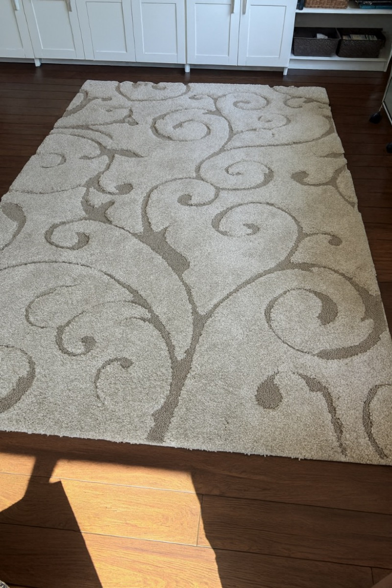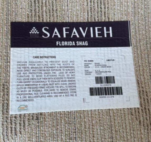 A soft and stylish shag rug from Safavieh’s Florida Shag Collection, offering comfort underfoot with a modern swirl pattern in neutral tones. Brand: Safavieh Collection: Florida Shag Design Number: SG455 Color: 113 – Cream/Beige Size: 6 ft x 9 ft Material: 100% Polypropylene pile Origin: Turkey Condition: Clean, good condition Plush, textured pile with swirl motif in cream and beige Durable polypropylene construction designed for long-lasting use Power-loomed for consistent quality Suitable for high-traffic areas while adding warmth and style Vacuum regularly to prevent dust and crumbs from settling into fibers (brushless attachment recommended) Use rug protectors under heavy furniture to avoid flattening Blot spills immediately with a clean, undyed cloth Professional cleaning recommended for hard-to-remove stains Use of a rug pad is recommendedSafavieh Florida Shag Area Rug – Cream/Beige