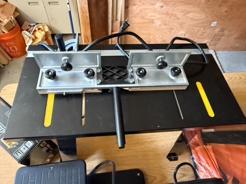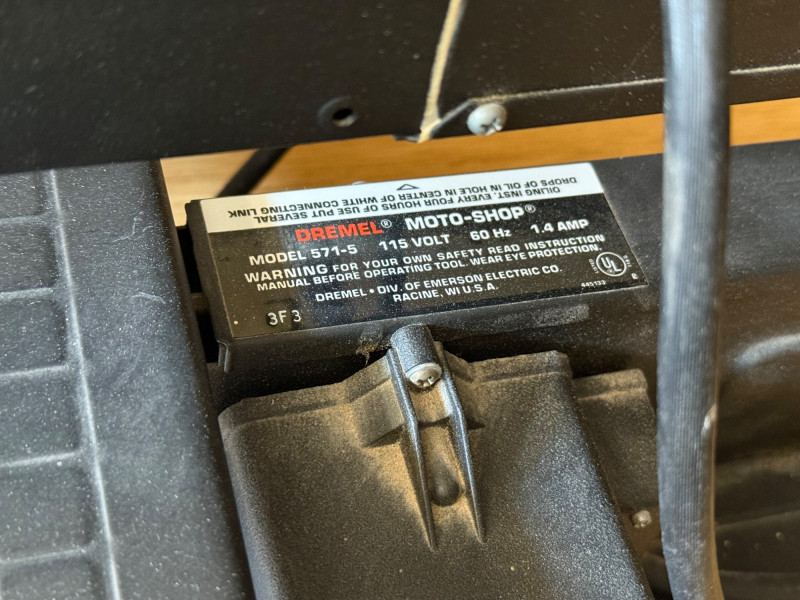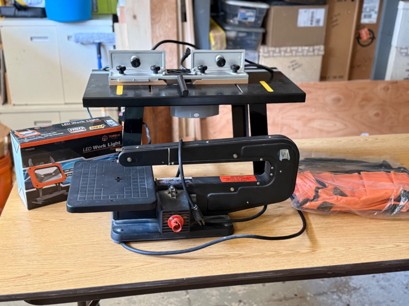 Dremel Moto Saw, Ryobi Router Table, Work Light and Tool Bag Dremel Moto-Shop Scroll Saw (Model 571-5) Tabletop scroll saw with adjustable work surface Corded power (115V, 1.4 Amp) for consistent performance Suitable for precision cuts in wood, plastic, and soft metals Ryobi Router Table (Model RT100) Compact benchtop design with safety power switch Adjustable fence guides for accurate routing Compatible with most standard routers (designed for Ryobi R161) Torelli LED Work Light (Model INV00505) Boxed, portable LED flood light (1150+ lumens) Bright wide-angle SMD LED technology for task illumination Easy to position, plug-in design for instant use Tool Bag Heavy-duty orange and black zippered carrying case Spacious interior with reinforced handles Keeps tools organized and easy to transportWorkshop Tool Set Highlights:
