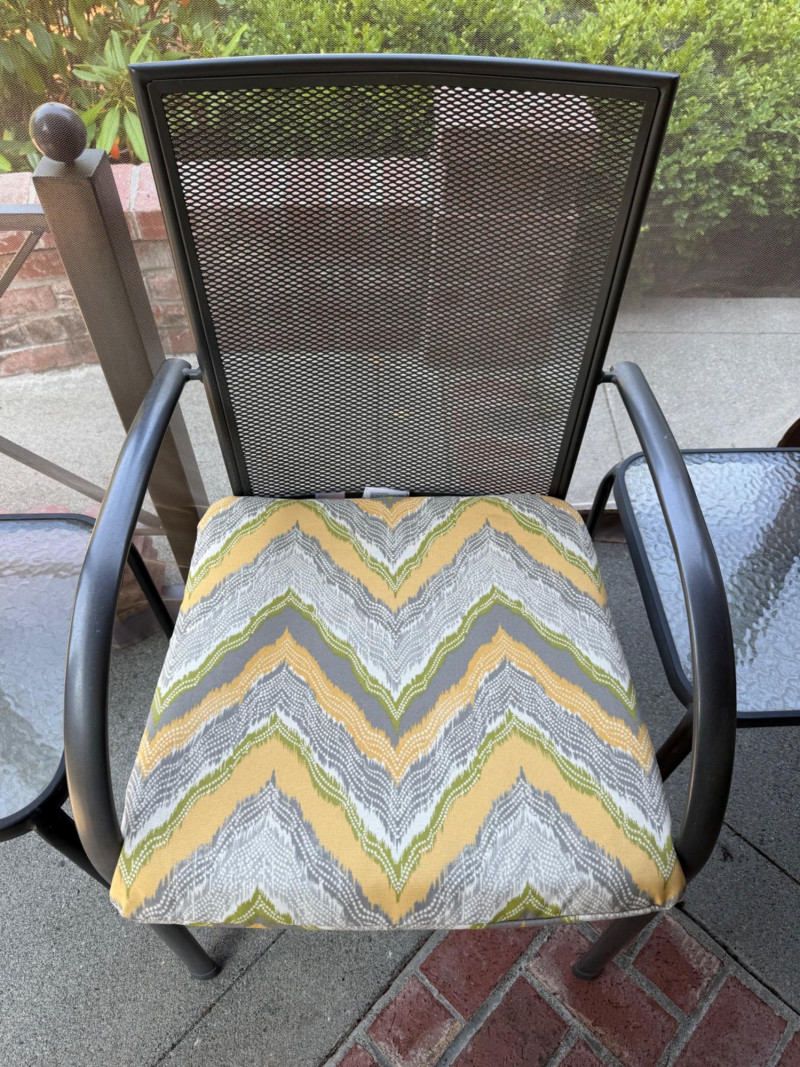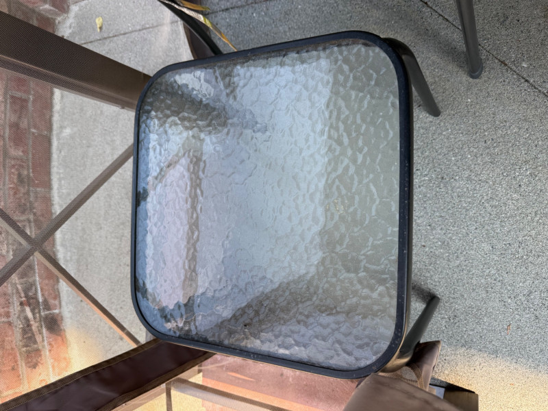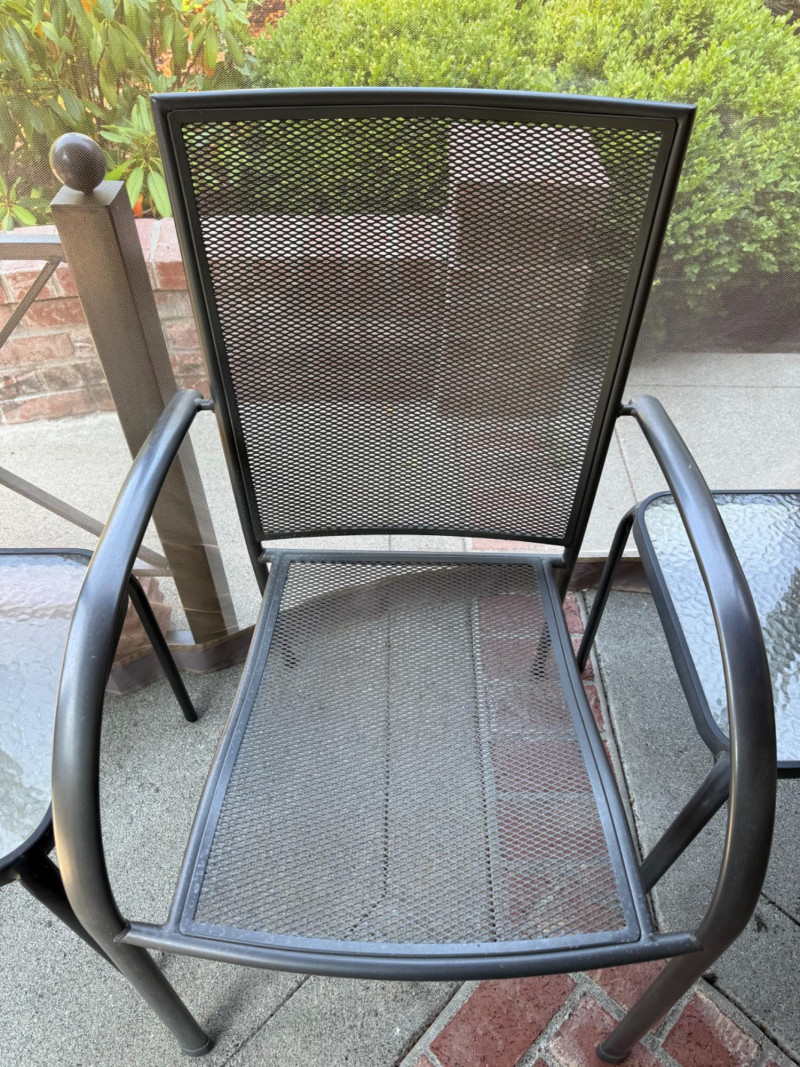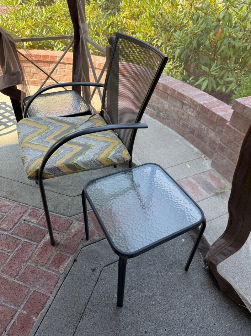 Upgrade your outdoor space with this stylish and durable patio set, perfect for relaxing or entertaining guests. Set Includes: 1 Metal Patio Chair Sturdy frame with mesh back and arms Vibrant chevron-pattern cushion for added comfort Dimensions: 35” H × 21.5” W × 21” D Seat Height: 18” H 2 Square Side Tables Metal base with tempered glass tops Dimensions: 16.5” H × 16” WMetal Patio Chair & Tempered Glass Side Tables – Outdoor Set