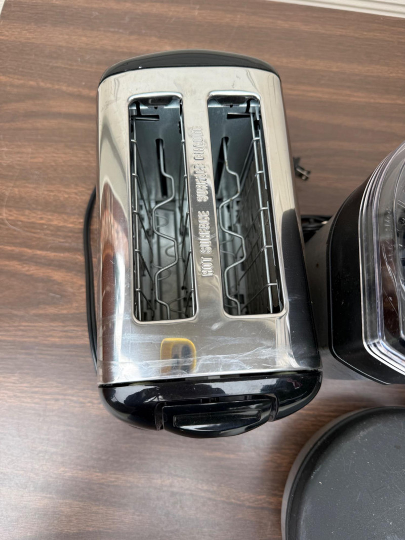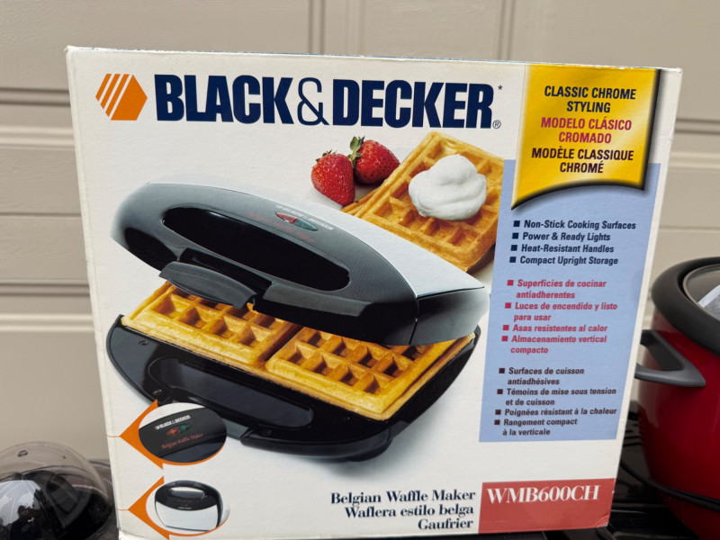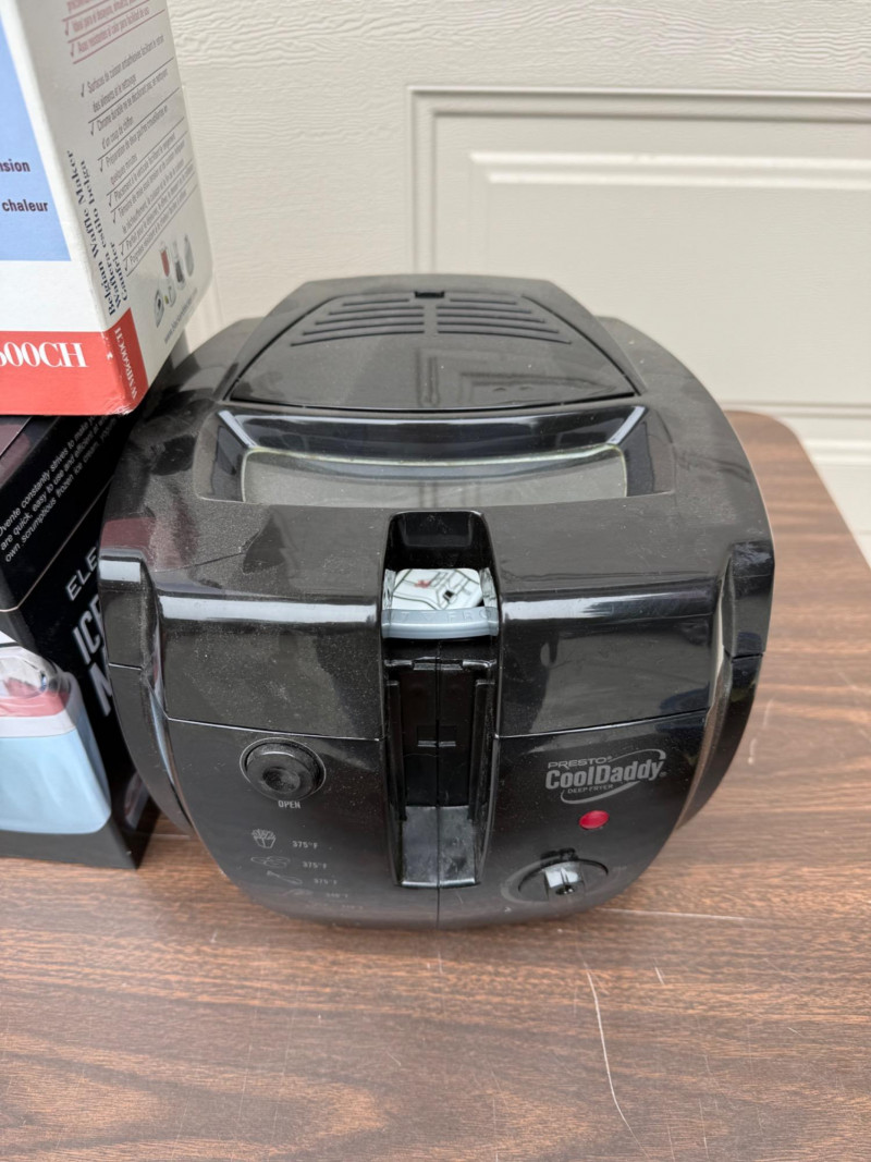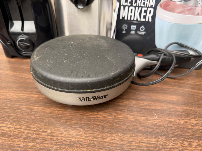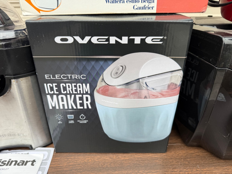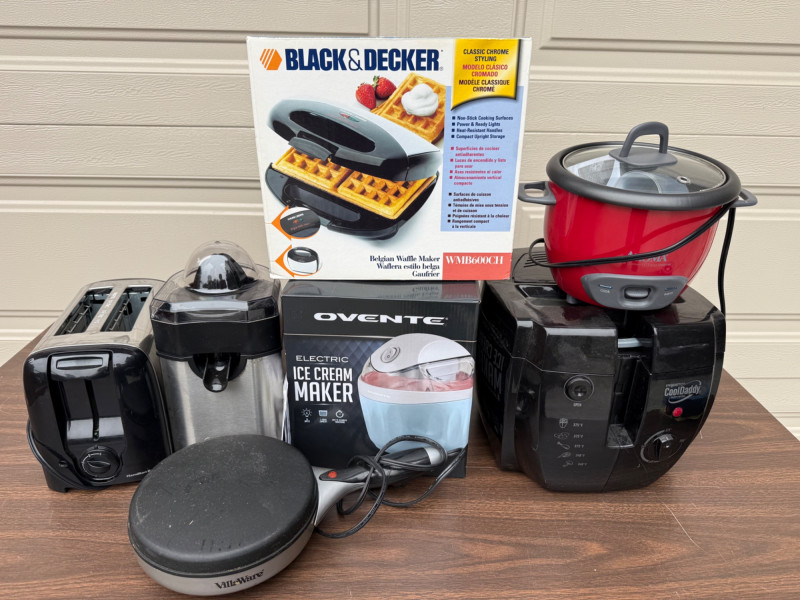 Kitchen Appliances – Toaster, Rice Cooker, Ice Cream Maker & More A mixed lot of kitchen appliances including: Black & Decker Belgian Waffle Maker (Model WMB600CH) – New in box Ovente Electric Ice Cream Maker – New in box Aroma Rice Cooker Presto CoolDaddy Deep Fryer Cuisinart Juicer VillaWare Appliance (likely pizzelle/mini maker) 2-Slice Toaster Condition: Ice cream maker and waffle maker are new in original boxes. All other appliances have been plugged in and power on.