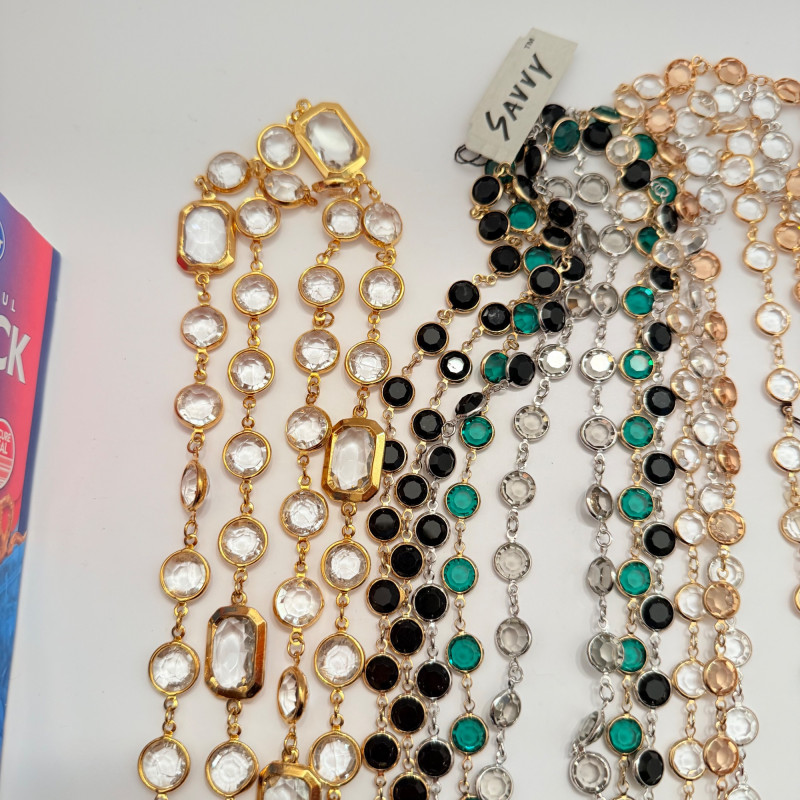 A must-have set for any jewelry lover—this collection of multi-color Swarovski crystal necklaces and coordinating bracelet by Savvy offers timeless sparkle and versatile elegance. Each necklace features bezel-set faceted crystals in gold-tone or silver-tone settings. The set includes necklaces in black, clear, green, blue, red, and multi-color designs, along with a coordinating bracelet. Dimensions: