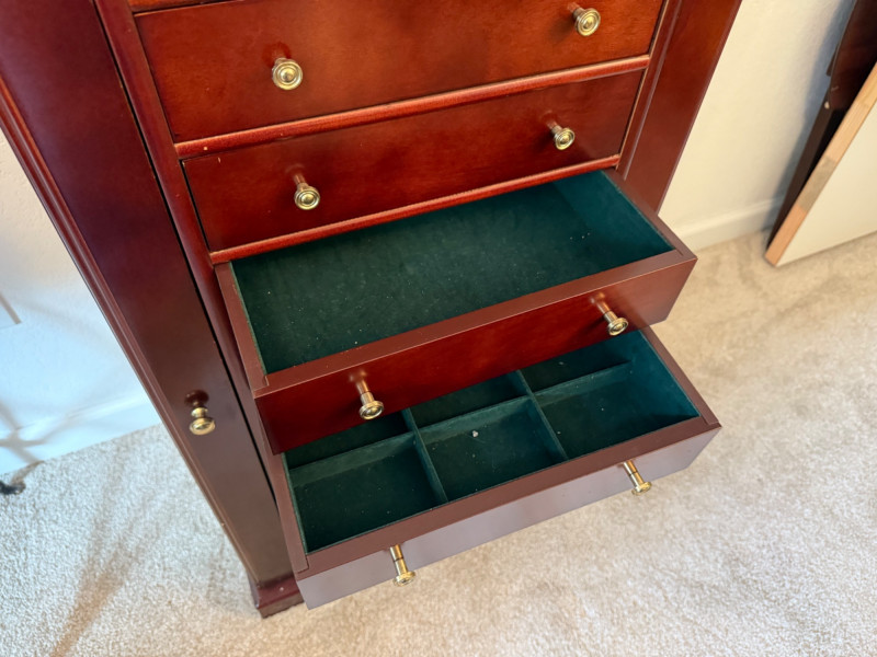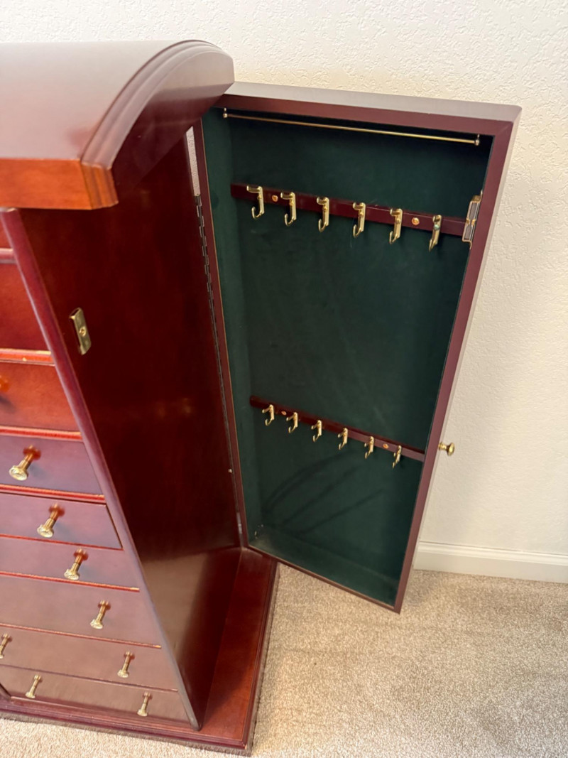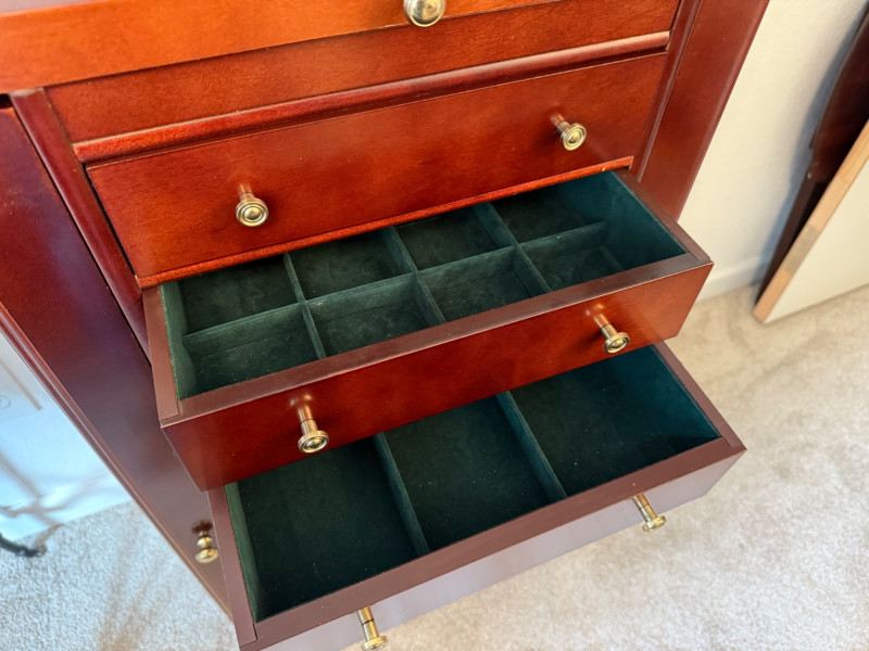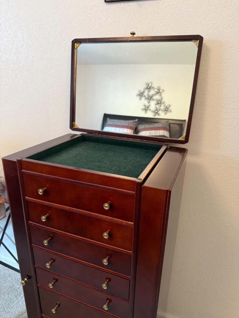 Mahogany Finish Jewelry Armoire with Mirror Bring classic sophistication to your room with this tall-standing jewelry armoire, crafted in a rich mahogany finish and designed to combine elegance with everyday functionality. This timeless piece features: Seven spacious drawers with a mix of divided and open compartments, all lined in dark green felt to protect and organize your jewelry Two side doors that open to reveal necklace hooks, also felt-lined for a coordinated look Lift-top lid with an inset mirror and additional storage compartments—ideal for quick access to your favorite pieces Brass-tone pulls and knobs that add vintage charm to the polished woodwork Dimensions: 18" W × 39" H × 13" D