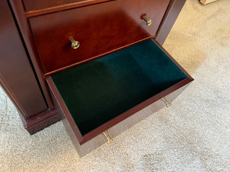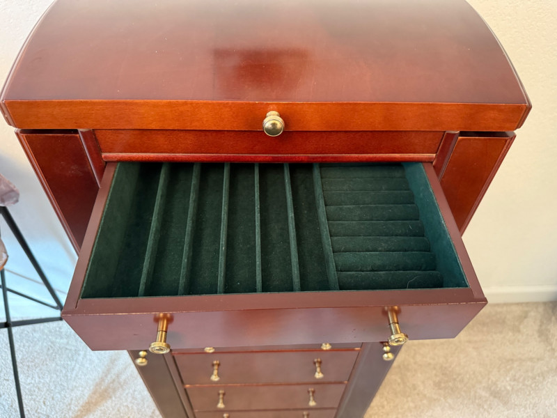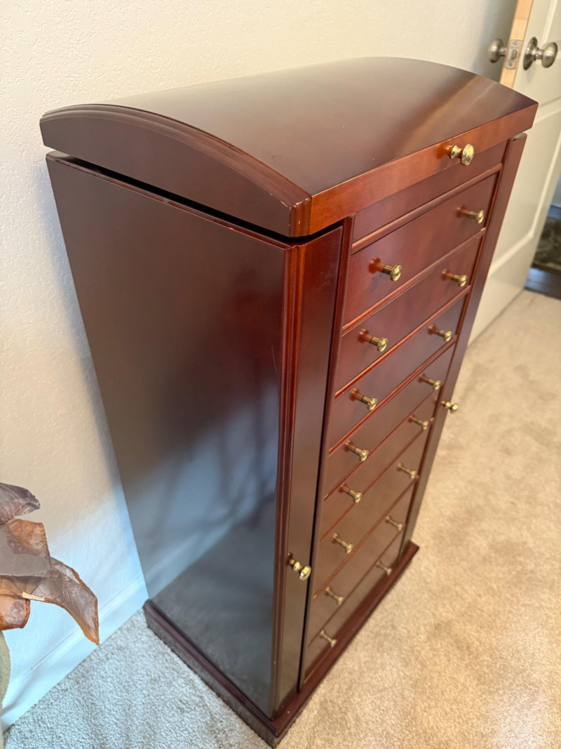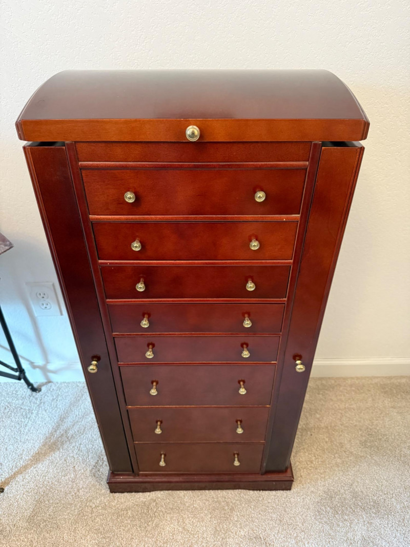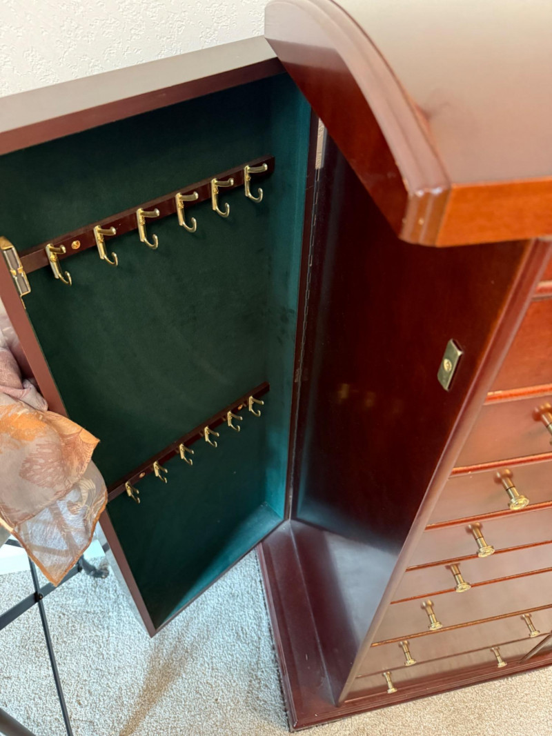 Mahogany Finish Jewelry Armoire with Mirror Bring classic sophistication to your room with this tall-standing jewelry armoire, crafted in a rich mahogany finish and designed to combine elegance with everyday functionality. This timeless piece features: Seven spacious drawers with a mix of divided and open compartments, all lined in dark green felt to protect and organize your jewelry Two side doors that open to reveal necklace hooks, also felt-lined for a coordinated look Lift-top lid with an inset mirror and additional storage compartments—ideal for quick access to your favorite pieces Brass-tone pulls and knobs that add vintage charm to the polished woodwork Dimensions: 18" W × 39" H × 13" D