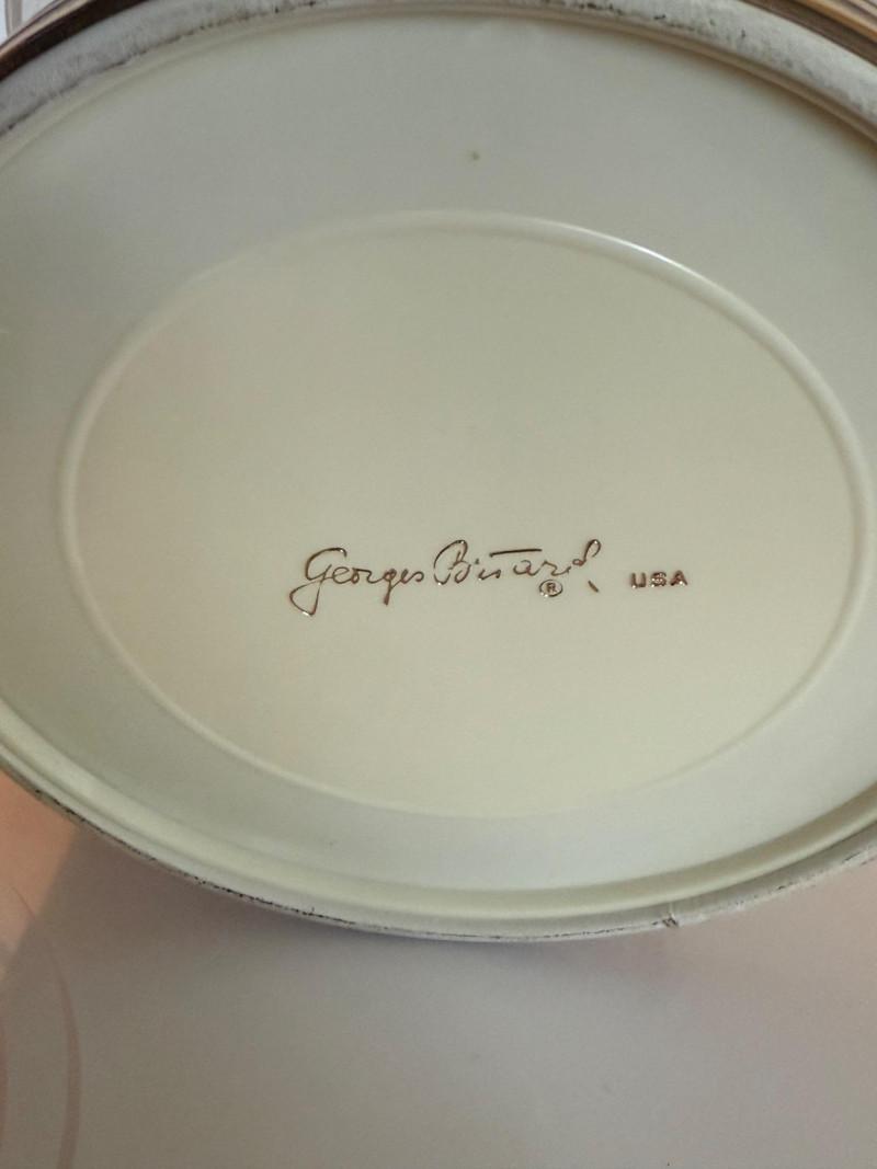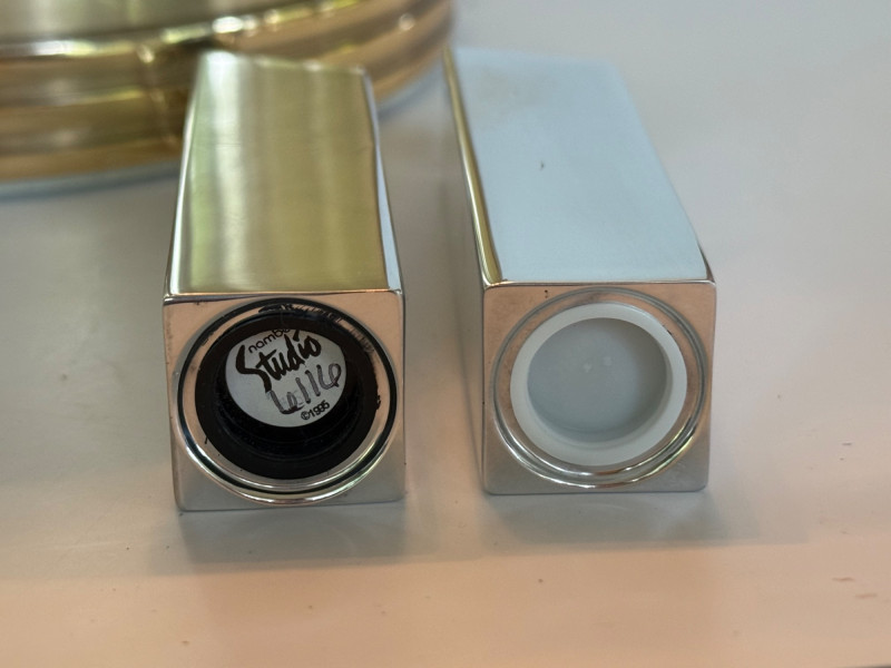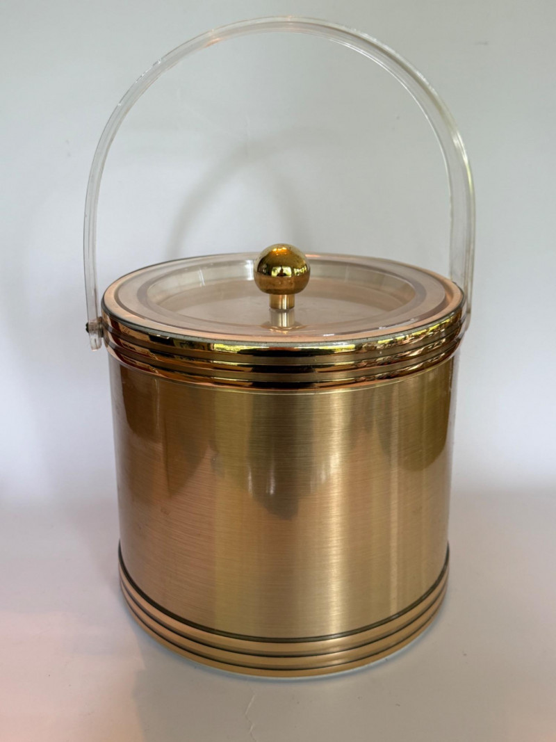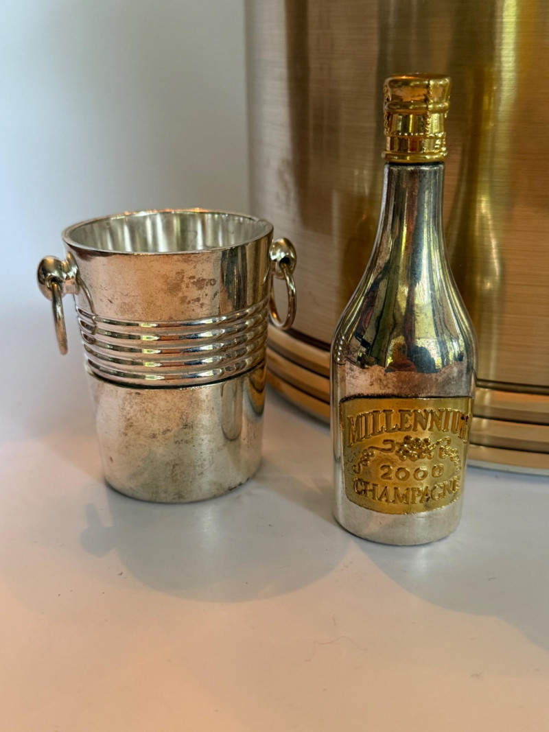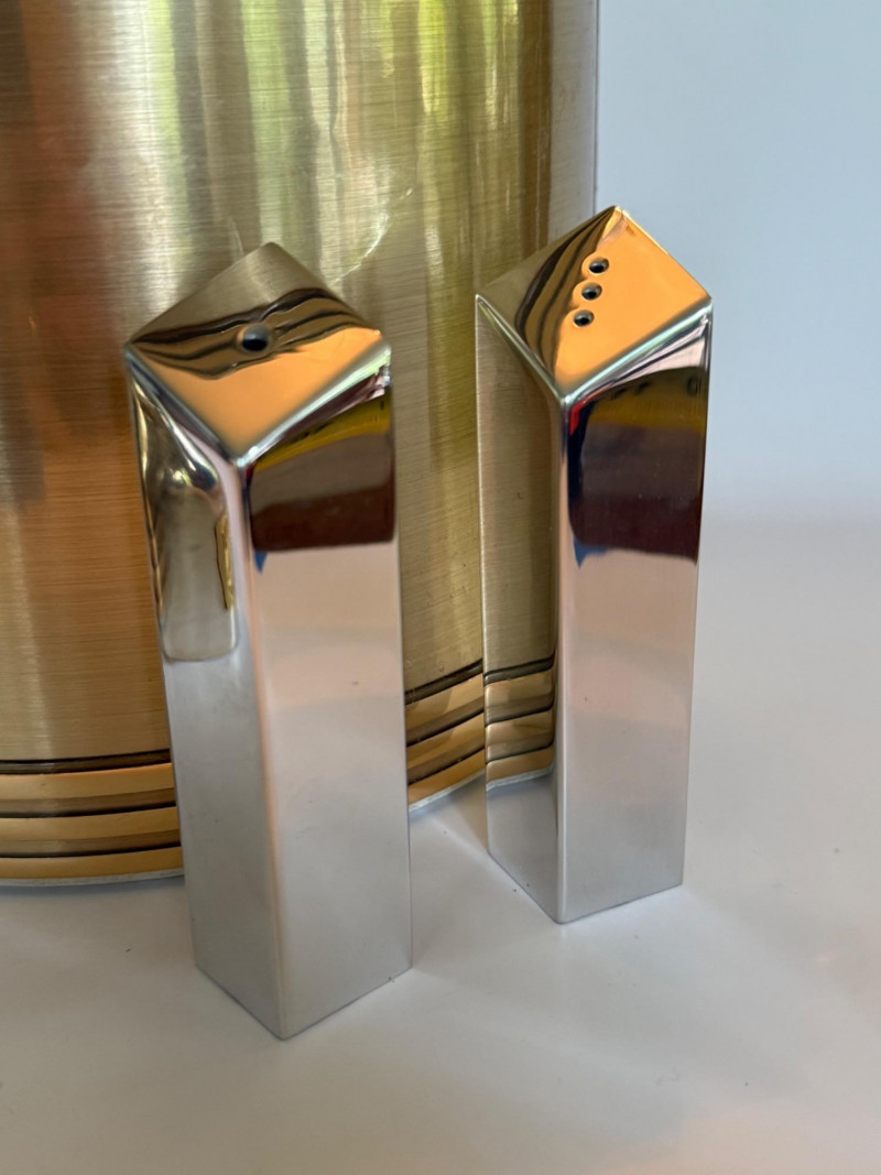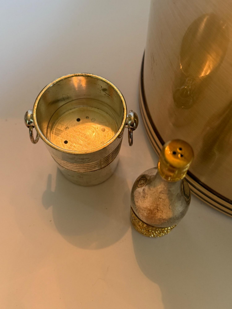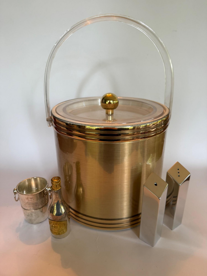 George Briard Ice Bucket with Nambe Studio Salt & Pepper Shakers A mid-century modern barware collection that blends form and function. The centerpiece is a George Briard USA ice bucket in brushed gold-tone, featuring a clear acrylic handle and lid, topped with a round gold knob. The interior is white insulated plastic, ideal for keeping ice chilled. Complementing the bucket is a boxed set of Nambe Studio salt and pepper shakers, crafted in polished square chrome-tone metal, complete with original box and bottom label. The set is rounded out with two charming accessories: a miniature silver-tone ice bucket with side handles and a Millennium 2000 commemorative champagne bottle in silver-tone with a gold label. George Briard gold-tone ice bucket, signed on base Pair of Nambe Studio salt and pepper shakers