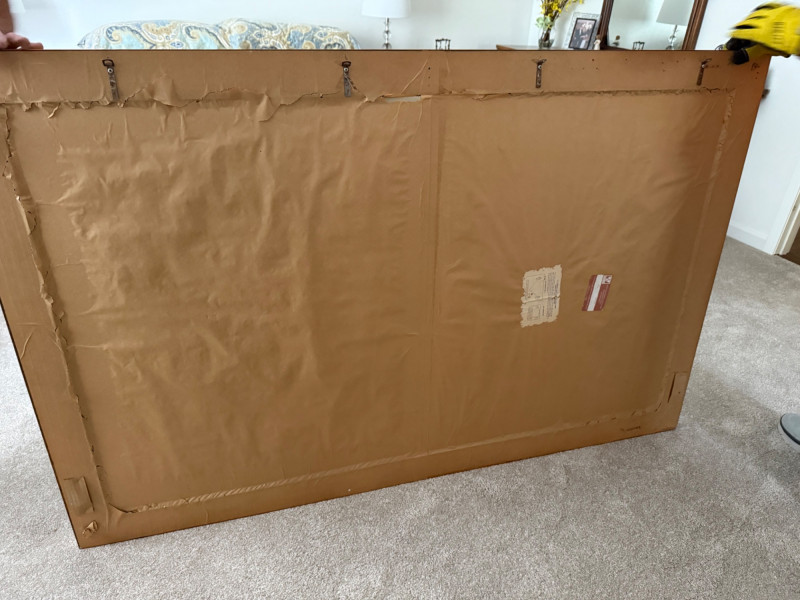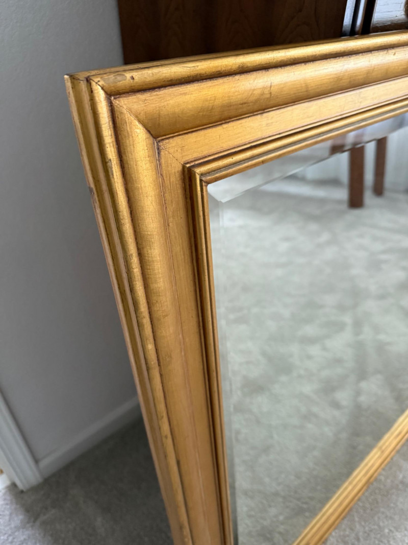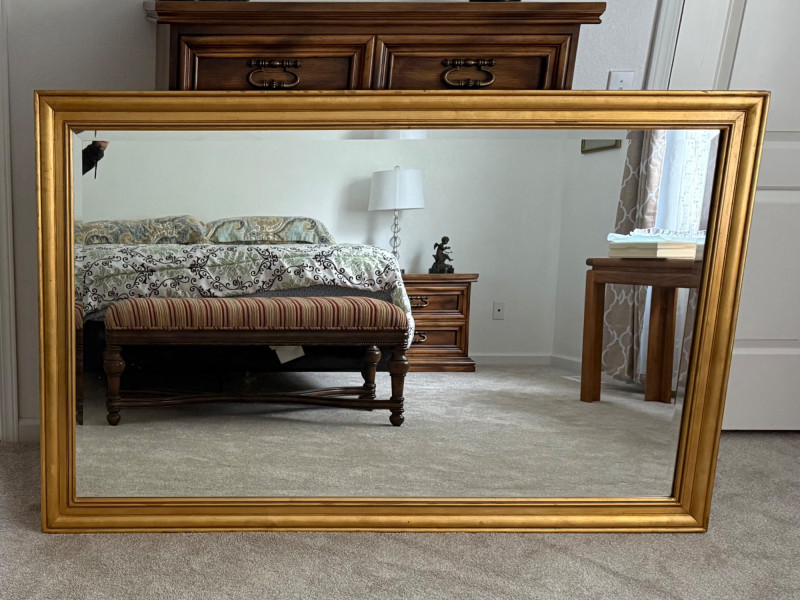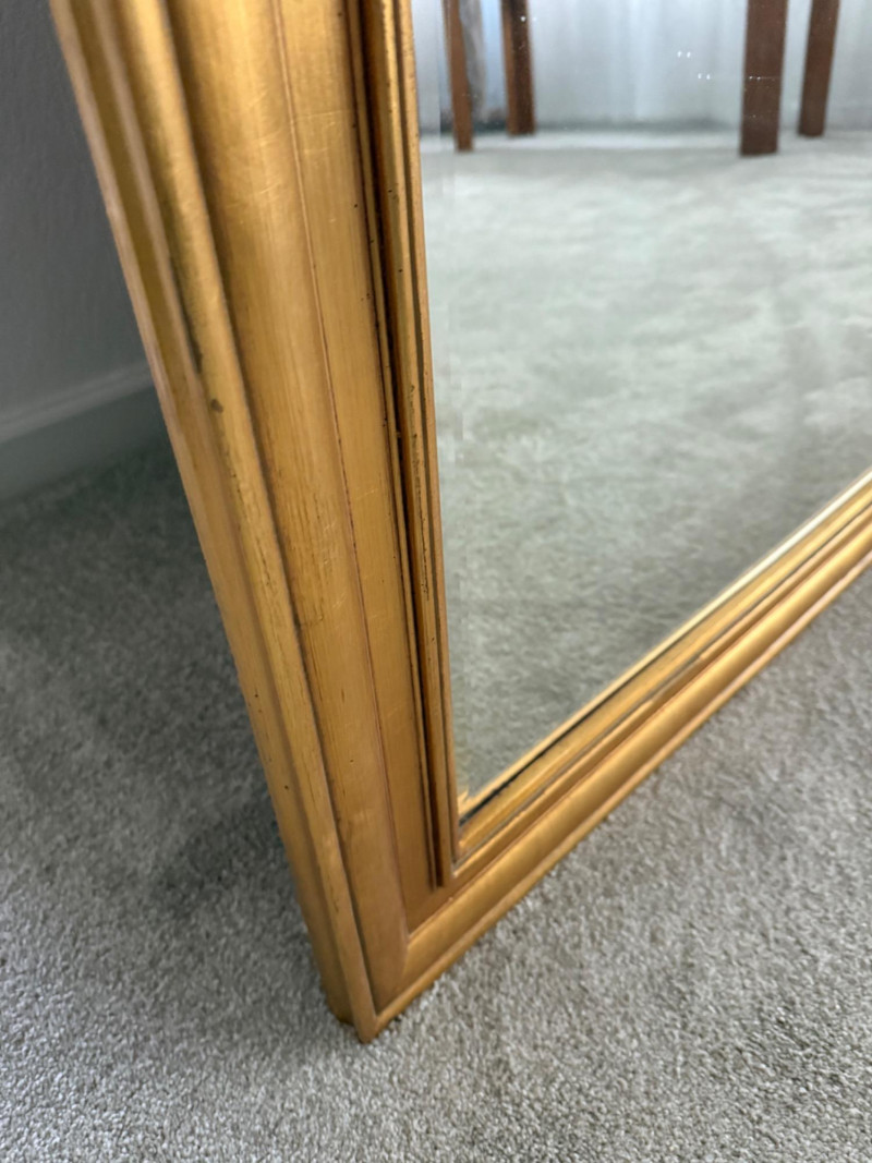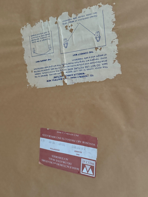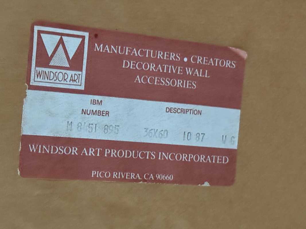 Dimensions: 66.5" W × 42.4" H Features: Frame: Gold-toned rectangular frame with beveled molding, emblematic of late 1980s–early 1990s traditional home décor Mirror: Large, clear beveled glass that enhances light and space Back: Retains original Windsor Art label and hanging instructions This substantial wall mirror by Windsor Art Products Inc. is a classic example of mass-produced decorative art from the late 20th century. During the 1980s and early 1990s, Windsor Art mirrors and framed prints were widely available in department stores and home furnishing retailers, offering accessible elegance to American households. Handling Note: