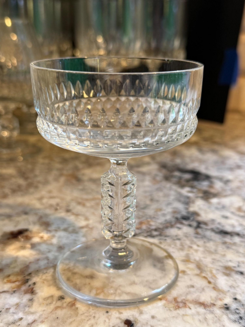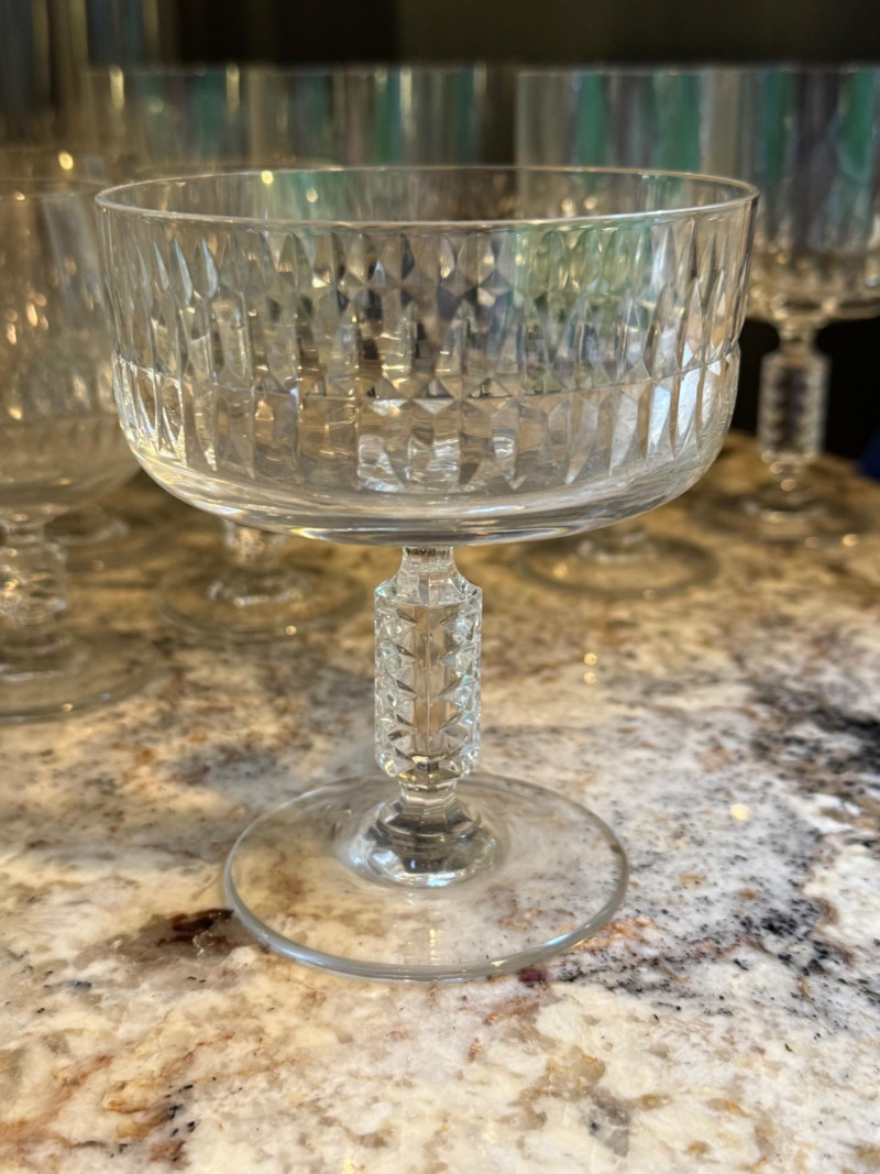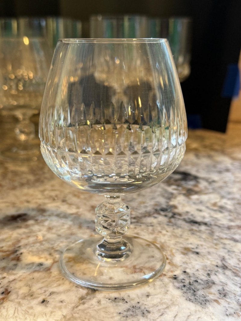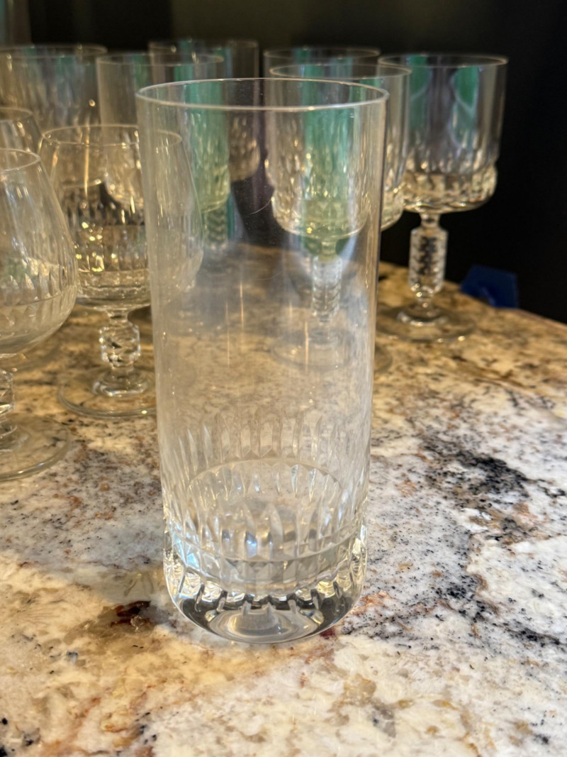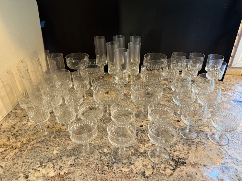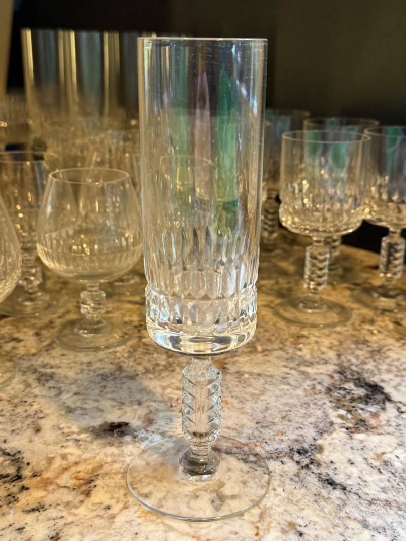 Vintage Schott Zwiesel Crystal Stemware Set — 42 Pieces A refined 42-piece vintage crystal stemware collection by Schott Zwiesel, renowned for its faceted stems and diamond-cut style bowls. This distinguished assortment includes goblets, wine glasses, coupes, brandy snifters, and tumblers. Each piece reflects timeless sophistication and exceptional craftsmanship, ideal for both elegant entertaining and curated display. Dimensions: ranging from 4 to 8" tall Founded in 1872 in Zwiesel, Germany, Schott Zwiesel is internationally acclaimed for its innovation in crystal glassmaking. Their glassware is celebrated for its brilliance, durability, and graceful design—favored by fine dining establishments and discerning collectors. A rare opportunity to acquire a complete and cohesive set that embodies heritage, artistry, and enduring style.About the Maker: