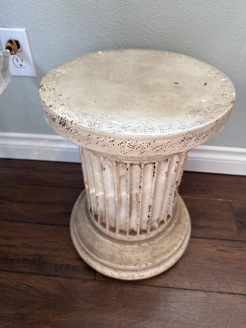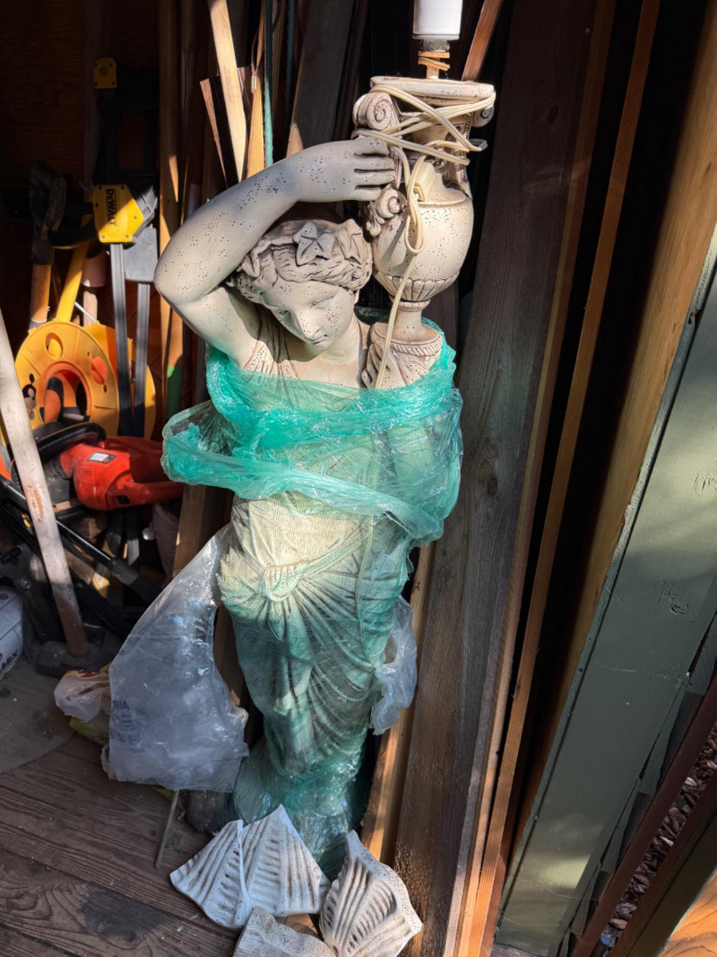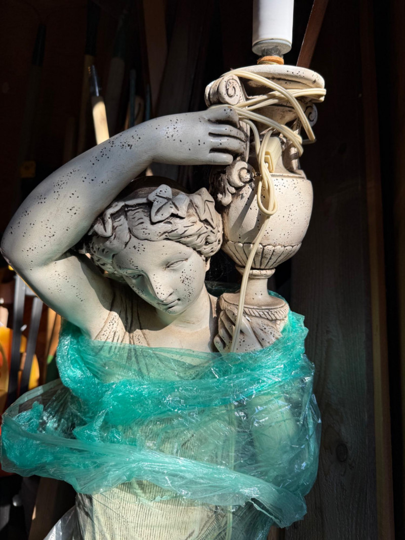 Neoclassical Lady Figural Lamp with Pedestal Base This tall decorative lamp features a neoclassical-style female figure draped in flowing robes, holding an urn aloft that serves as the lamp base. The design reflects Greco-Roman revival aesthetics, often popular in mid-20th-century figural lamps. The piece originally included a matching pedestal-style base and a large globe-shaped glass shade Condition Note: