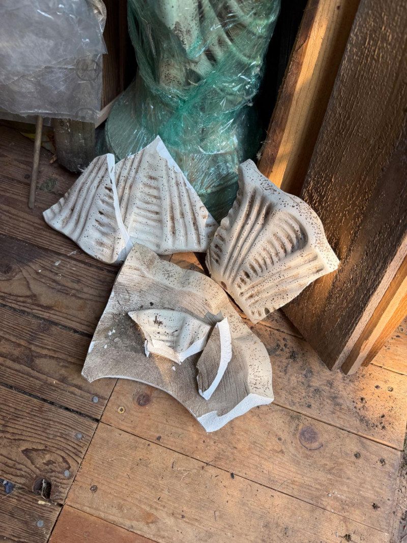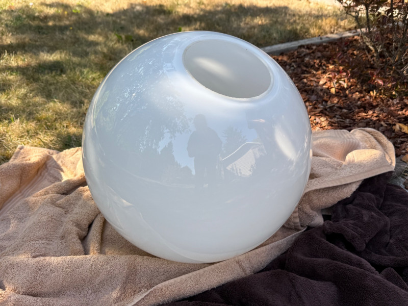 The decorative base under the glass globe has broken into several pieces. Most fragments are present, and the piece could be repaired. Despite this damage, the lamp retains its sculptural beauty and collectible charm.